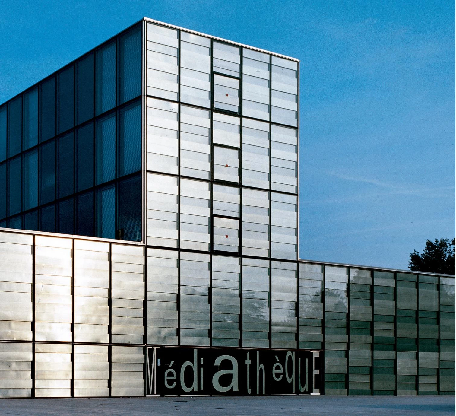 The entire construction is compact and treated with different ‘rough’ materials: bare concrete, cement floors, galvanized steel structure, frosted and clear glass. Energy-saving results from the thickness of the building, which gives it excellent inertia and allows for thermal exchange between interdependent premises. This is also obtained through the double-skin enclosure produced by the gallery, which isolates the workings from the external atmosphere by acting as a thermal and sound buffer. Its facades are composed of narrow glass cases into which sheets of perforated metal are slipped. These fragments of sheet metal, slightly set back in places, play with the light and the reflections of the surrounding landscape. From the exterior, the library seems turned inward, whereas on the inside, it is flooded with light and open to its neighboring environment.