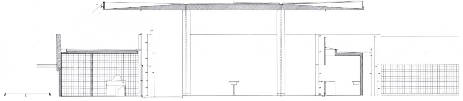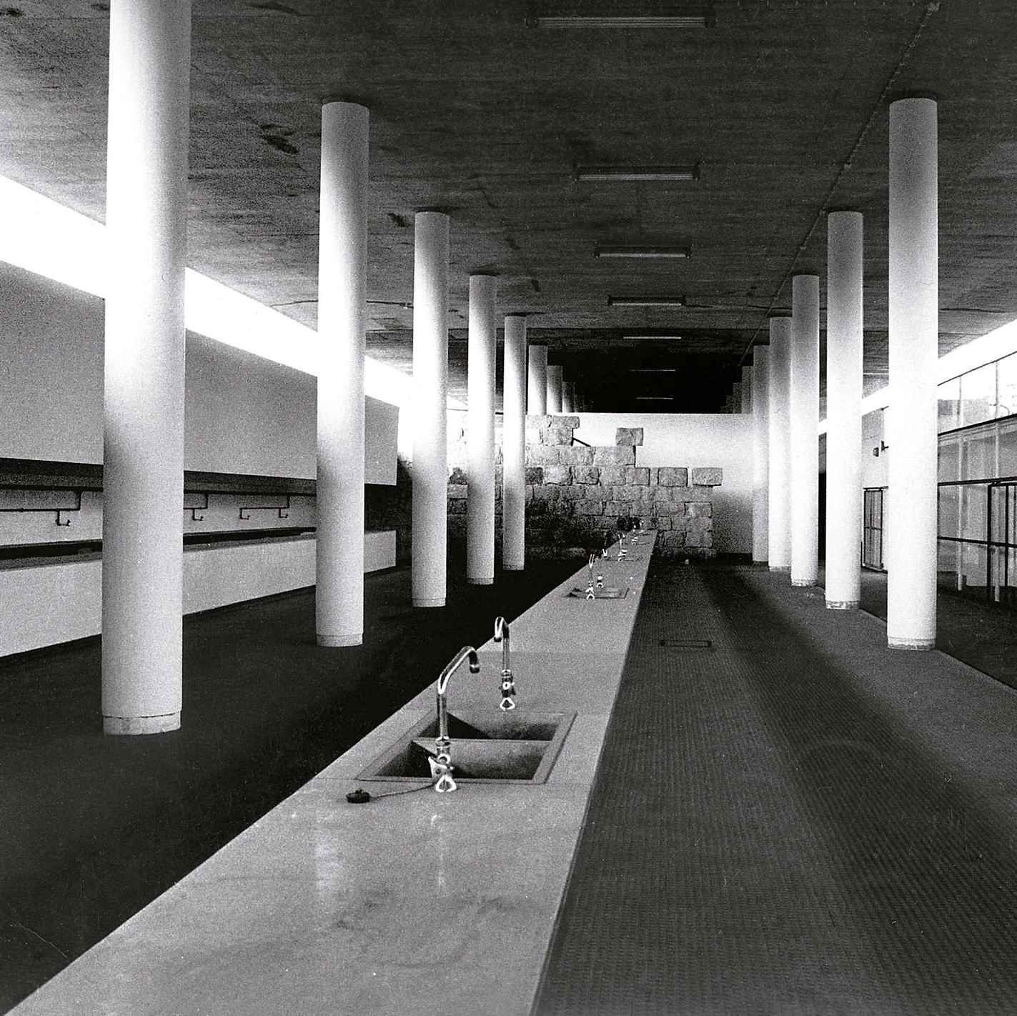 An old farm on a hill, close to the center of Braga, was the terrain chosen for the construction of the Municipal Market of Carandá: a linear building whose footprint rested on two perpendicular paths that linked the complex with the city, occupying their intersection. The concept of the project was to create a covered street, a fragment of city able to propose an urban mesh. To accomplish this, the building was organized through a regular pattern of columns on which the concrete slab of the roof was located, rising above the side walls.