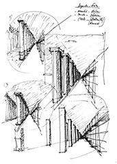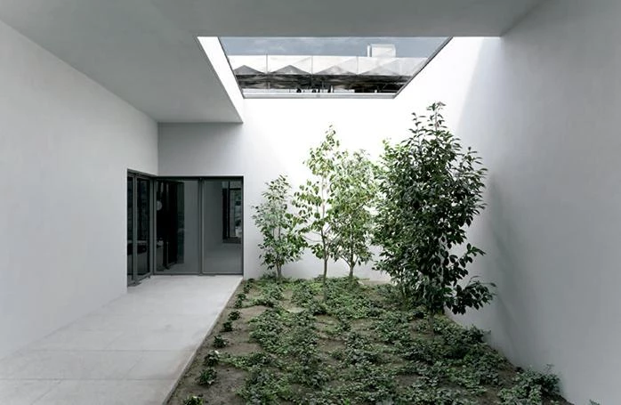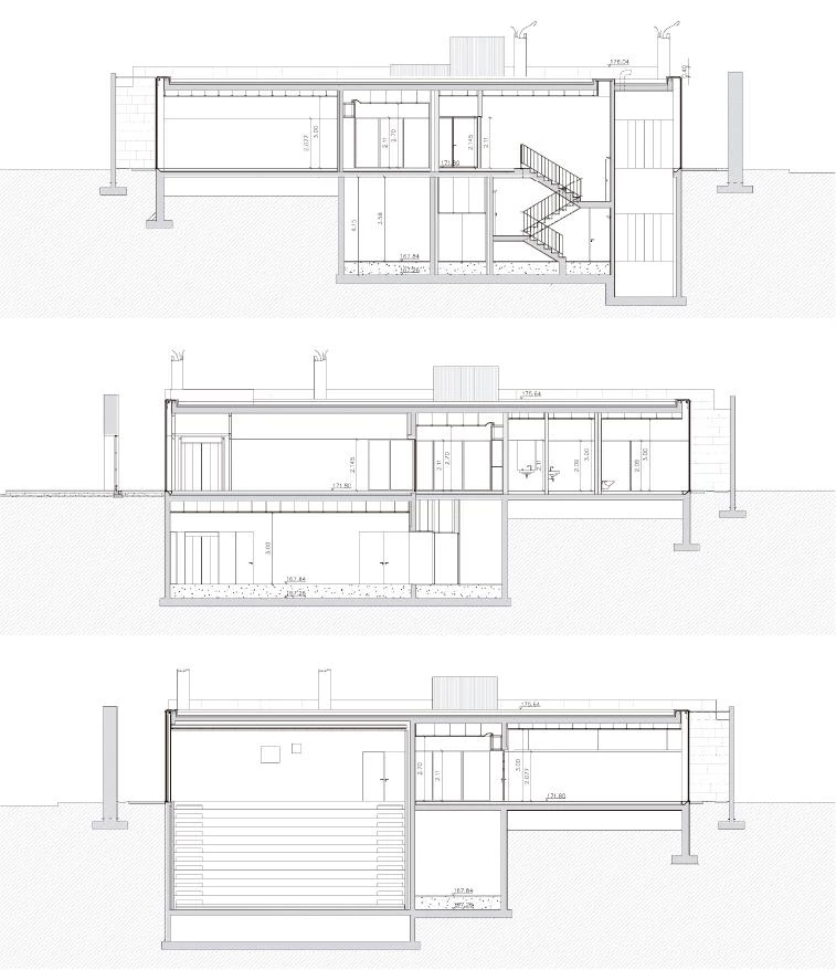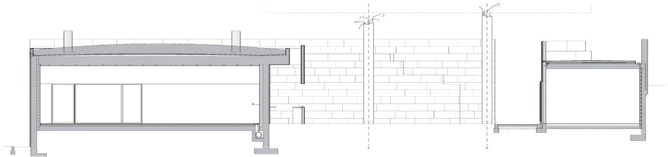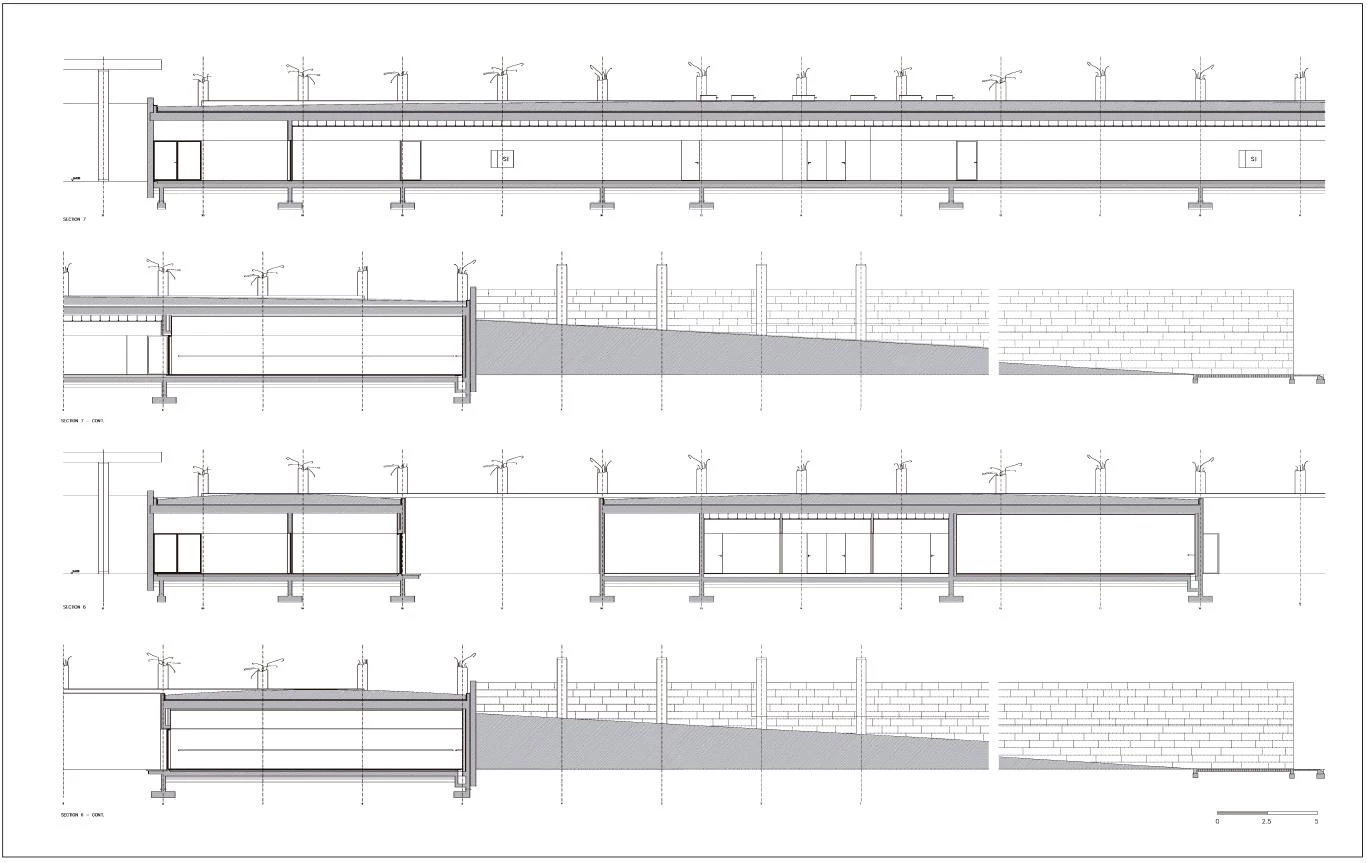 The dance school takes up the old fruit and vegetable stalls inverting the solid and void spaces. The roof slab was demolished, and some of the beheaded columns remained as testimony of the building’s past, a sort of ruin. The space under the slab was transformed into an open air garden, while the dance school was attached to the western wall of the market, illuminated by large squared interior courtyards and a series of small roof skylights. Opposite the garden, the closed stalls have maintained their commercial role, transformed into shops with glazed facades.