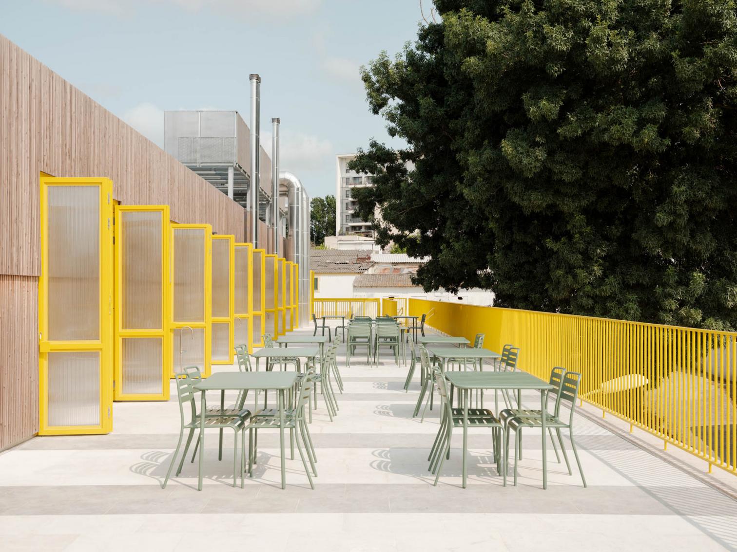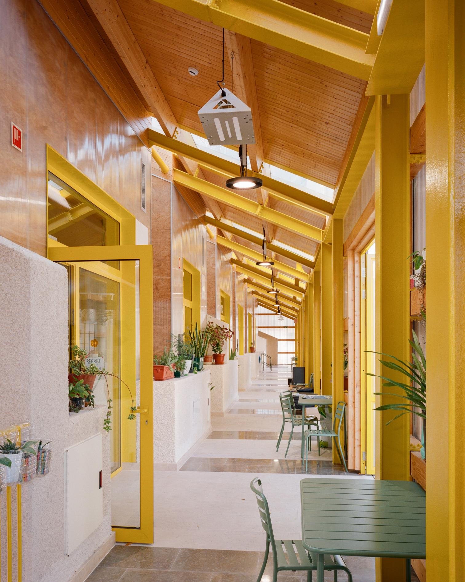 The unifying element of the operation is a large wooden roof that extends the original geometry and acts as a hybrid structure, including yellow-painted steel elements. To the south, the prolongation of the roof creates a new atrium capable of hosting community events. The complex is clad with heat-treated wooden slats, polycarbonate panels, and a double facade system that induces natural ventilation and filtered lighting. Covering 1,512 m², the renovation reconnects the market with public life, combining structural efficiency, sustainability, and cultural continuity.
