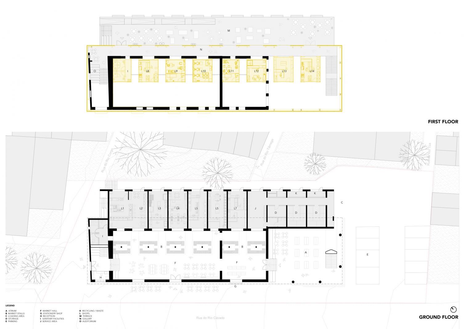 The intervention gives the existing construction a rethinking from an angle of preservation and openness. It retains the main stone walls, reinforced with sprayed concrete and finished with rough plaster and ceramic tiles. The ground floor is restored and freed up for flexible uses, while the existing shops are redistributed. A new upper level incorporates more premises, opening onto a large terrace. Two staircases at either end of the building provide for vertical circulation.