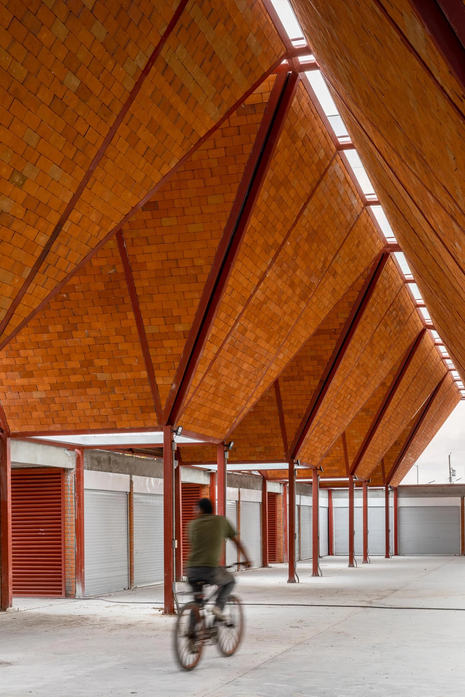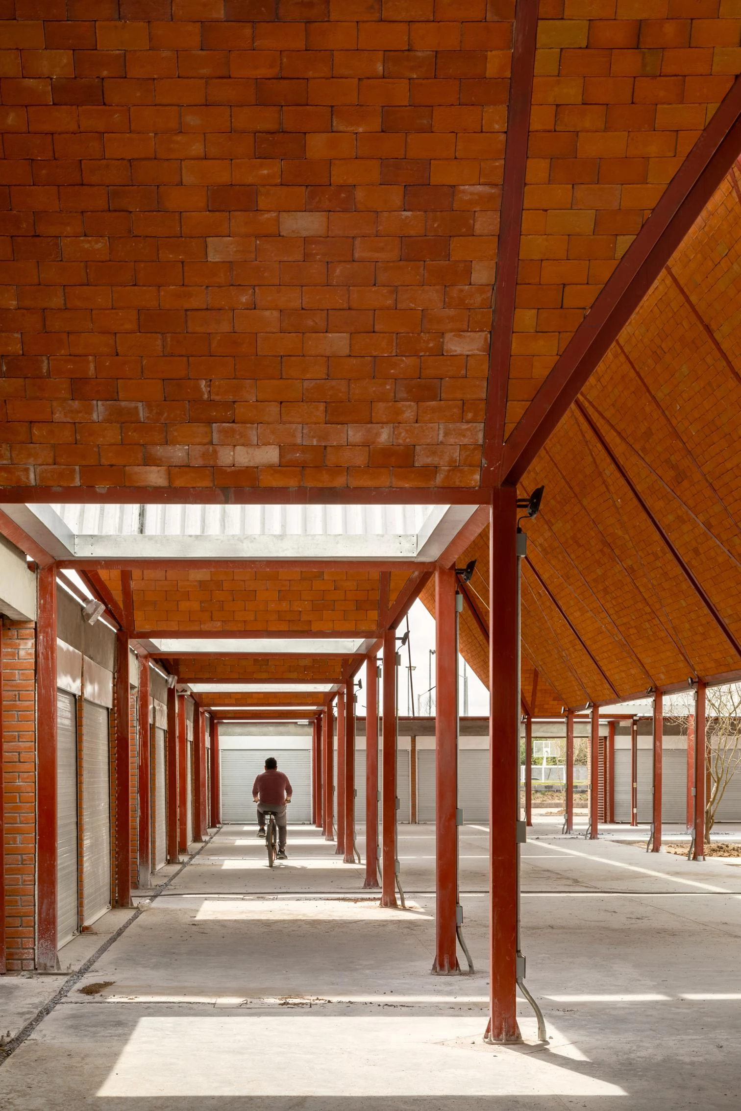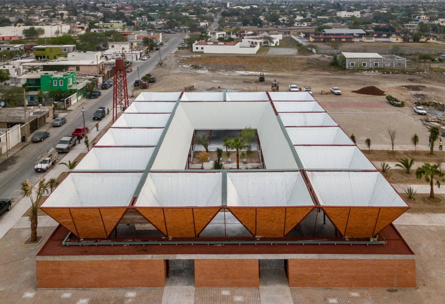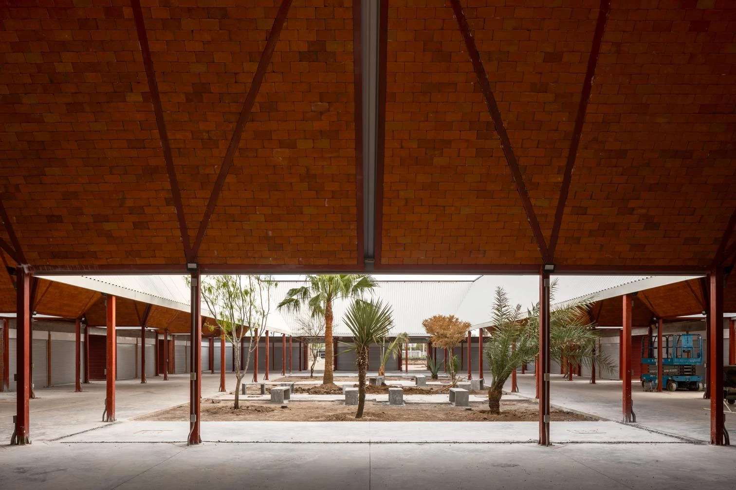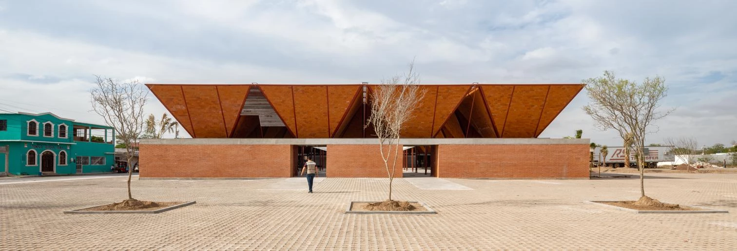 The edifice takes on the solid but permeable character of traditional marketplaces: a series of trapezoidal modules forms a porticoed structure around a courtyard that protects the premises from the dry environment.