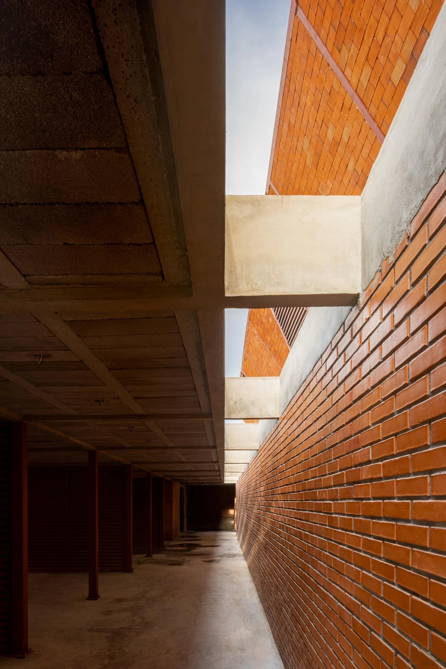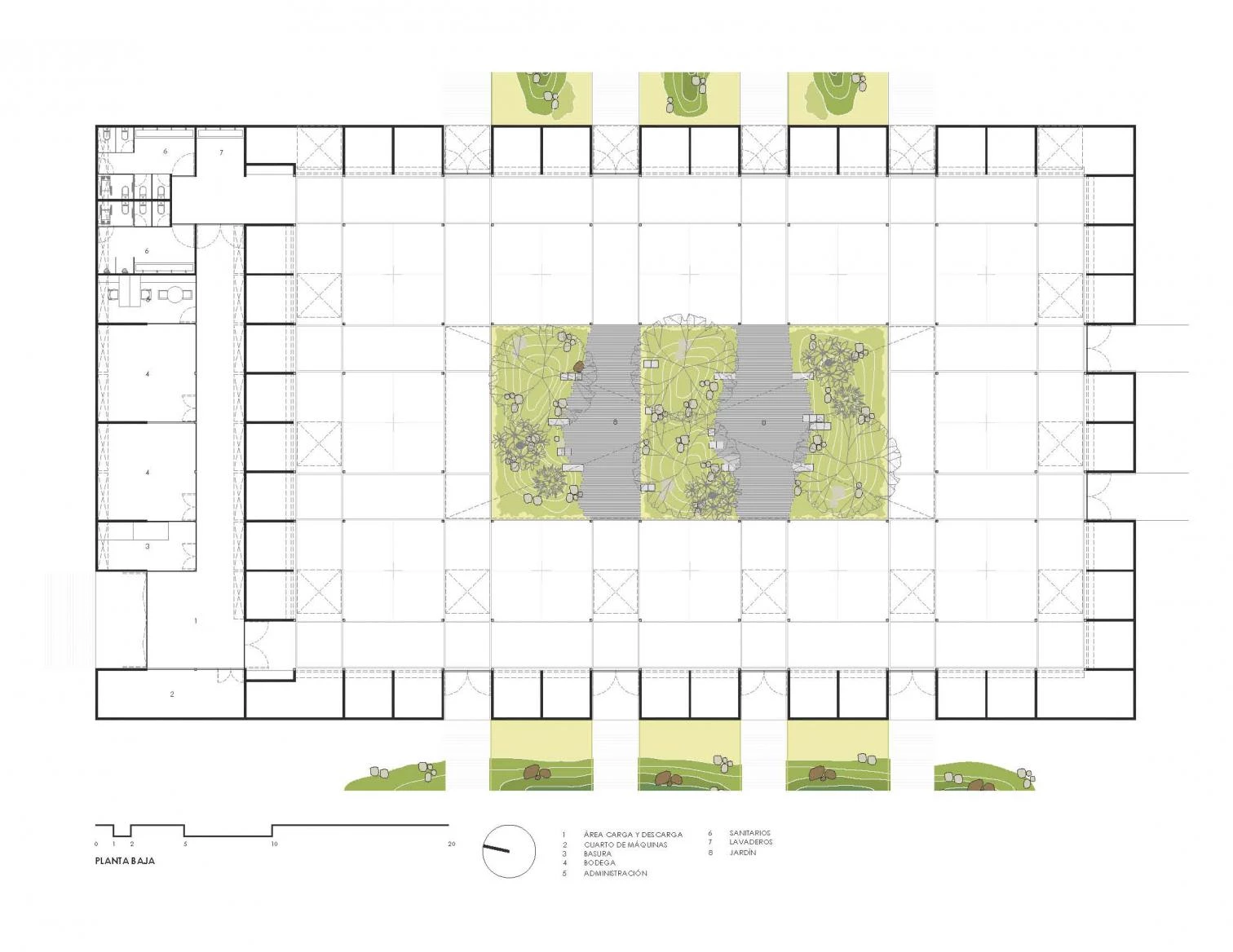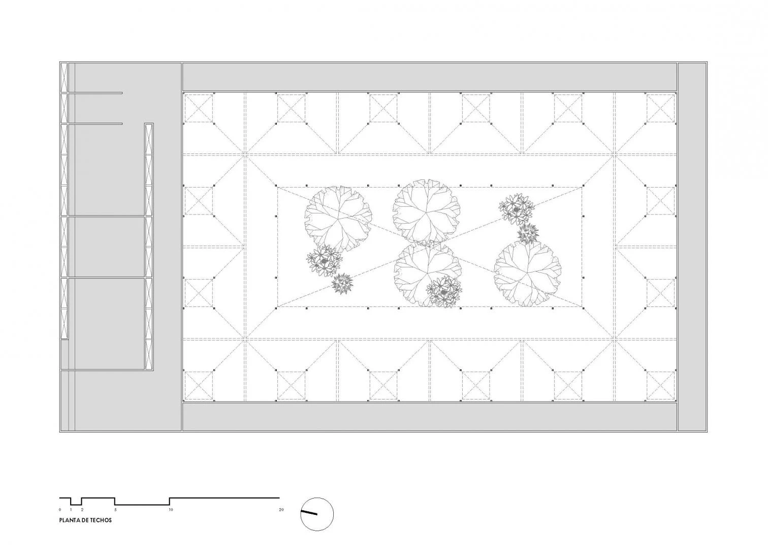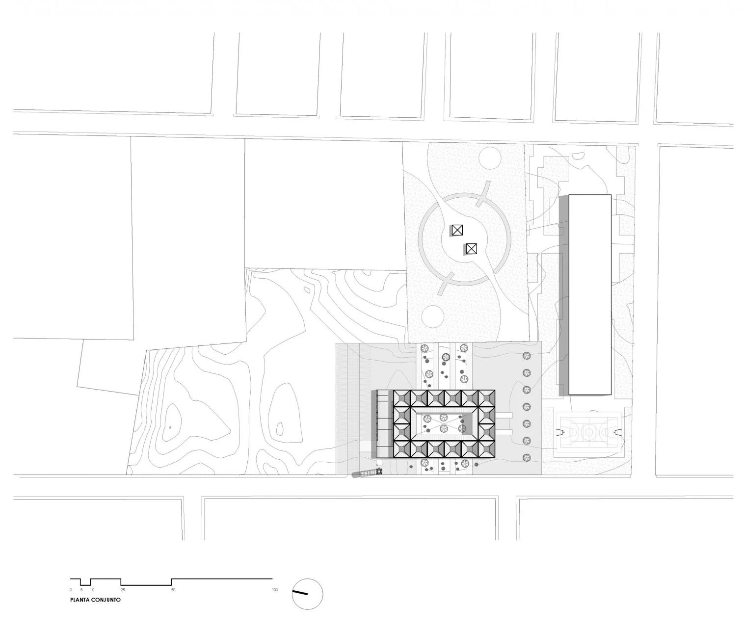 The edifice takes on the solid but permeable character of traditional marketplaces: a series of trapezoidal modules forms a porticoed structure around a courtyard that protects the premises from the dry environment.