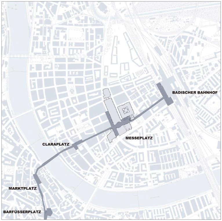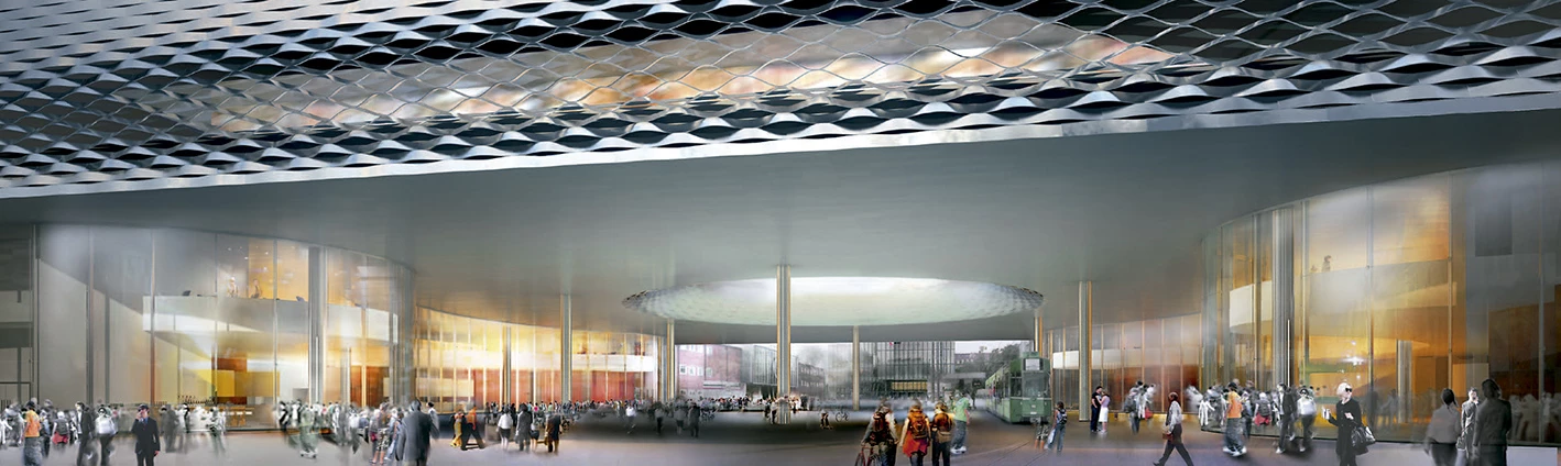 The main architectural and urban element of the project, conceived as an extension of Hall 1 along Riehenring avenue, is a large toplit plaza that will house a wide range of uses and activities, and has therefore received the name of City Lounge. This is a covered public space equipped with all kinds of services, resembling a railway station concourse or an indoor market. The City Lounge is not only the entrance to the fairs, but also a lively gathering point at the end of Clarastrasse, the main shopping street in Kleinbasel.