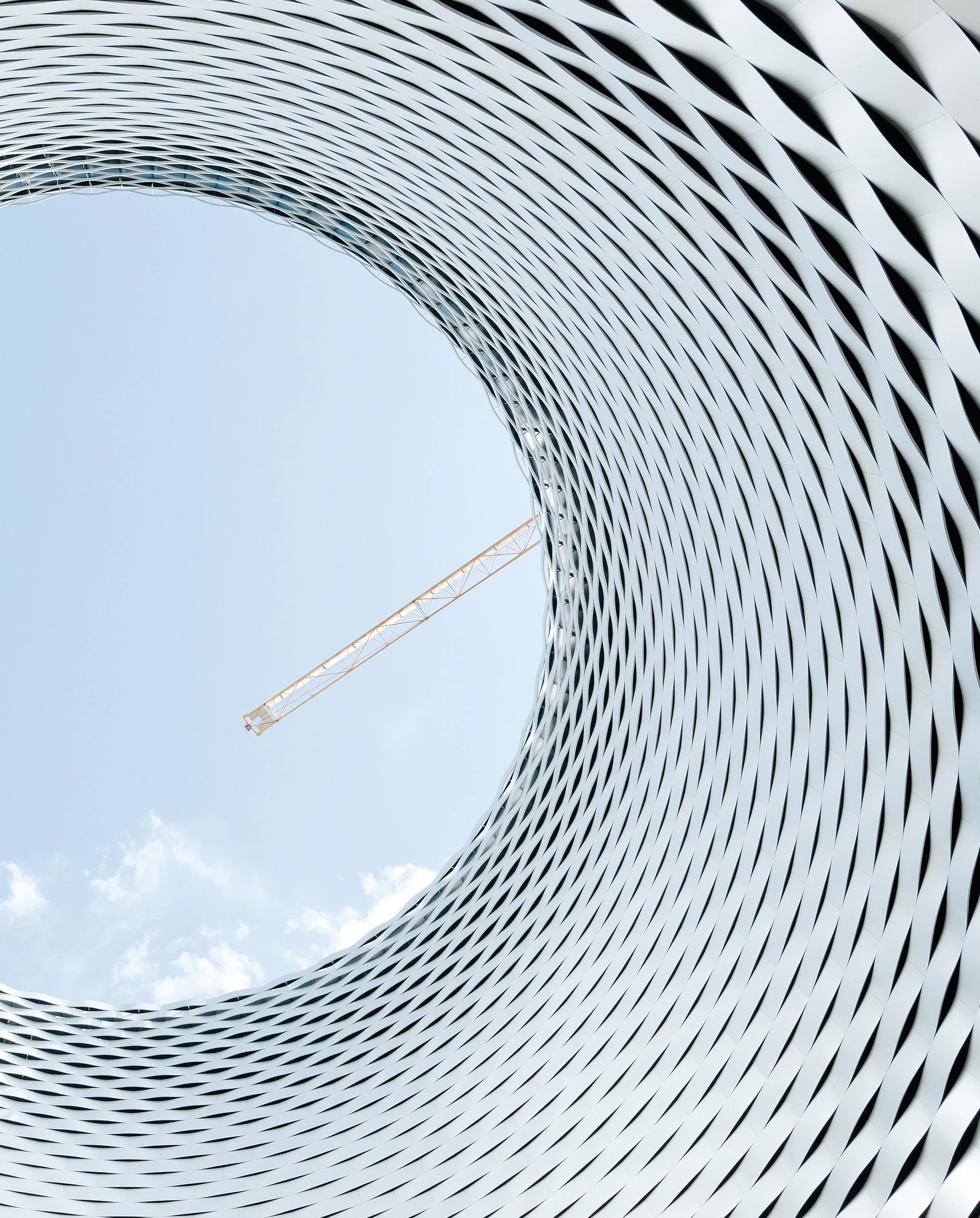 Internally, the building complies with the requirements of a facility of these characteristics: wide-span rectangular rooms and ceiling heights of around 10 meters. In this context, the fair stands must draw all the attention of the visitors, and architecture is only glimpsed in the public and circulation areas, as in the interior courtyard of Hall 2: one of the most attractive public areas in the city during fairs, but not accessible during the rest of the year. The City Lounge, with its large open oculum, can be understood as an interpretation of the round courtyard of Hall 2, only that here the space is always accessible to the public. Furthermore, the need to create neutral and opaque halls for the fairs leads, very often, to a poor architecture of stacked boxes. The new intervention, however, proposes a transparent design and dynamic forms on ground floor, as a response to the circulation flows in the city. The two upper levels have slightly different geometries and warped facades, strengthening their formal independence and respecting the solar conditions of the apartments in front of them. A continuous surface of curved metallic bands, resembling a large-scale deployé, covers these facades and also the interior of the round courtyard over the City Lounge.