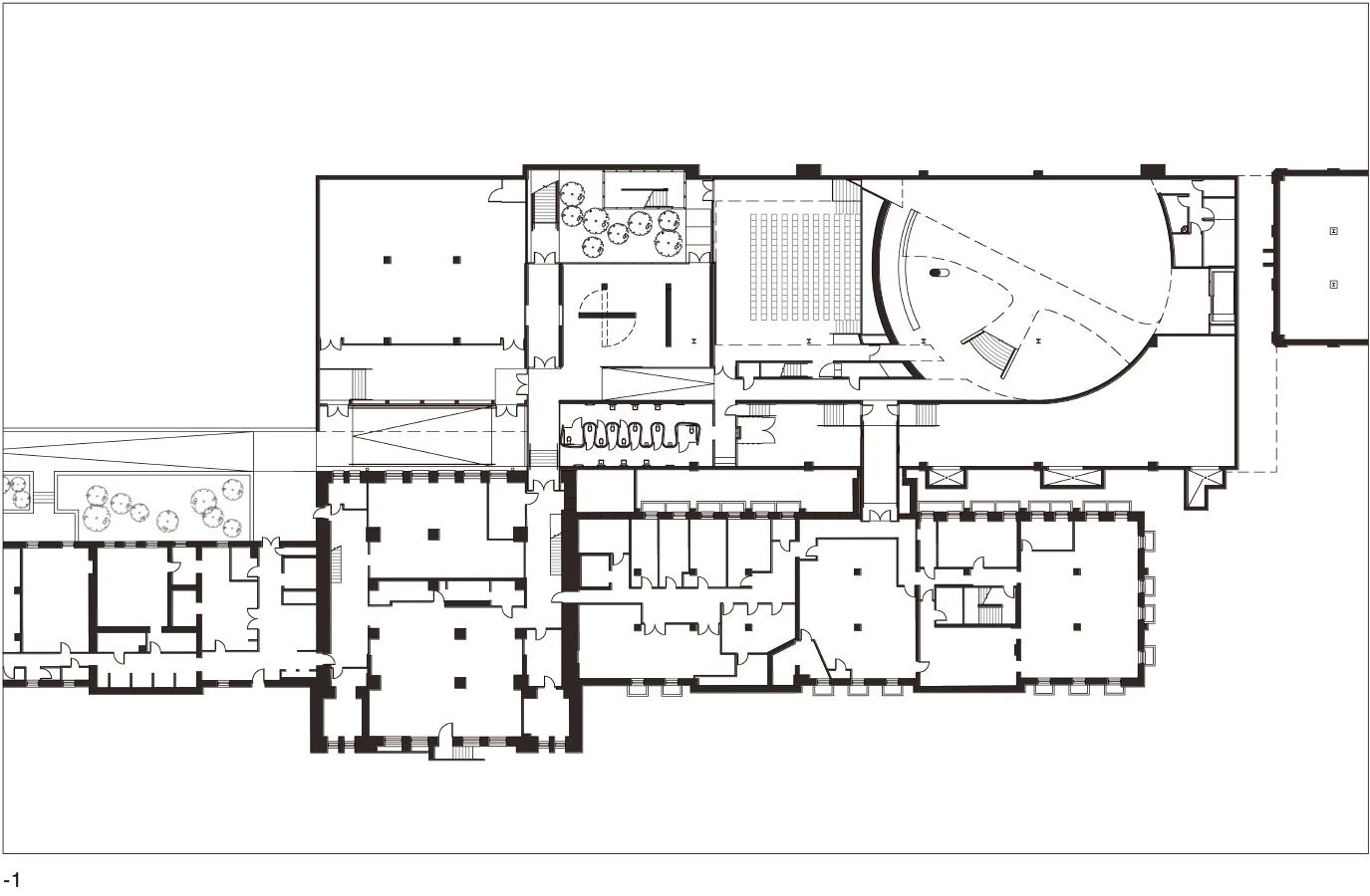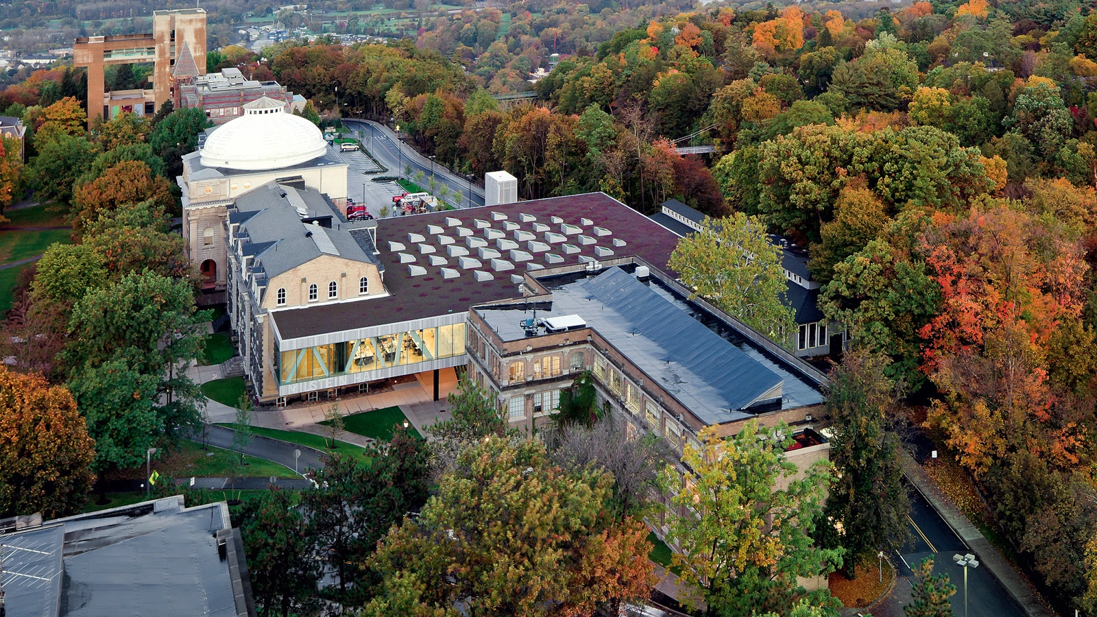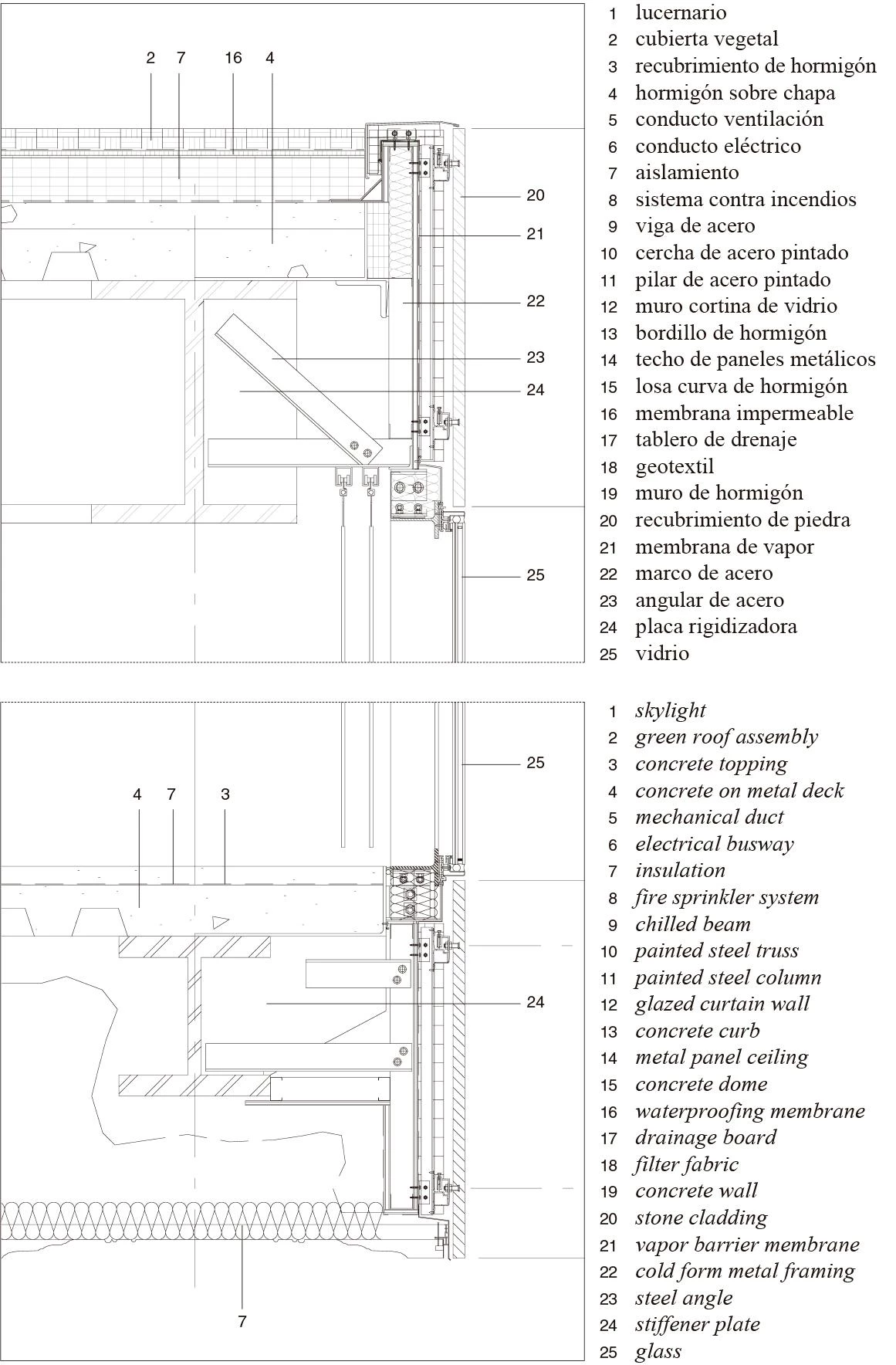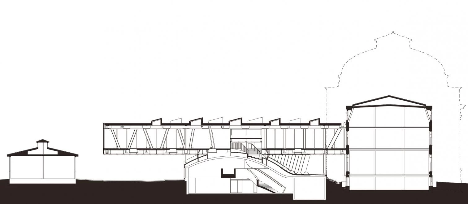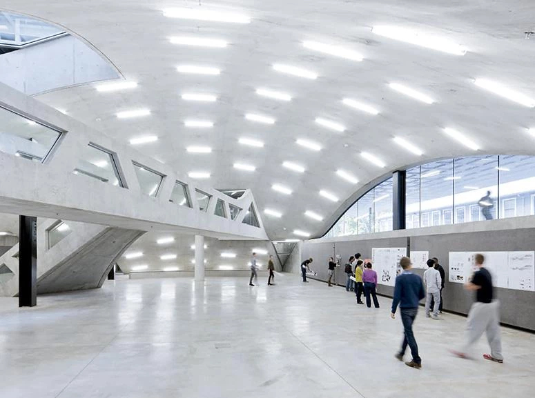 Milstein Hall is the first new building to go up for Cornell University’s College of Architecture, Art and Planning in a hundred years. Without succumbing to stylistic mimicry but at the same time avoiding isolation in the environment, the building inserts itself amid three existing ones, serving to connect them, providing new routes between the interior and the exterior, and enlarging the premises of the school by 47,000 square meters of new classrooms, a gallery, and an auditorium. The project unfolds from a series of contrasts. Typologically, the modern ‘box,’ usually presented as an isolated object, functions as a hinge giving continuity to the existing buildings. For its part the program is layered in two distinct areas, each associated with a particular structural solution, catalog of materials, and atmosphere. Hence whereas the upper floor, defined by a framework of steel crosses, presents a luminous and practically unpartitioned space, the ground floor – a telluric half-buried space rendered with a structure of imposing concrete beams – houses an auditorium topped by a dome that emerges through the upper slab and comes in visual conflict with the rectilinear structure. Finally, a landscaped roof perforated by skylights crowns the complex.
