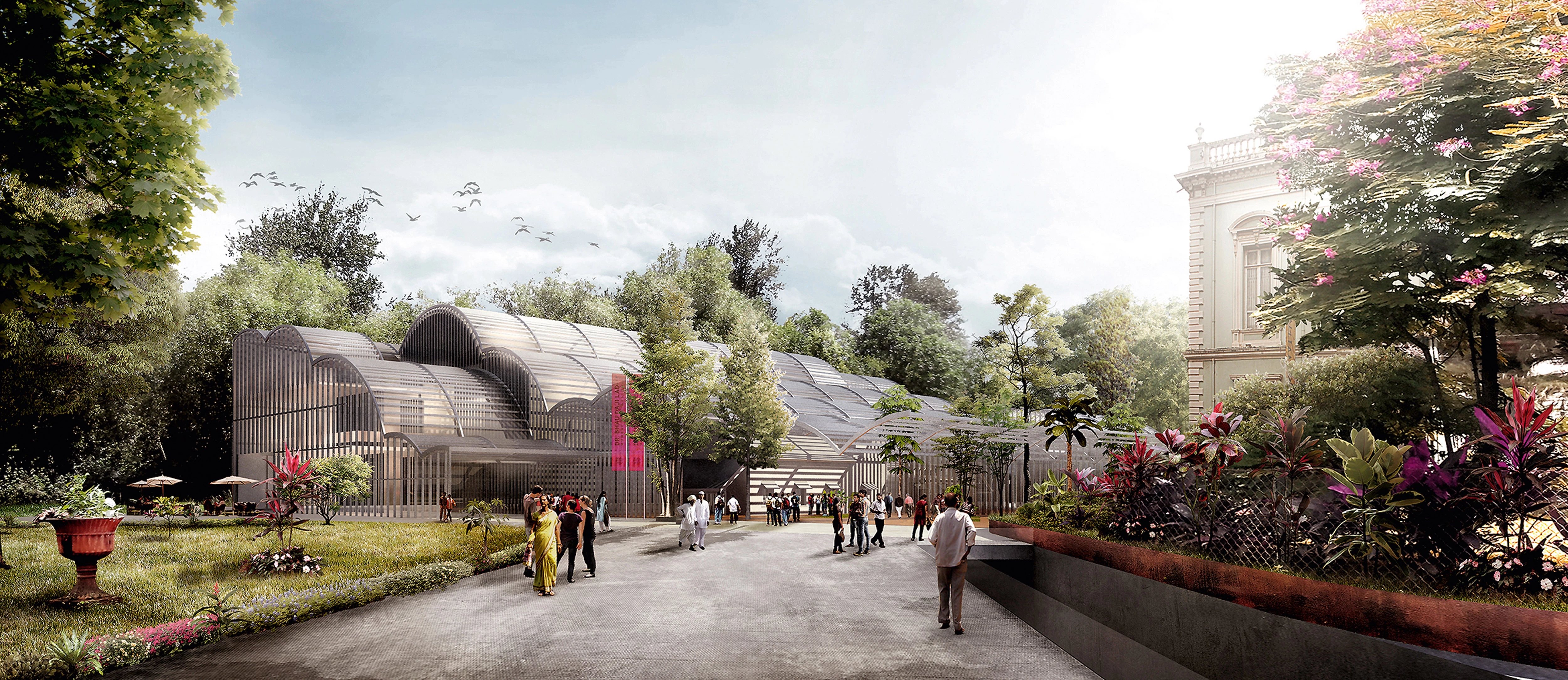 A series of parallel vault-like structures with a variable section, which incorporates the existing constructions and adapts to tree growth while bringing in natural light, achieves a direct connection with the Zoo and the Botanical Garden.