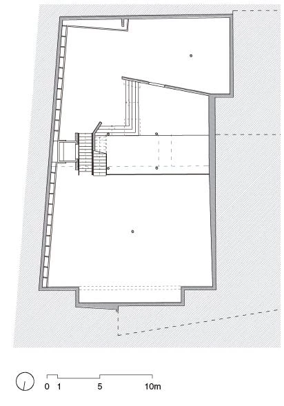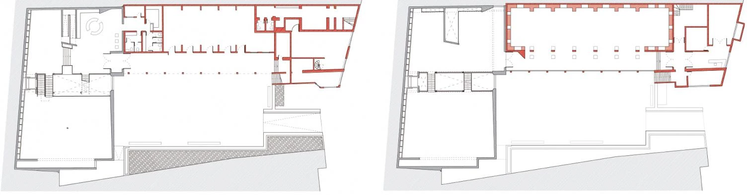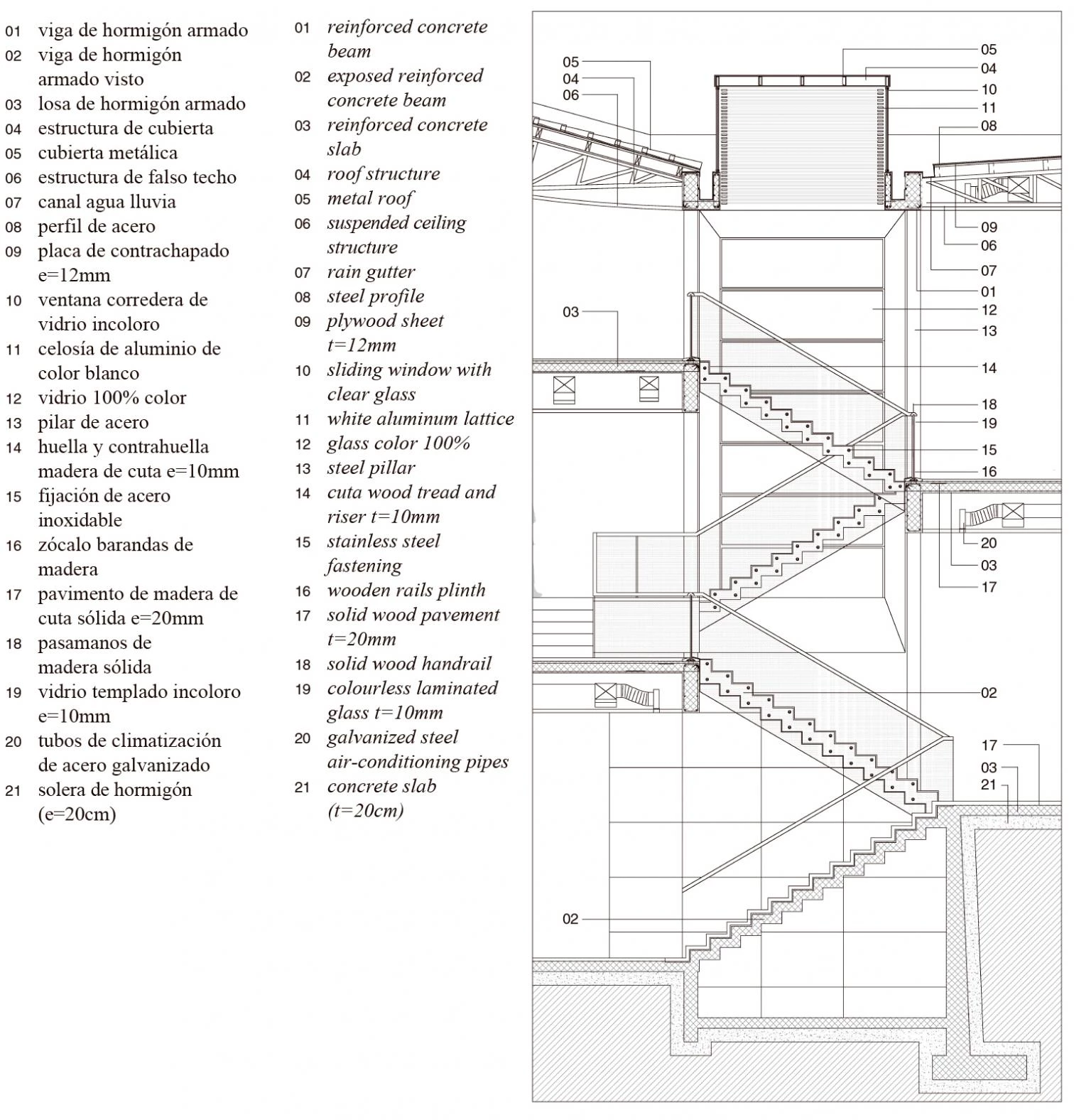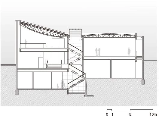 The access is located under the entrance of the old house. This space, responding to the new circumstances, is transformed into the building’s atrium. Inside, a central luminous void concentrates the vertical circulations, and at the same time articulates the different levels of the halls. These horizontal levels are organized in half floors facing each other, making it possible to fragment the exhibitions, while ascendent and descendent diagonal views offer a panoramic and total view of the space. The installations, offices, deposits, and workshops are in the old adjacent building. The repertoire of elements available to address the problem posed is significantly restricted in the project, emphasizing the longitudinal section of the building.