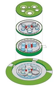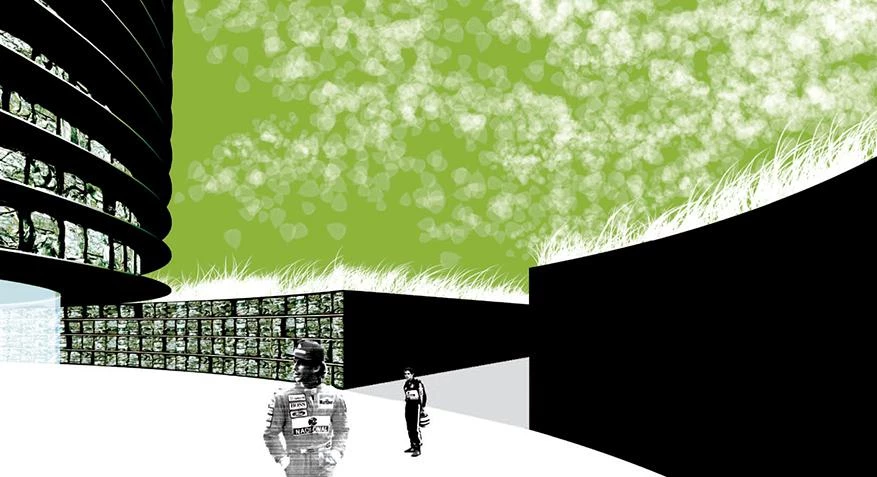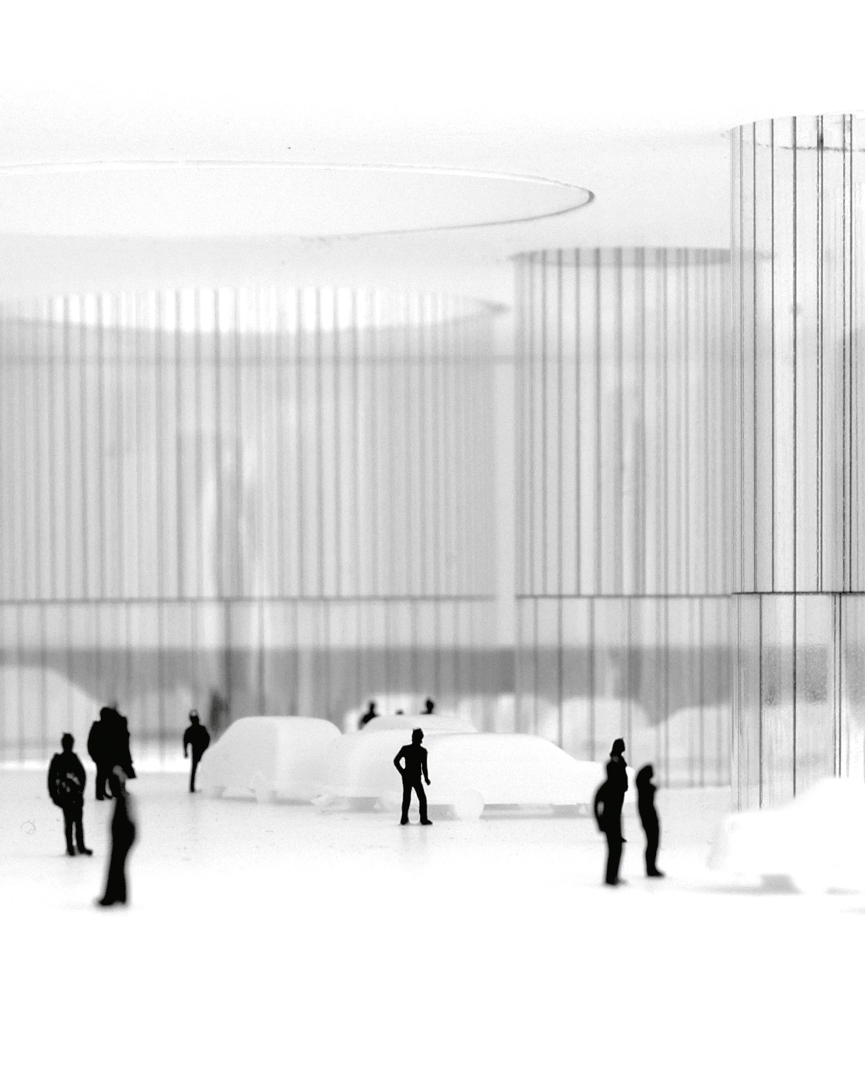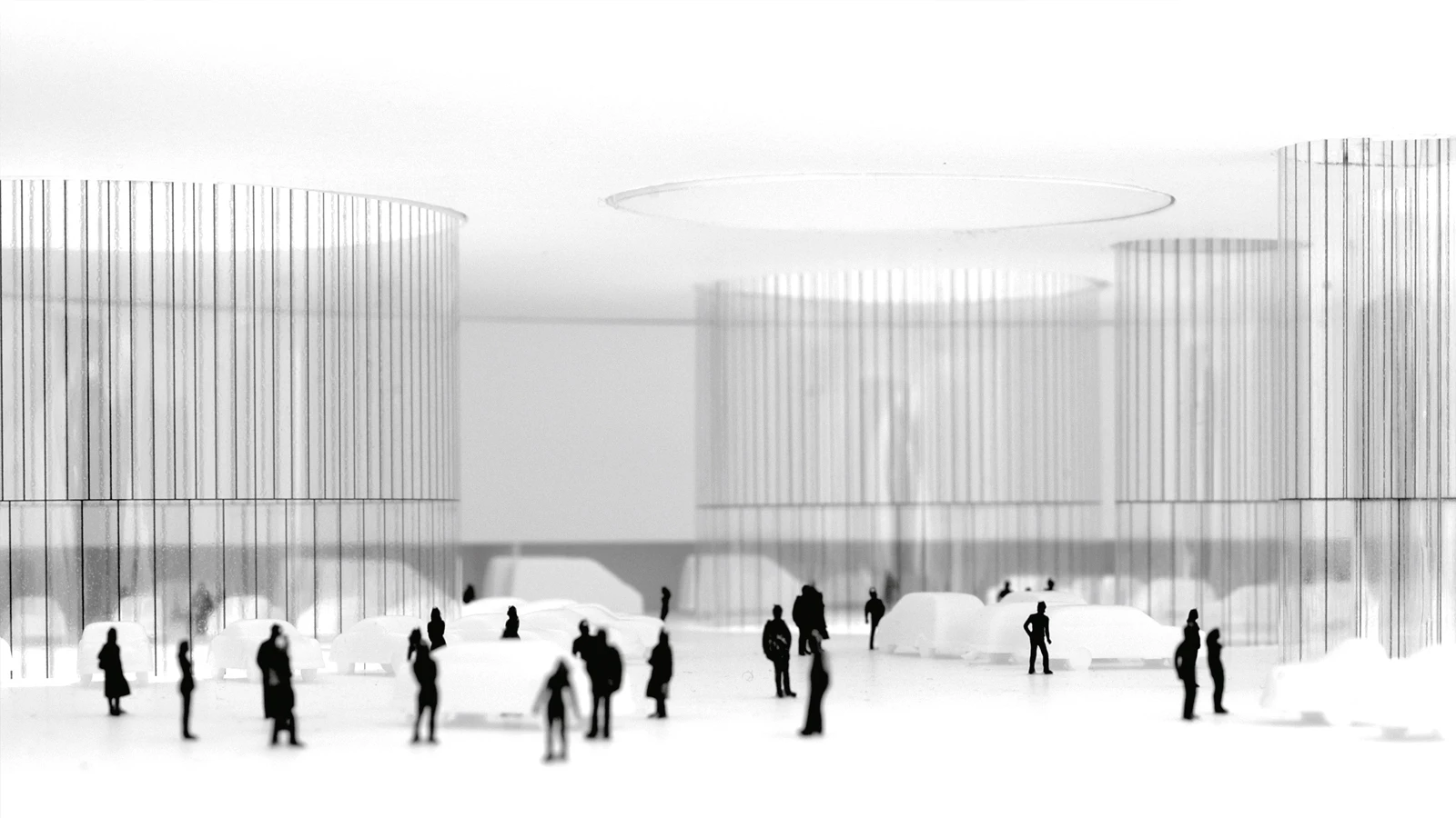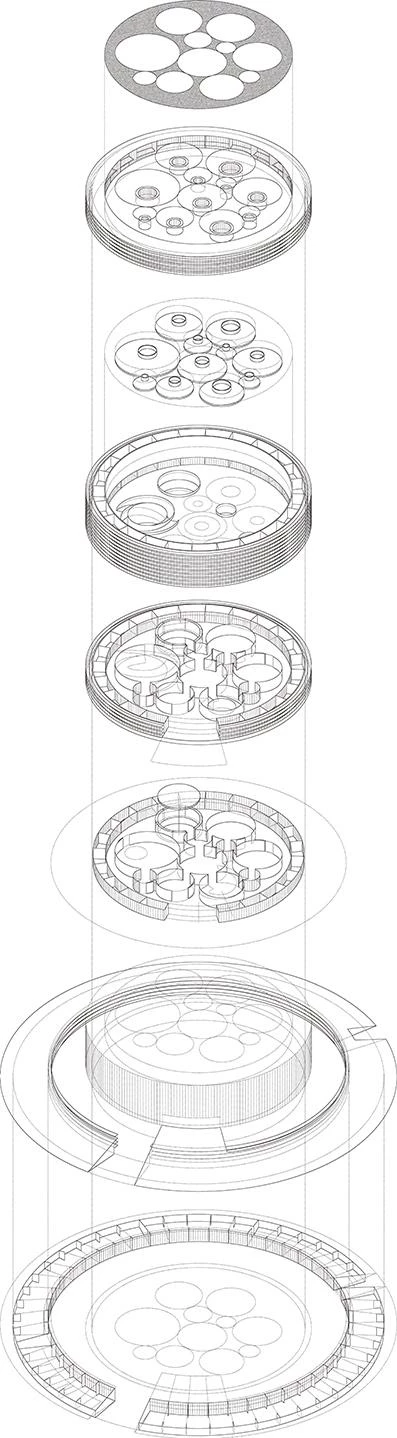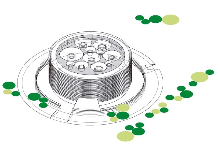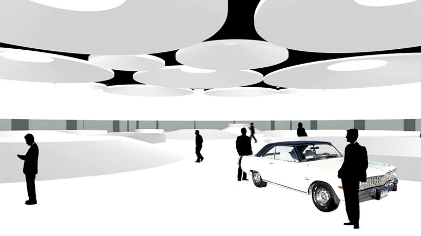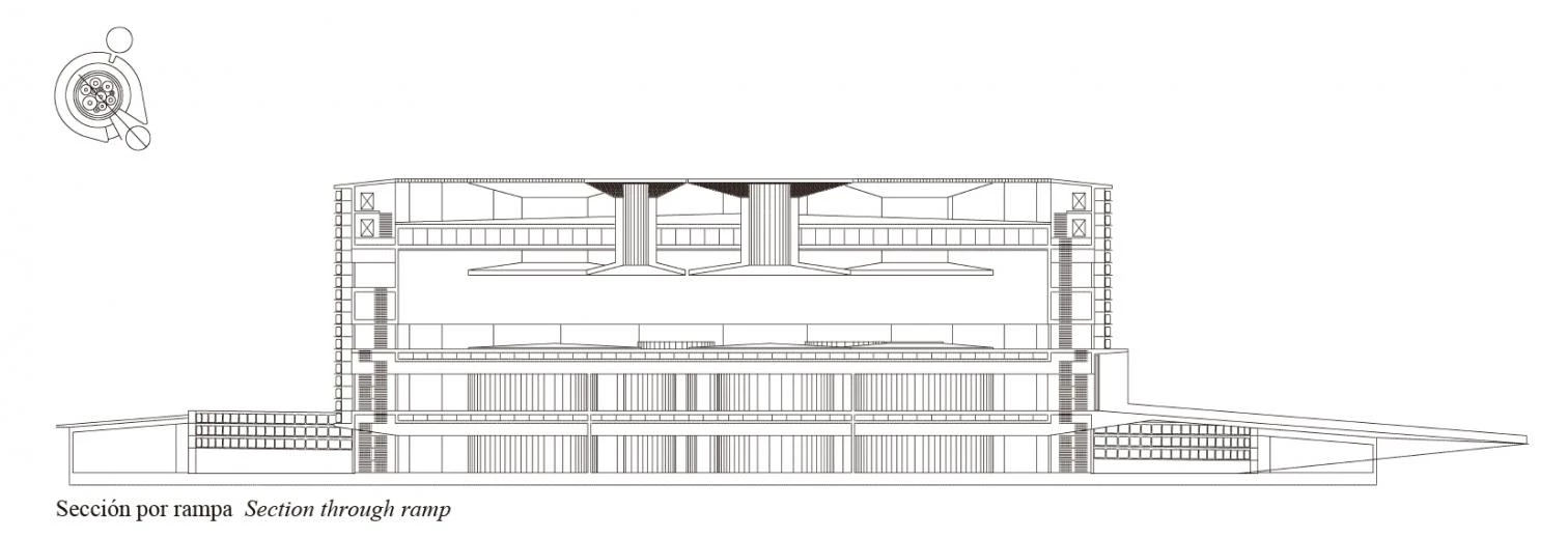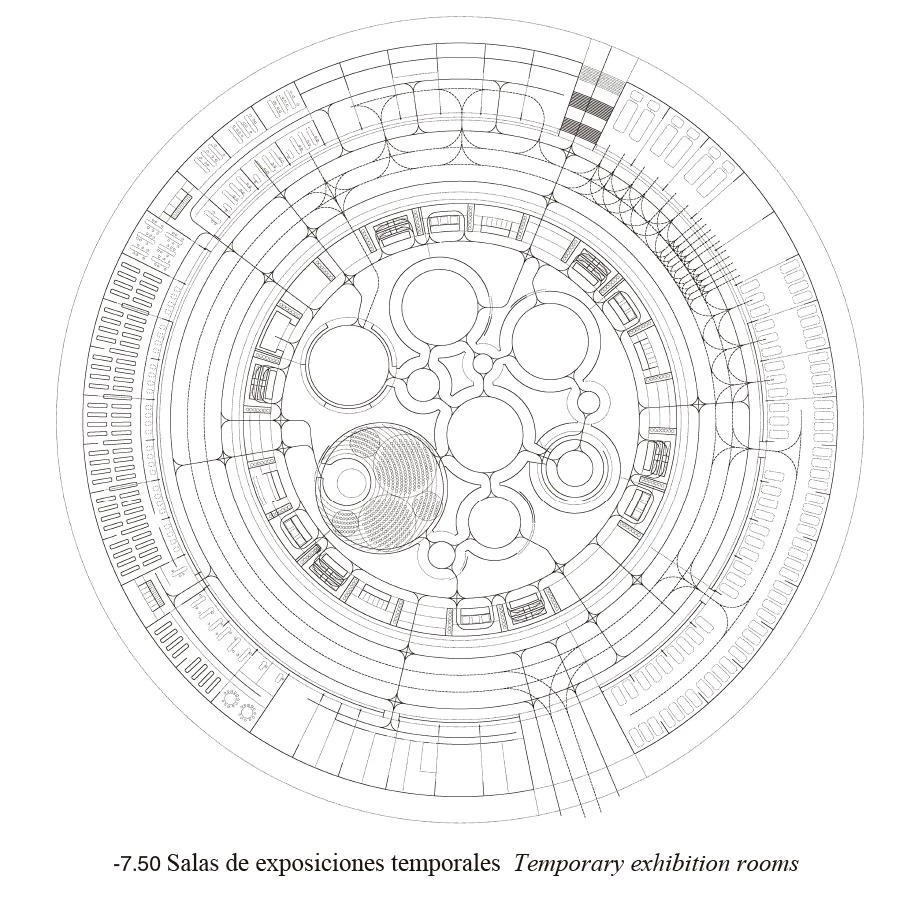 The mandatory setbacks from the motorway defined a roughly triangular area into which a cylindrical volume was inserted; a circle tangent to the delimiting paths, which establishes an optimum relationship between built mass and open space, establishing links with the place. Its form and large size try to establish relationships with traditional types, reinterpreting the Roman circus and its predecessor, the coliseum. But, at the same time, due to its position in the landscape, it will evoke the large medieval Castilian fortresses: castles and towers. The fortified nature of the building arises also from its relationship with the environment. Thus, the building is wrapped in a massive metalwork structure, an introspective wall that allows visitors to devote their attention to the museum contents, and that makes the building recognizable from the transportation infrastructures surrounding it; a fortress pierced by round skylights, whose arrangement in plan will define a machine-oriented space around the cars of the Barreiros collection. The exhibition space is the result of volumetric perforation based on a simple system of homothetic repetition of the cylinder, generating, because of the size of the container, a single free-flowing space, a chained sequence of different zones connected by the interstitial spaces between cylindrical light wells. These courtyards establish a visual cross-connection among the different strata of the building.