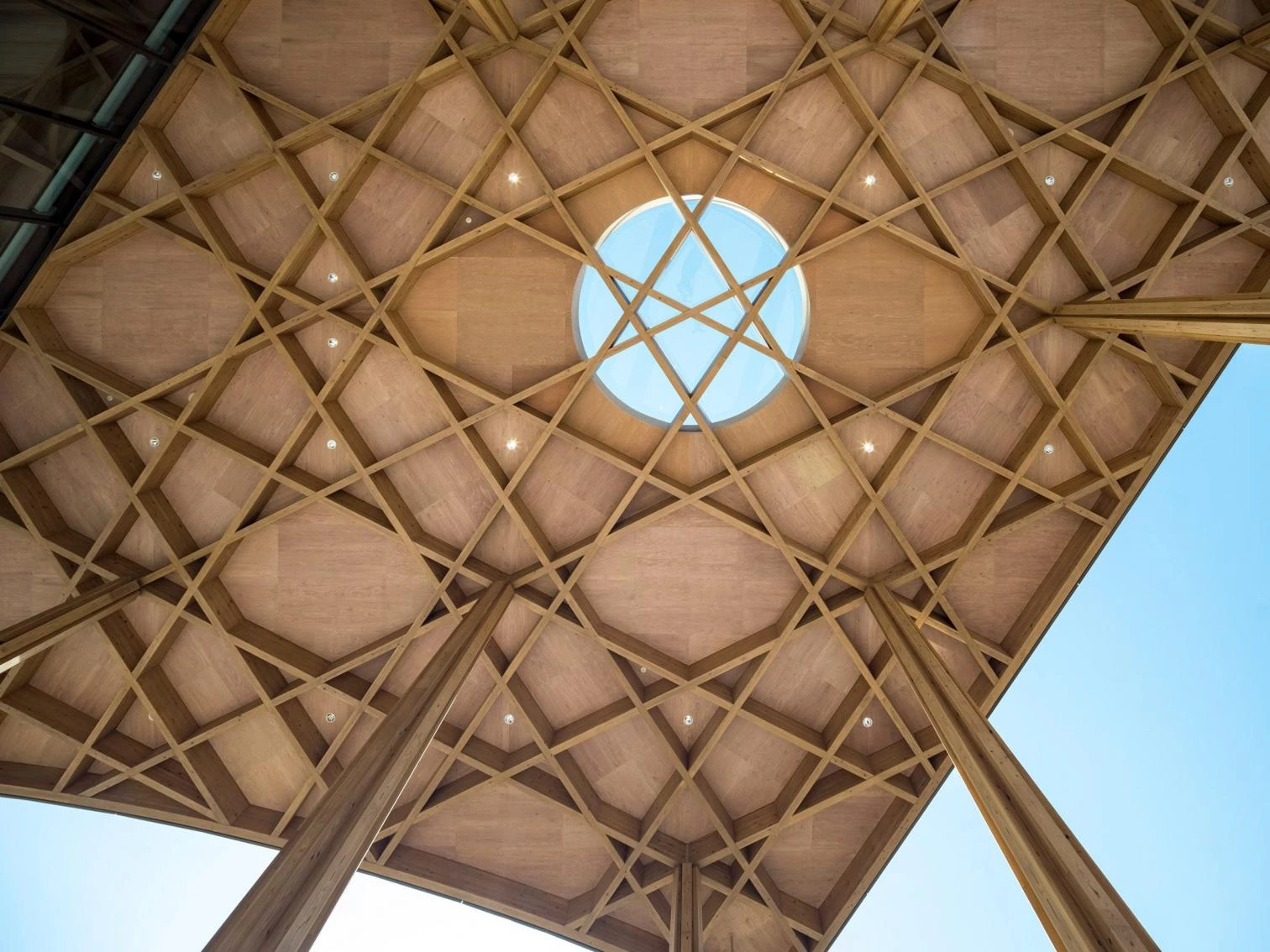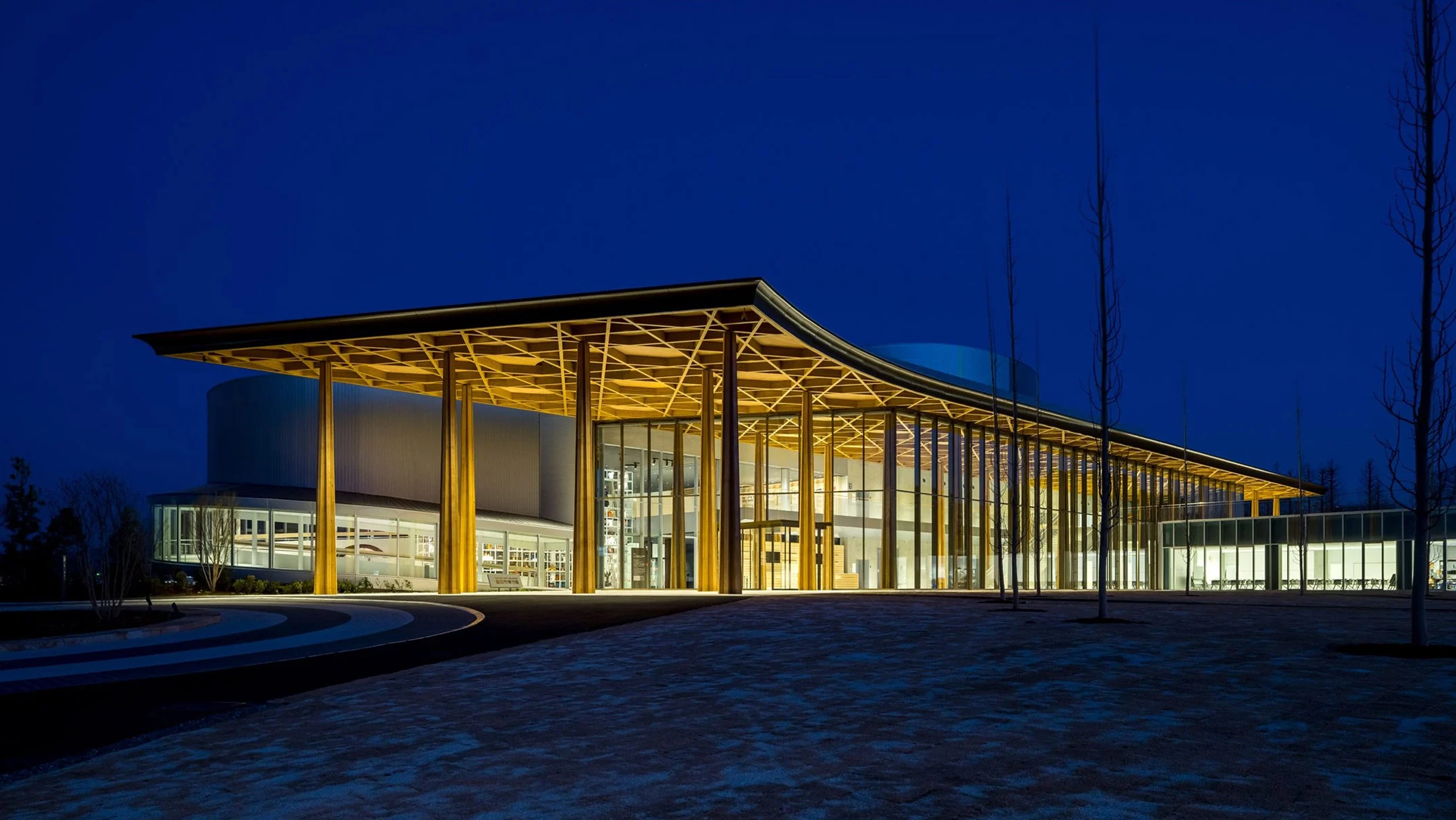The new building is partly executed with locally sourced cedar wood. The underside of the entrance porch shows a criss-cross structure representing the emblem of Toyota City (two superposed arrows shaping a V). When light shines through this circular opening at noon during summer solstice, the wooden beams cast a shadow on the floor that forms the city’s symbol.