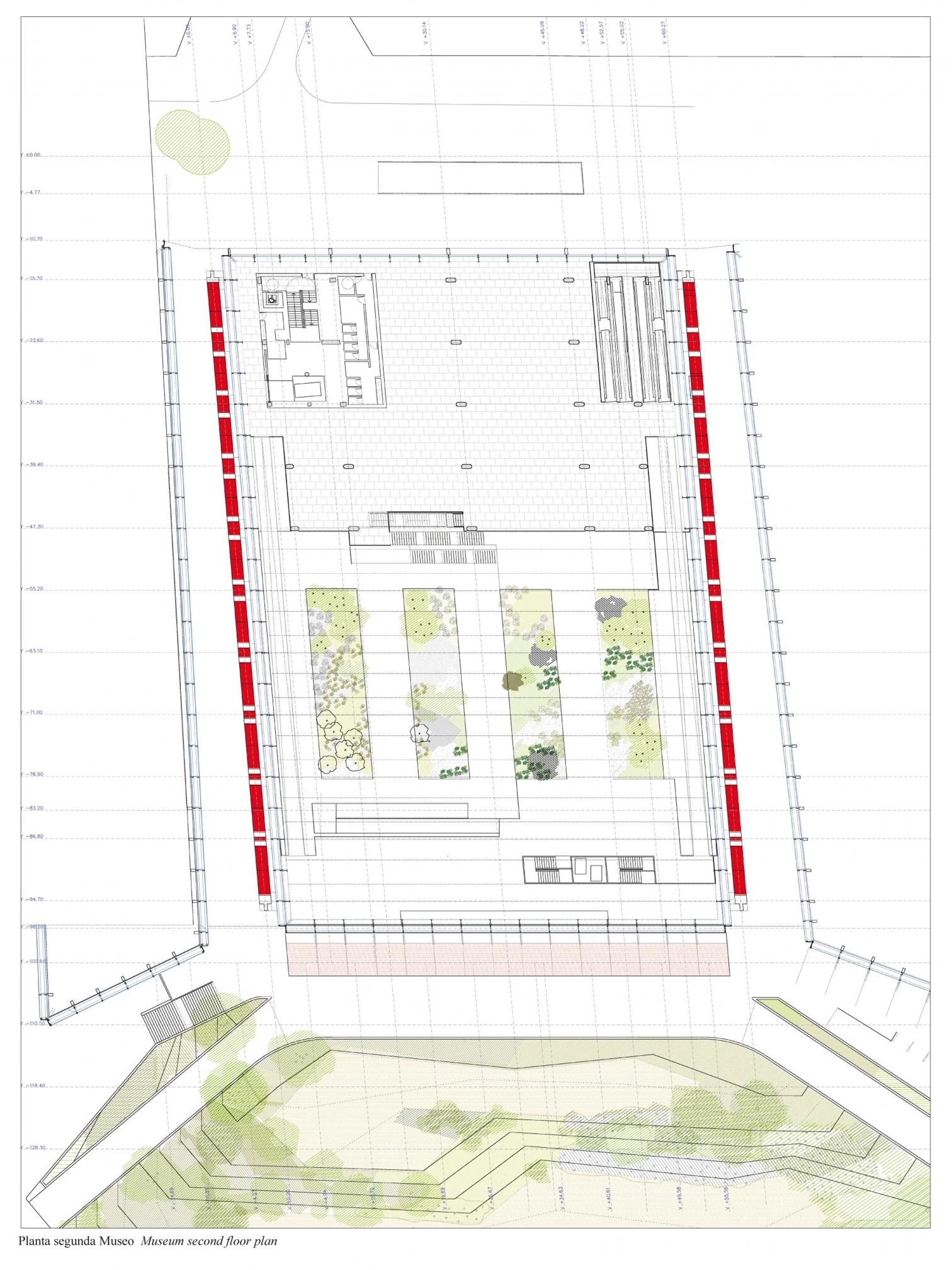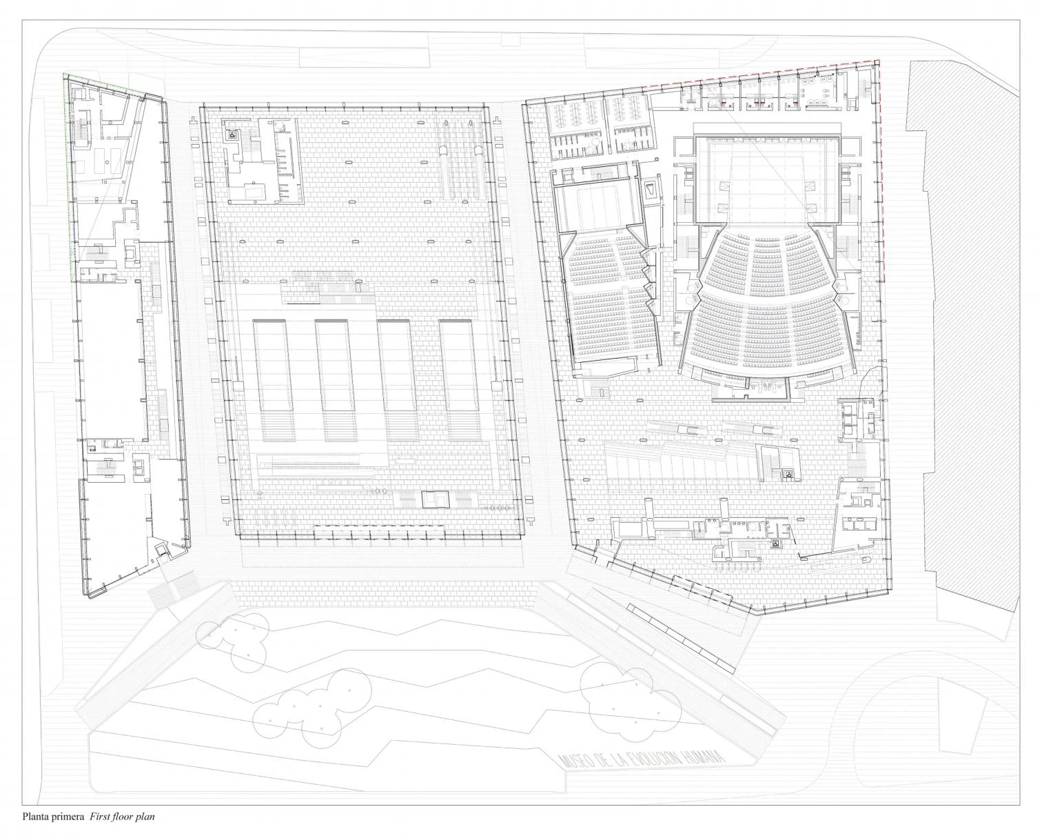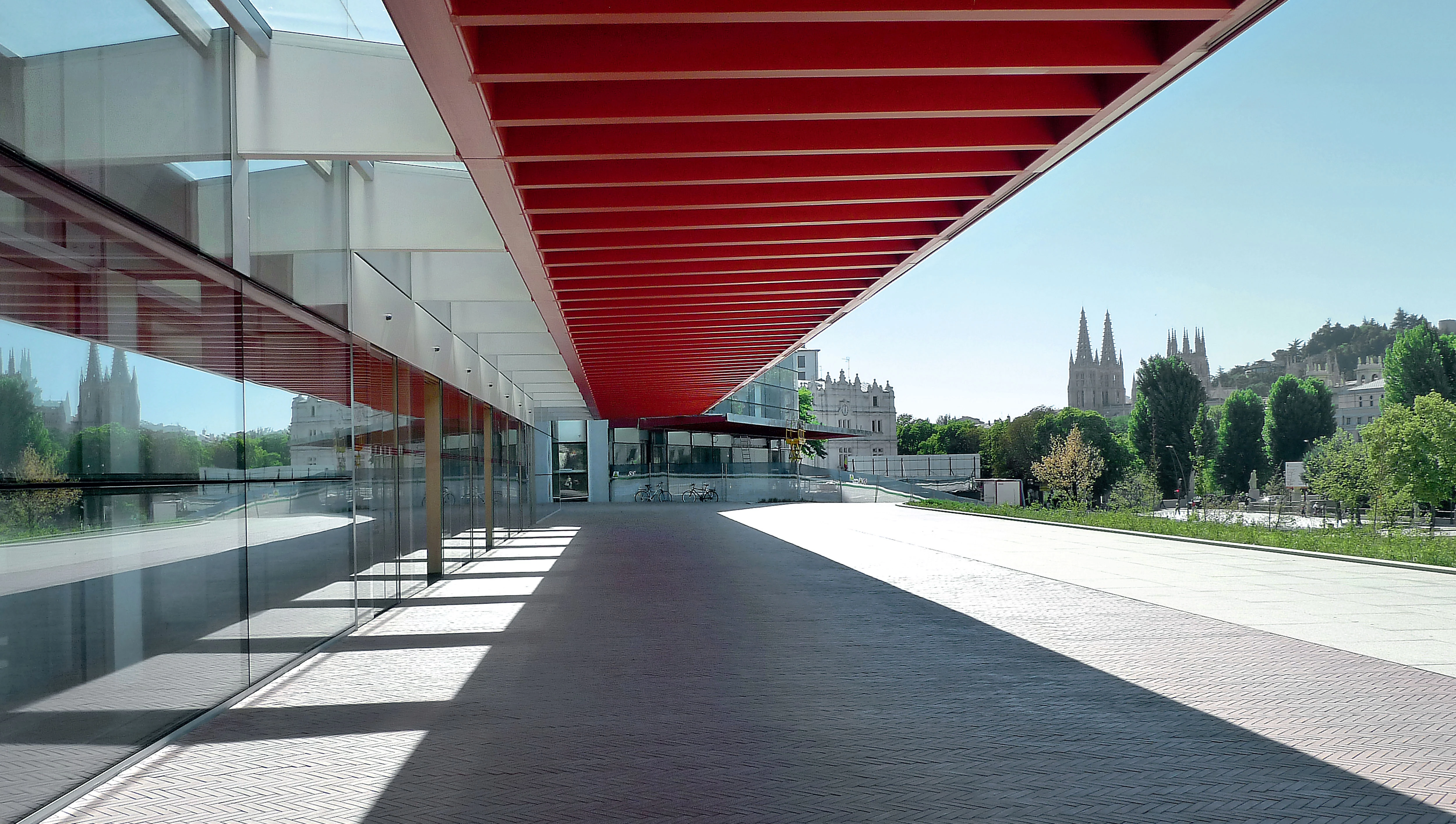 These last two are separated from the museum, which occupies a central position, through two cracks that let natural light go through and that connect the riverside area with the rear urban area, recalling, just like inside the museum, the spatial sensations that the railway trench of the Atapuerca mountains arouses. Furthermore, while the museum is characterized from the exterior by the red lozenge screen of its side facade, the National Research Center, located to the east, is clad on two sides by green panels of cut out rhombi, and the Exhibitions and Congress Center, to the west, covers part of its facade with a double skin formed by red profiles and sheet, and cut-out white sheet outlining an abstract drawing.