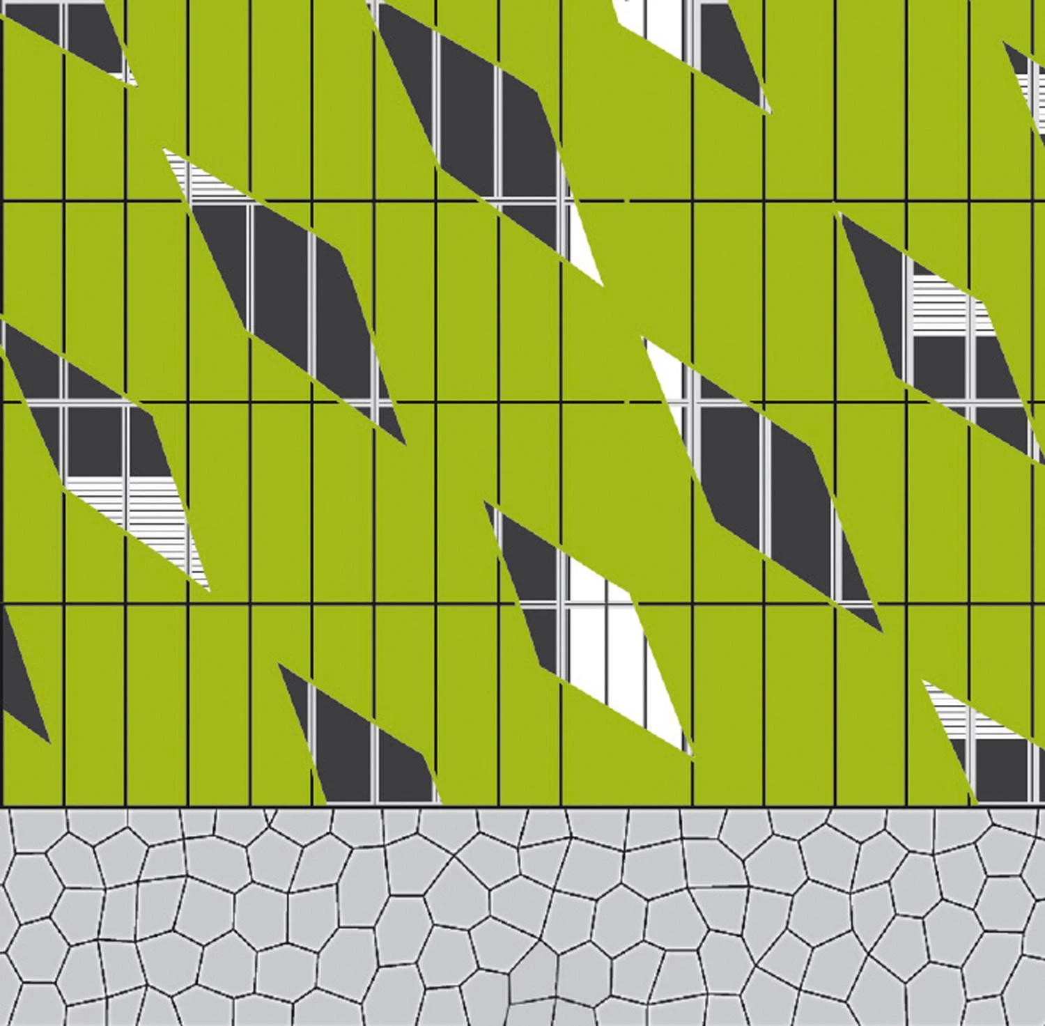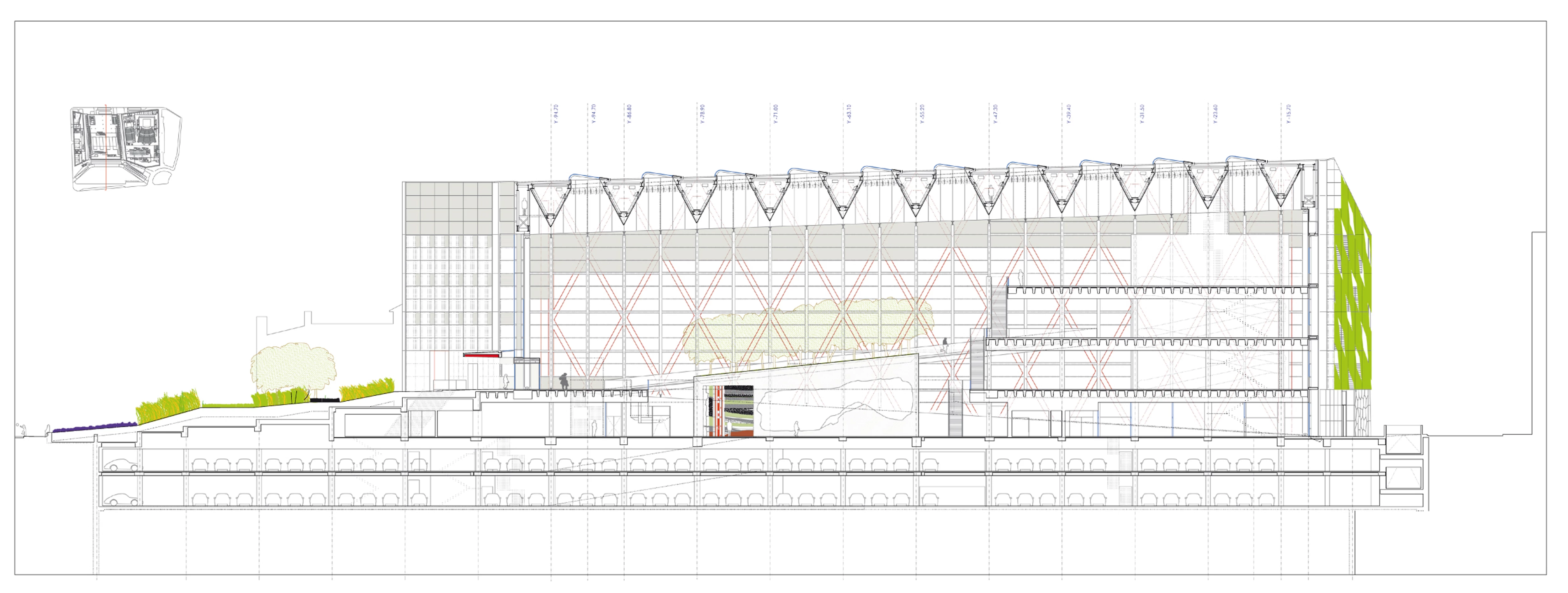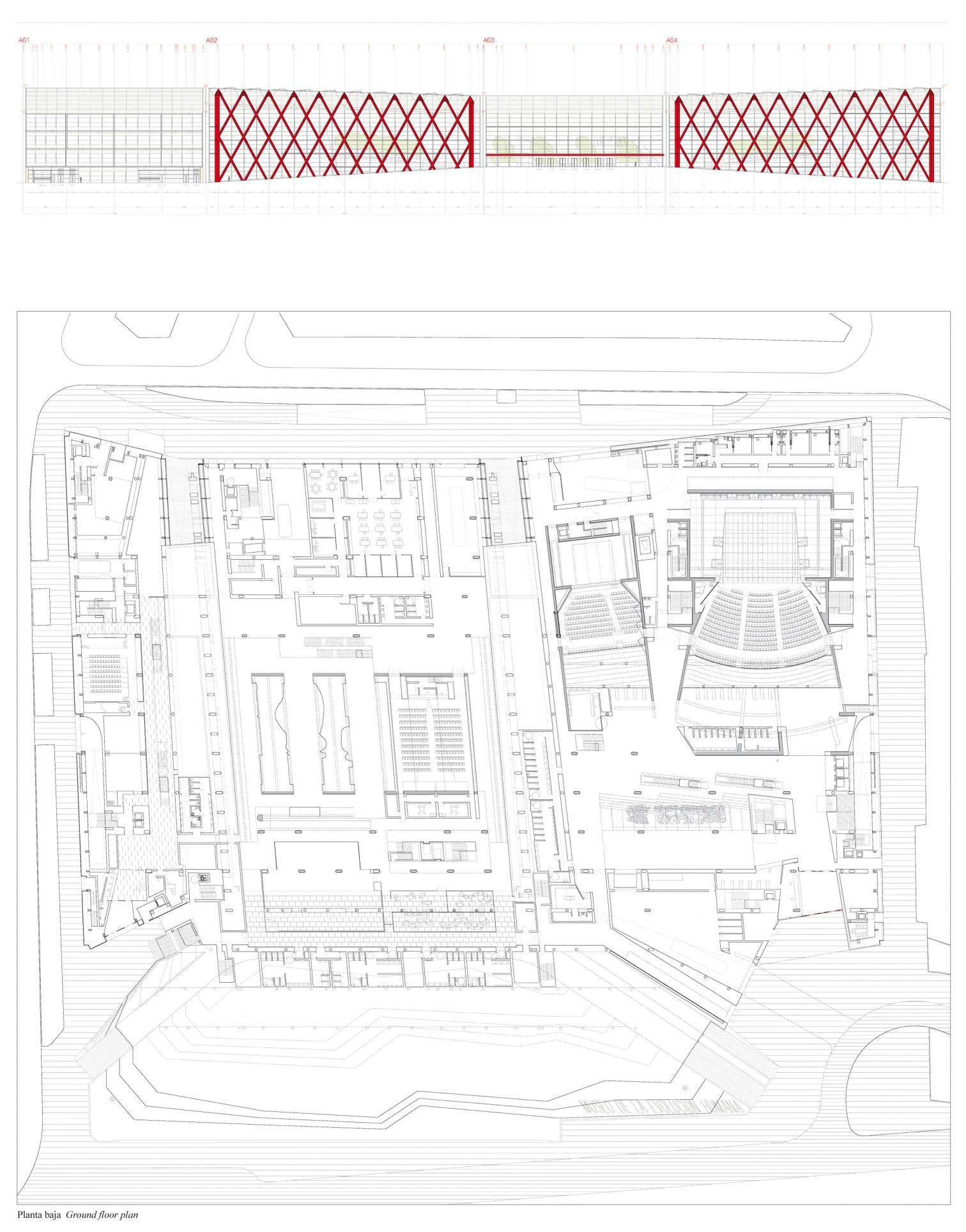 These last two are separated from the museum, which occupies a central position, through two cracks that let natural light go through and that connect the riverside area with the rear urban area, recalling, just like inside the museum, the spatial sensations that the railway trench of the Atapuerca mountains arouses. Furthermore, while the museum is characterized from the exterior by the red lozenge screen of its side facade, the National Research Center, located to the east, is clad on two sides by green panels of cut out rhombi, and the Exhibitions and Congress Center, to the west, covers part of its facade with a double skin formed by red profiles and sheet, and cut-out white sheet outlining an abstract drawing.
