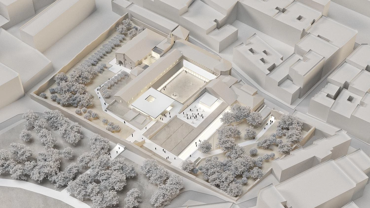 A large granite perimeter wall delimits the 13th-century monastic complex and its outdoor spaces, isolating the historic site from its urban environment. The winning proposal creates a new entrance in the south wall, connecting the future museum and its gardens to the city. An access pavilion is formalized as a wide canopy on the axis of the cloister. The hitherto incomplete cloister becomes the heart of the museum and also of the archaeological center that will be built partly underground, with a total area of 7,000 square meters. The landscape design integrates the architectural traces that have survived to this day in a garden that will be open to the public.
