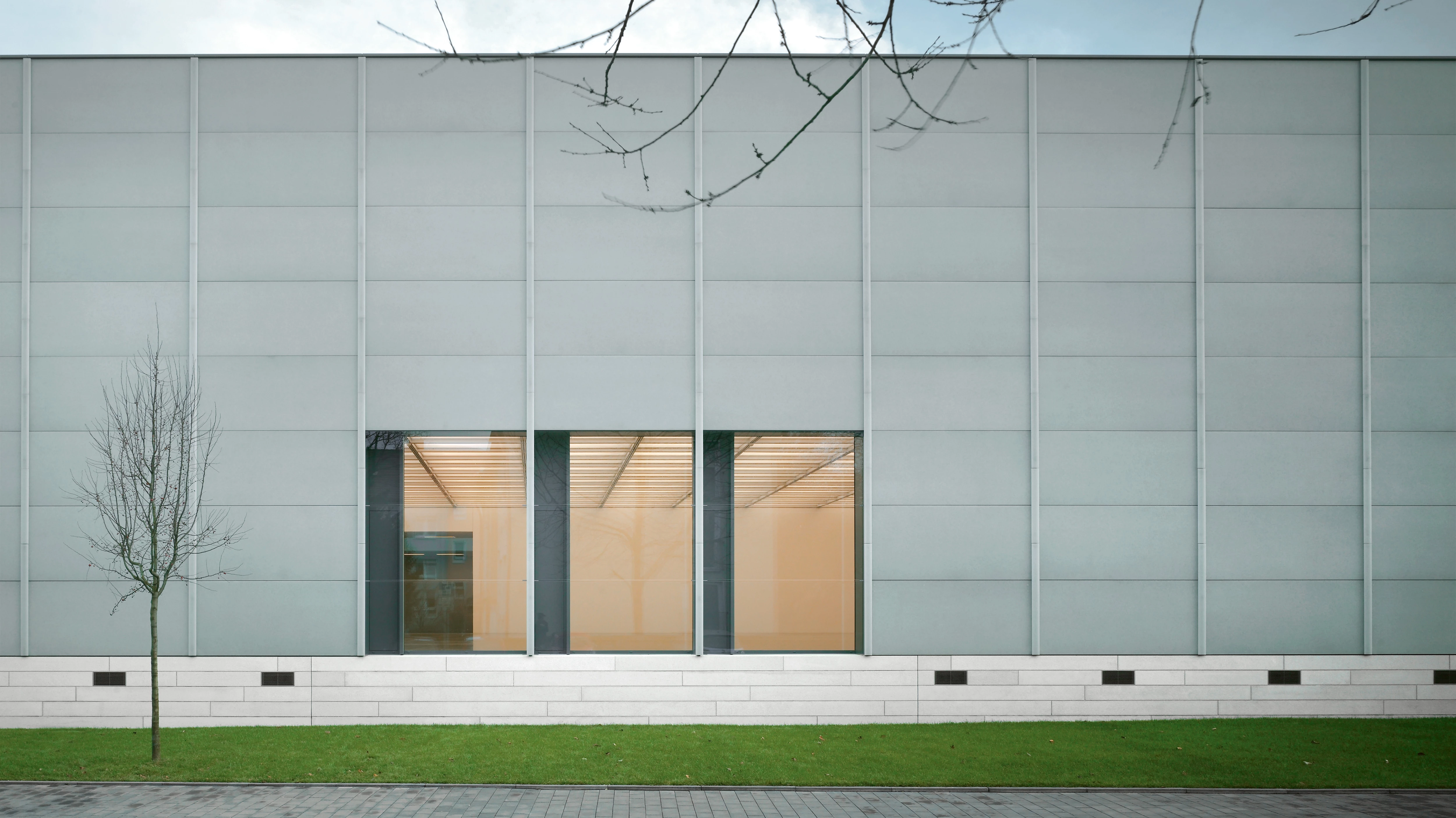 The translucent alabaster-like facade is made of large rectangular recycled glass slabs in a green hue that changes with light. Inside, polished screed floors similar in tone and texture to the concrete plinth create a sense of solidity and continuity. The adoption of the old wing’s ground-floor level in the new extension made it possible to create a ‘horizontal’ museum and preserve the qualities of the 1950s building. The publicly accessible areas connect seamlessly with the existing exhibition areas.