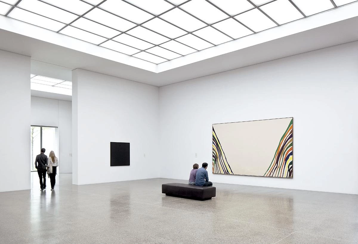 A generous open stairway leads from Bismarckstraße into the new foyer, which takes the form of an open interior courtyard with a restaurant and a bookstore, and is protected from the street by a glass facade. The temporary exhibition space is capped with a north-facing saw-tooth roof allowing diffused and variable illumination. A continuous grid runs across this vast space, forming part of the steel roof construction and providing a system for placing multiple partitions. This allows for a flexible reorganization of the space to cater for a wide variety of exhibition approaches.