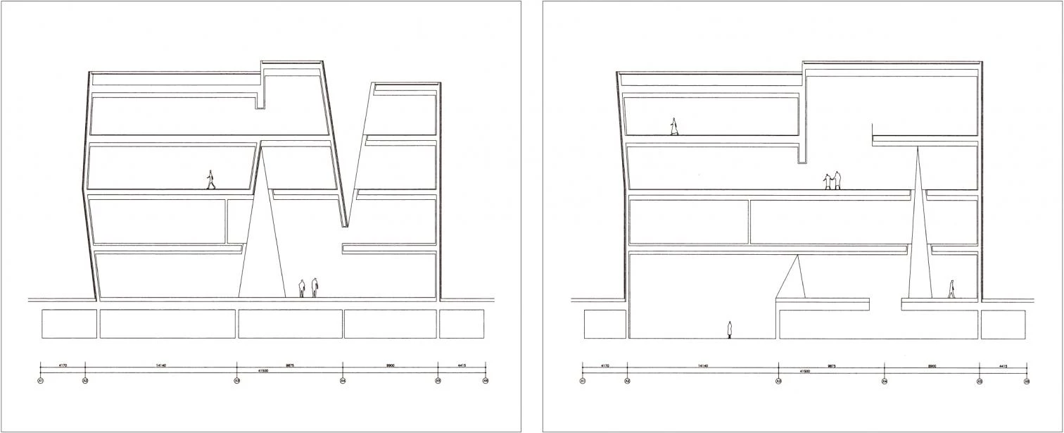 The program features, among other spaces, conventional exhibition areas and special rooms for more specific items or events, storage spaces, a reception with a multipurpose character to adapt to other uses, a cafeteria and a bookstore. The building is introverted, closing to the exterior to preserve the optimum conditions for artistic perception, and opens up selectively to the environment through cracks between the volumes. While these cracks are closed with glass, the exterior facades are covered with aluminum panels with a polished finish that reflects and blurs the environment, merging the museum building with the city, the park and the sky.