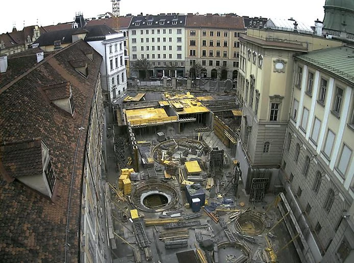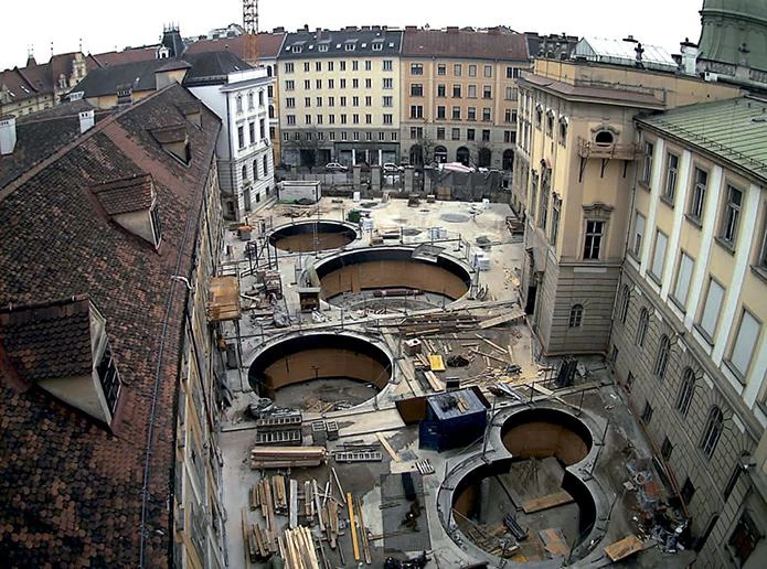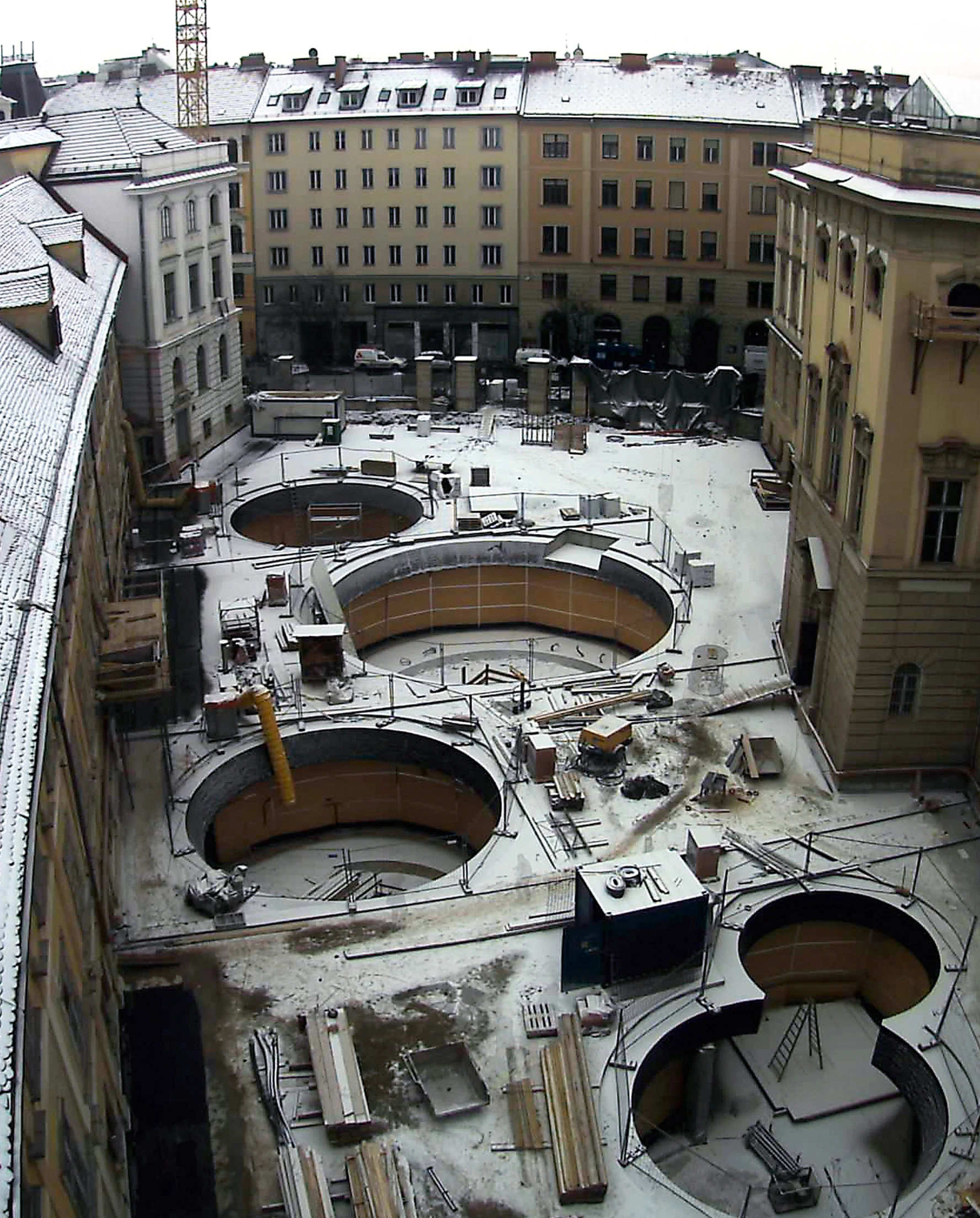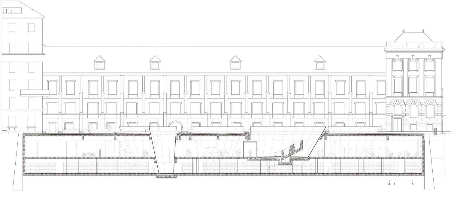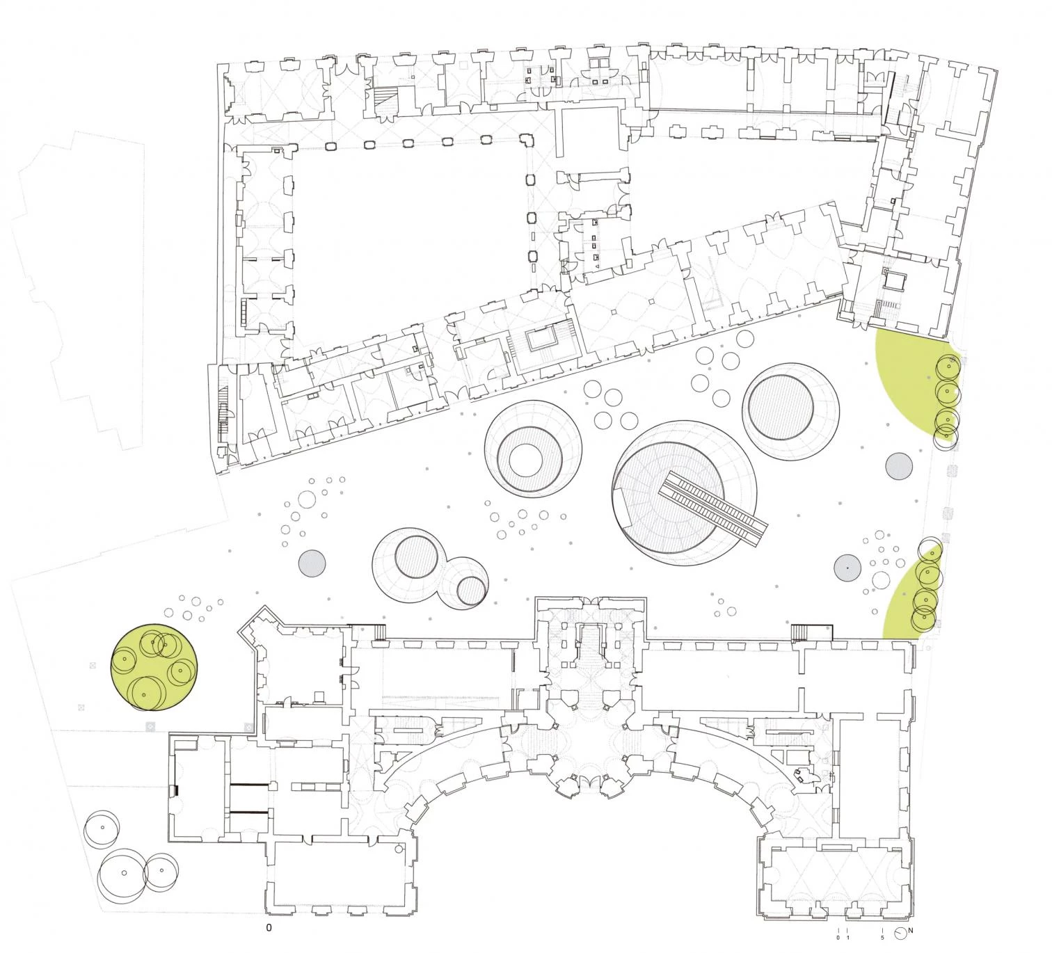 The Joanneumsviertel of Graz is formed of three buildings of different periods and uses that up to now gave their back to one another and towards a residual rear courtyard: the Museum of Natural History – from the 18th century –, the Regional Library of Styria and New Gallery of Contemporary Art, the latter built at the end of the 19th century. As organisms belonging to the same institution, the project set out the need to endow the complex with a common access, welcoming spaces, conference hall, reading areas and services, aside from a lower level for archives and storage. Instead of falling into the temptation of developing an iconic intervention, as has often happened in recent extensions of existing museums, the project meant, however, a unique opportunity to carry out an at once urban and architectural transformation. If the historic center of Graz is known for its expressive roofscape, our proposal develops entirely below ground: we simply define a new pavement that as a large carpet takes up the whole exterior space between buildings and conceals below ground the spaces that house the required program. This decision allows acknowledging the value of the existing historical constructions – carrying out a refurbishment that is respectful towards their architectural characteristics – which acts only punctually in some interior areas without affecting the original exterior image and volume. The horizontal continuous surface of the new square is marked by a combinatorial series of circular patios that bring natural light into the underground spaces and house the entrance, the lobby and shared areas of museums and library, a gathering place from which to reach each one of them.