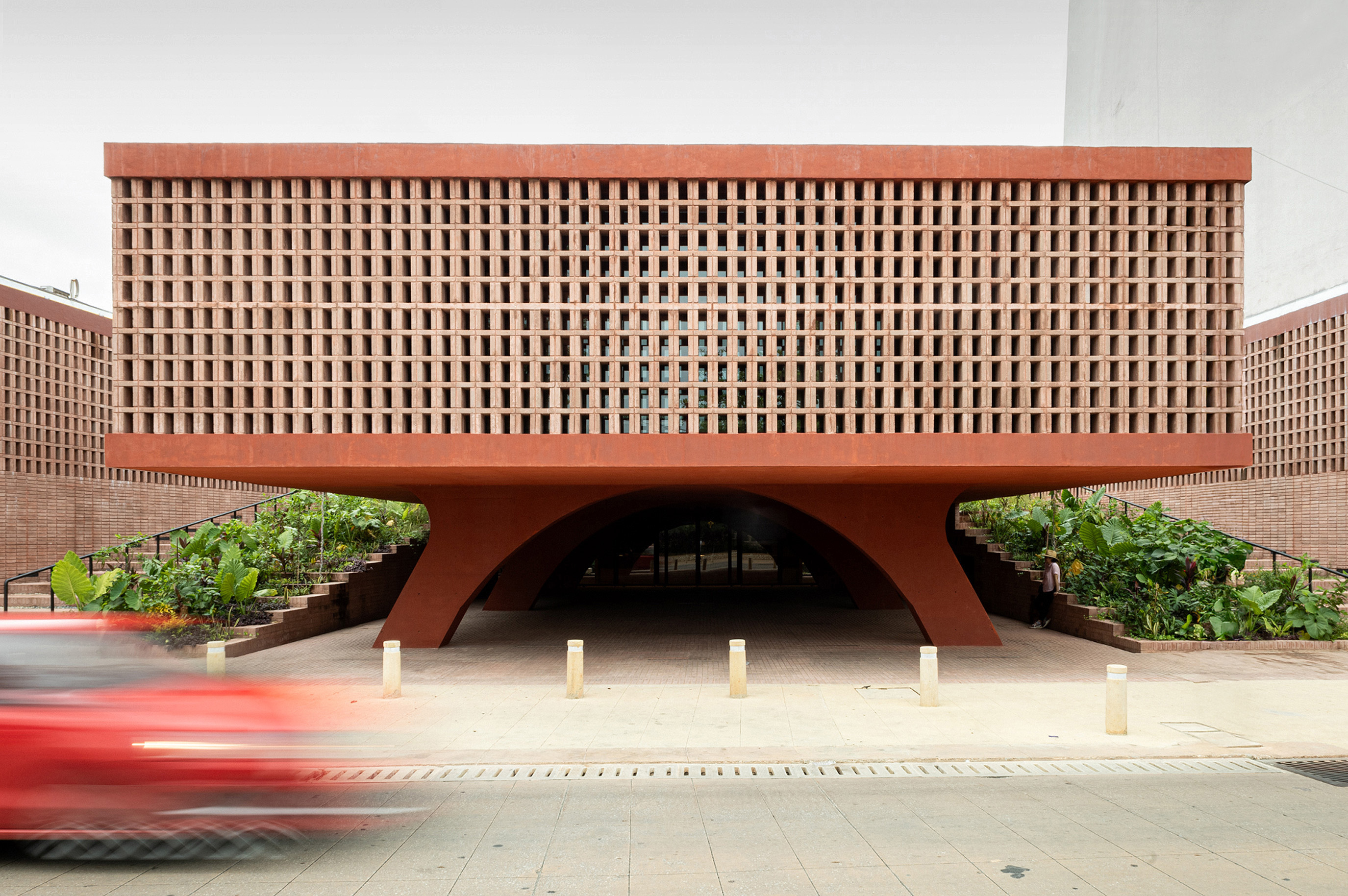 In terms of materials, the project – which covers a total area of 1,150 m² – is characterized by the predominant use of red-pigmented concrete, visible in its structure, combined with latticework, clay, glass, and ironwork elements. This palette is enriched with vegetation endemic to the banks of the Grijalva River, allowing the building to blend into its urban and natural surroundings.