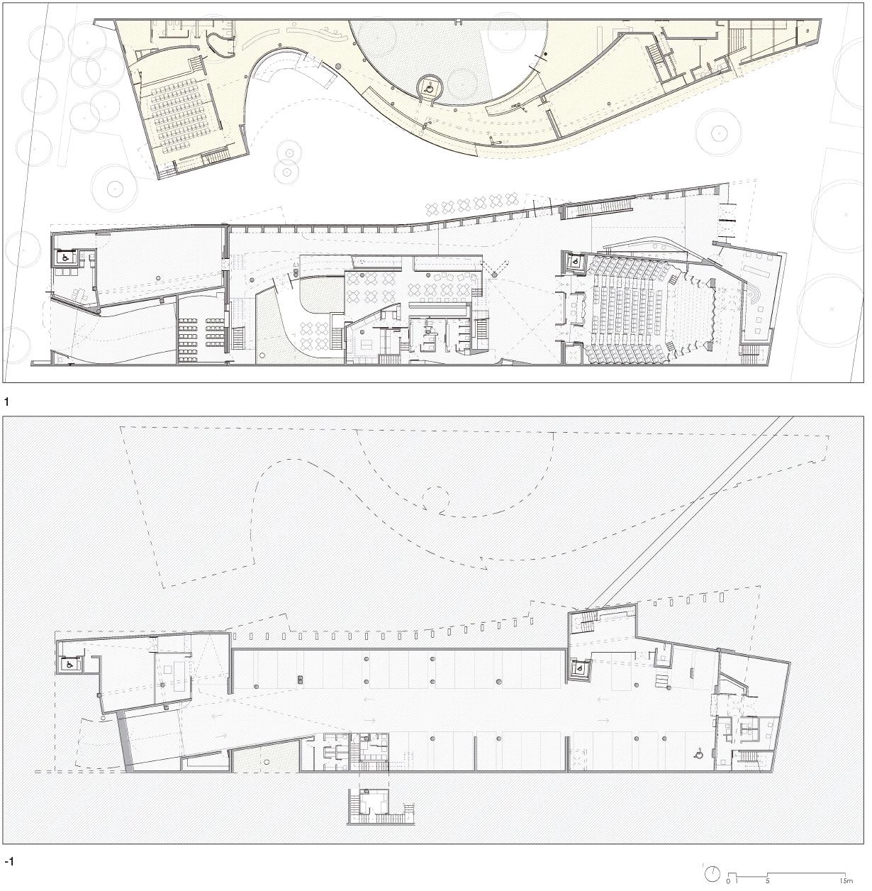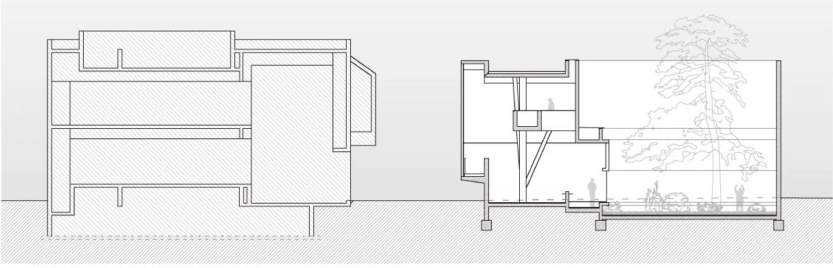 A small auditorium for 100 spectators takes up the west side of the itinerary, and the exhibition galleries in two levels are on the east. The offices and archives, on the second floor, are situated between the exhibition area and the auditorium. In the outdoor zones of the second level parks extend the vegetation of the central courtyard. The idea was to have the green cover the interior facades of the patios, hiding the architecture and revealing a vegetal universe, a reflection of the humid and cold jungle of southern Chile, which Violeta Parra loved so much.