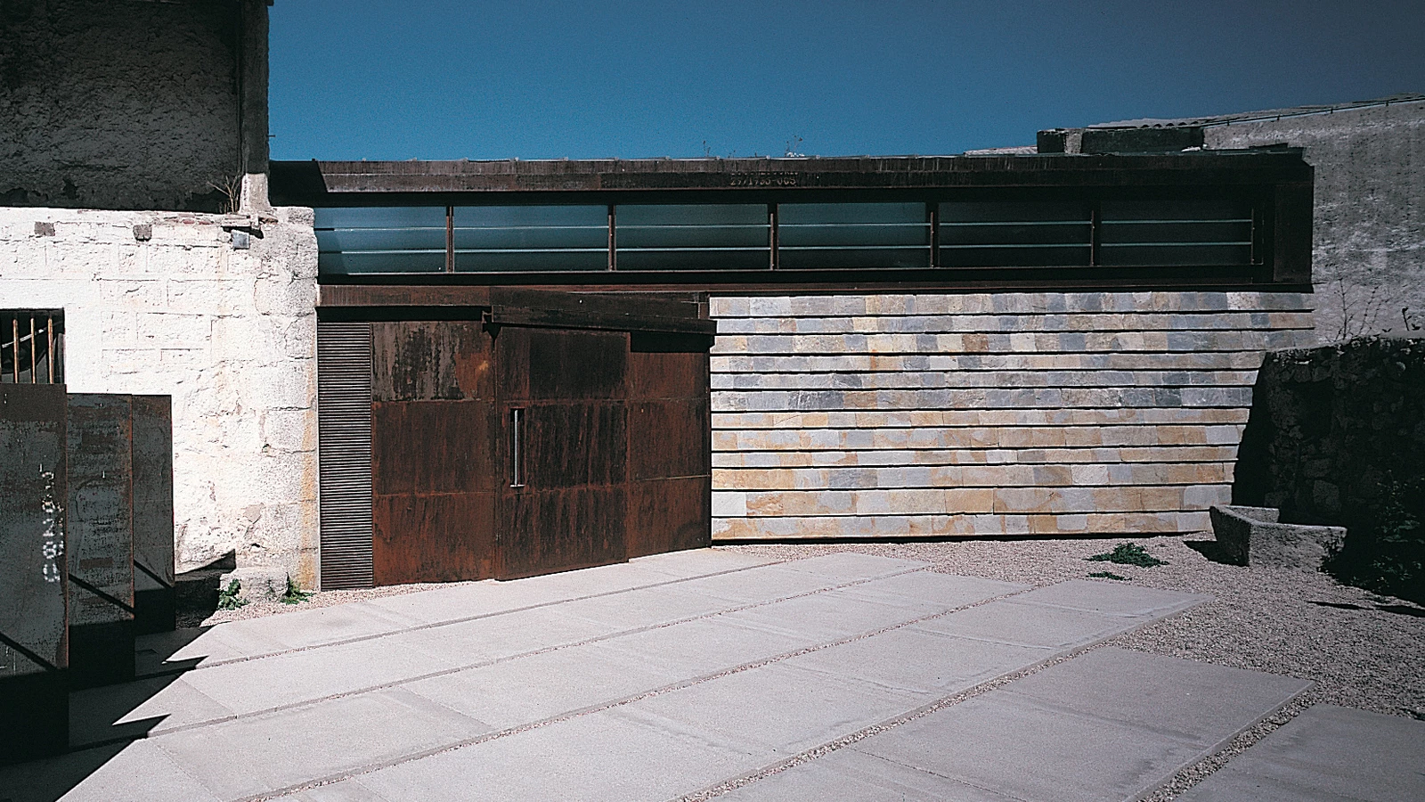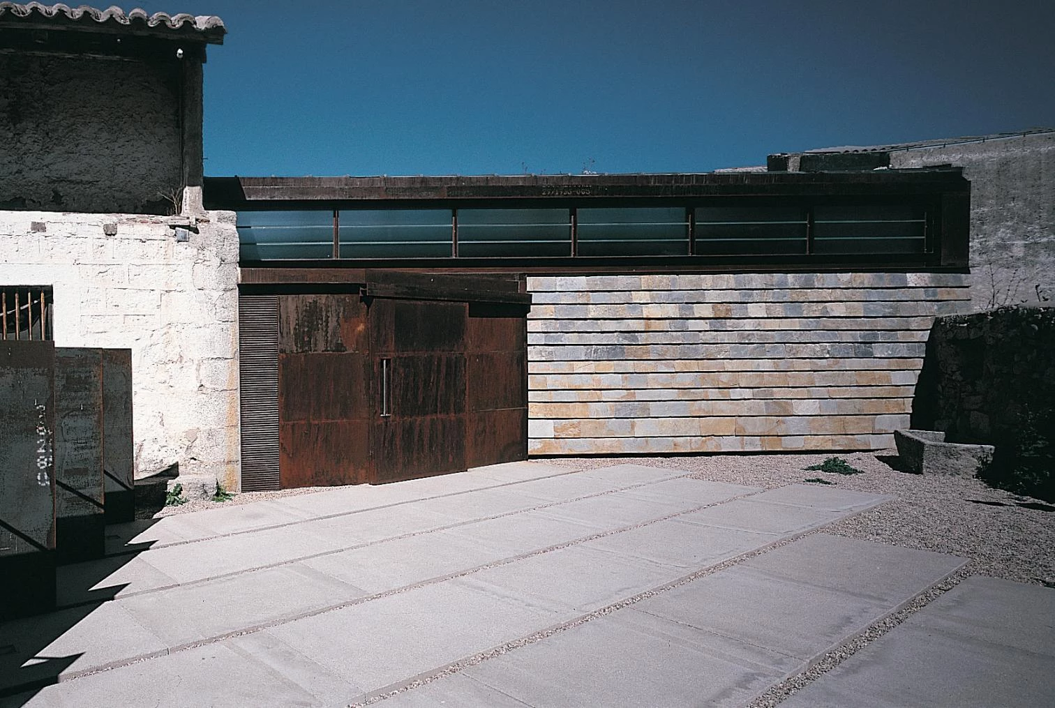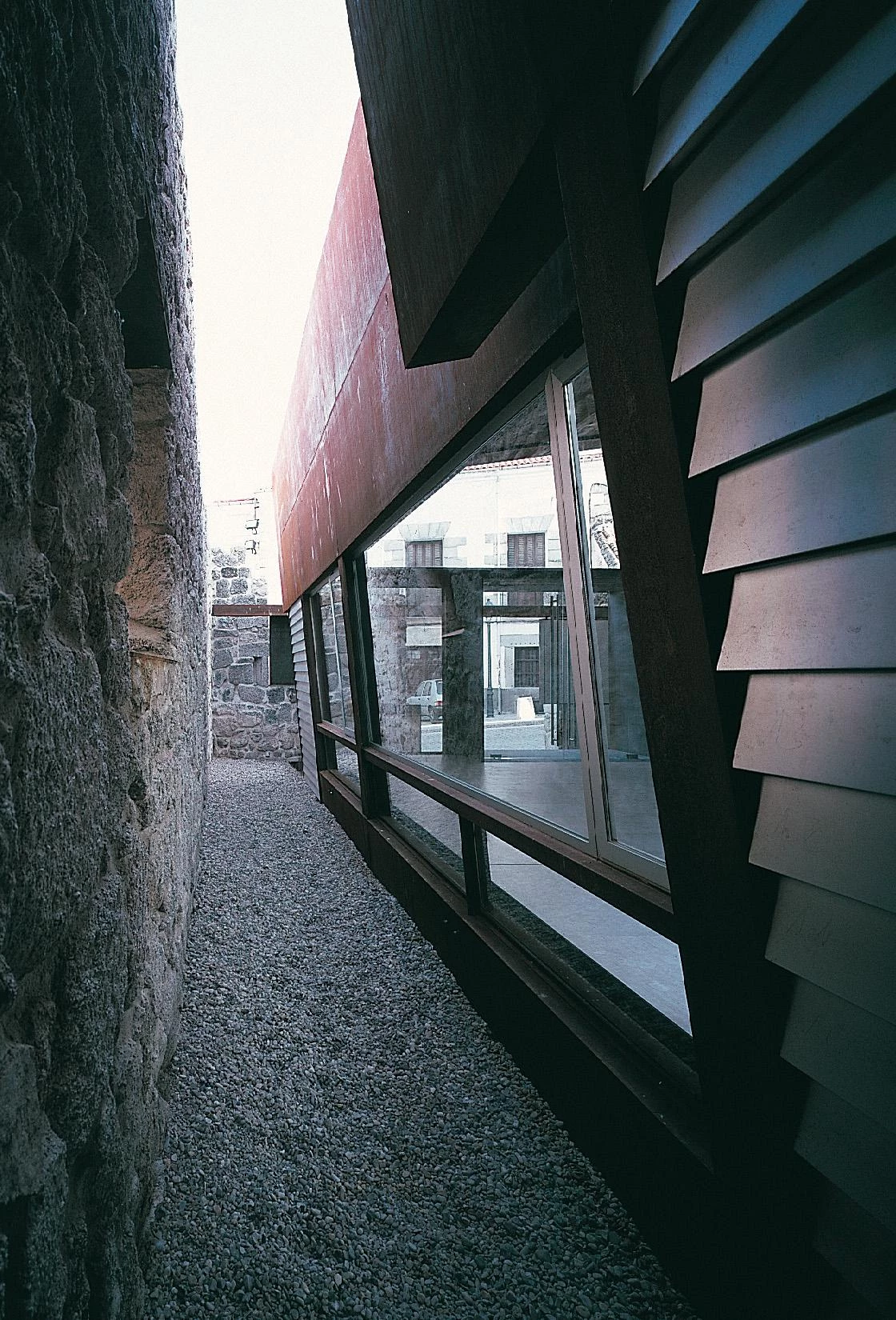 One of these examples is the ‘house of Maestro Almeida’ – next to the square by the same name –old headquarters of the school of Latin and Humanities since it was founded in 1722, where the studies that preceeded the higher education were taught. As an annex to the main house, a winery where the grapes where pressed and the wine stored has now been transformed into a small museum which explains the traditional production of wine. Preserving and strengthening the existing walls, the construction has been provided with a roof supported by metallic pillars. These Core Ten steel parts support the beams of laminated pine tree wood upon which the plywood boards that constitute the interior extrados of the roof rest. A zinc sheeting with a heavy gray finish forms the exterior protection of this sloped plane that is separated from the perimetral walls with two strips of industrial glass to illuminate the interior. The small courtyard of access has been equipped with concrete slabs that simply rest on the ground and that will make possible a new layout of the garden whenever the total restoration of the main house is undertaken.