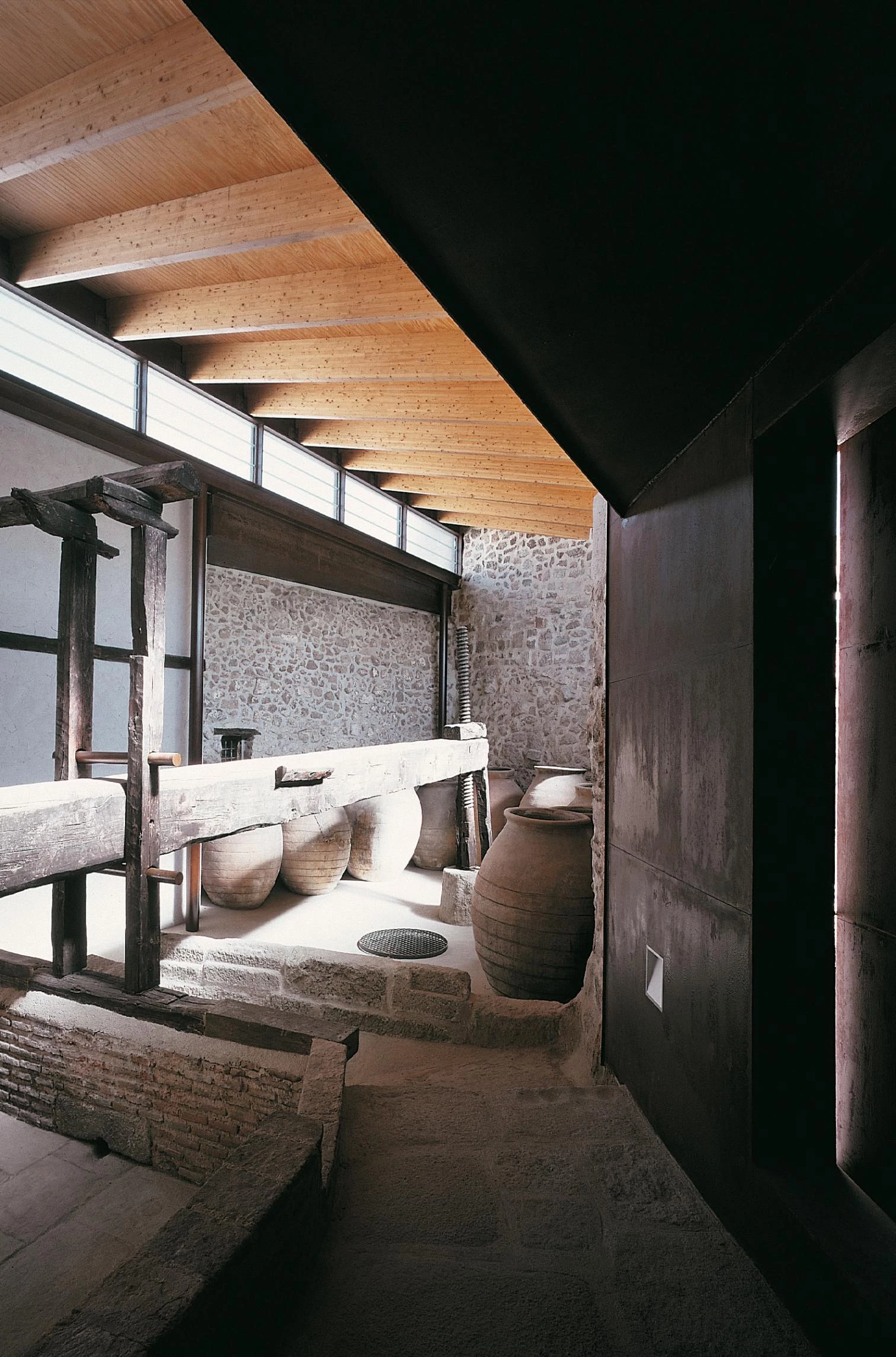 The winery of the ‘Casa del Maestro Almeida’ houses the wine museum; after consolidating the preexisting walls, the space has been closed with a roof of laminated wood beams on pillars of Core Ten Steel.