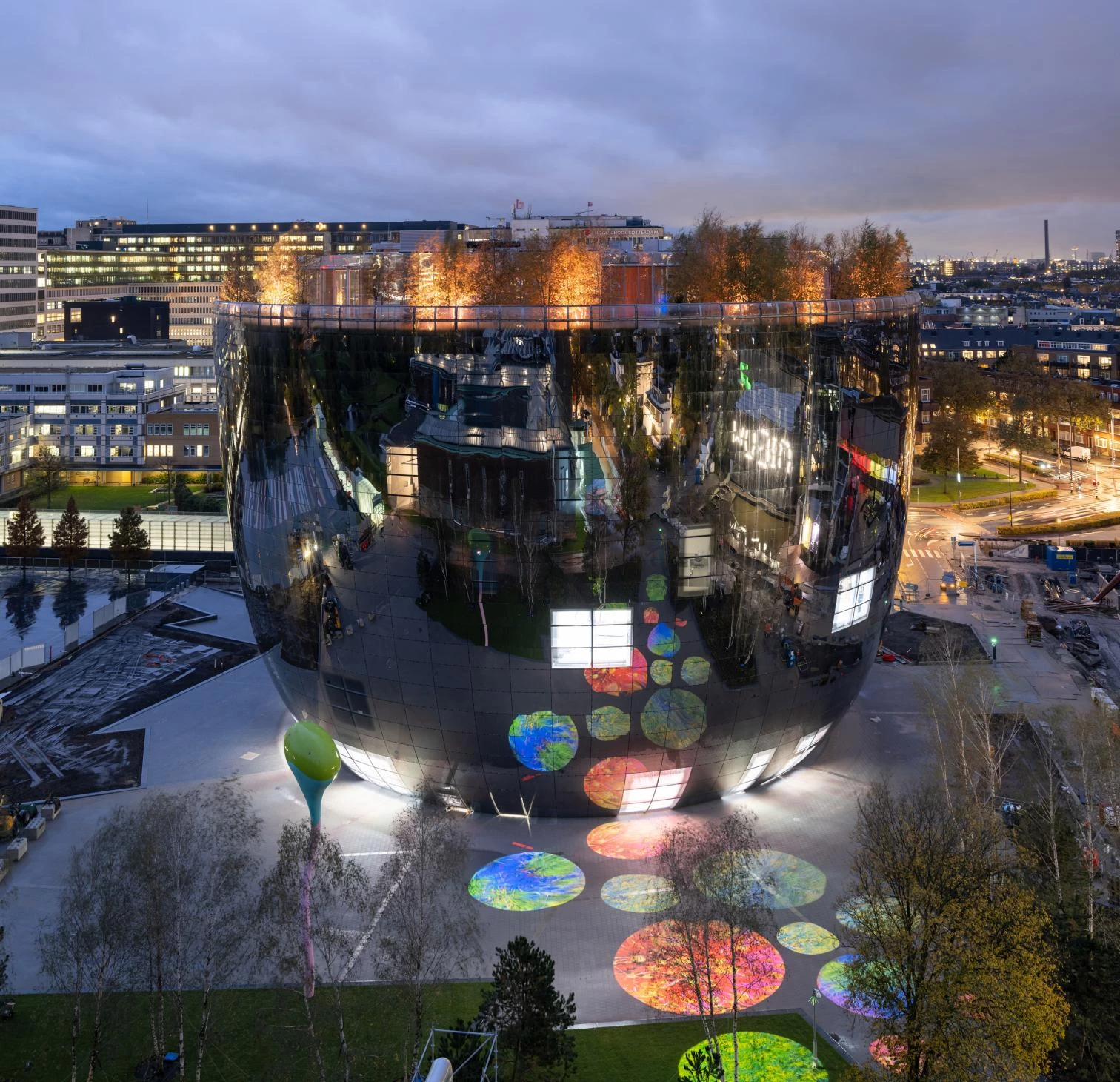 Storing over 151,000 artworks, Depot Boijmans Van Beuningen opens to the public in Rotterdam (6 November 2021), a work of the Dutch firm MVRDV. The outcome of a competition held in 2014, the 15,000-square-meter construction rises in the north part of Rotterdam’s OMA-designed Museumpark. The curving facade comprises 6,609 square meters of glass subdivided into 1,664 mirrored panels, which, because they reflect the surroundings, help to mitigate the building’s visual impact. The compact, bowl-shaped volume has a small footprint and a generous rooftop terrace 35 meters above the ground.