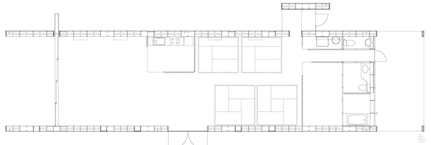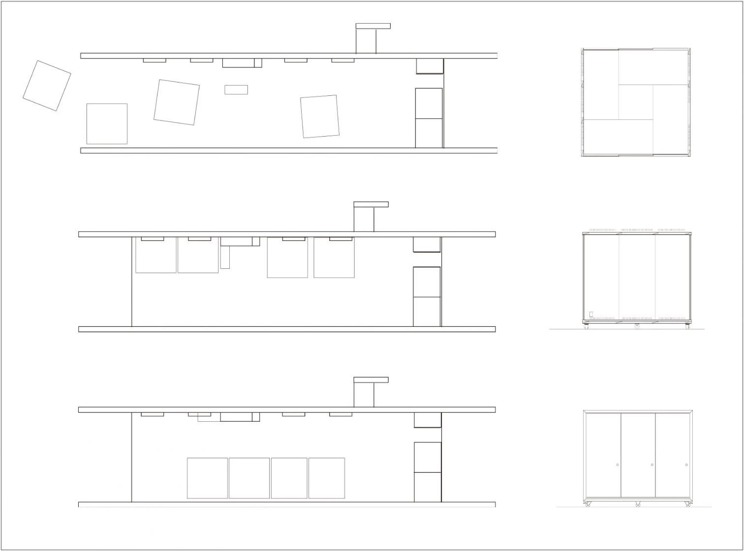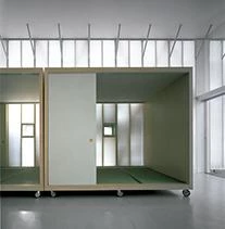 The house is designed as a single double-height space with four rooms on wheels that can be moved freely. To warm or cool the units, they only need to be placed by the walls, close to the heating or air conditioning vents. The flexible plan of this house – where only the kitchen and bathrooms have a fixed location – allows to line up the rooms to create larger spaces, or gathering them all in the terrace to enjoy a large free-flowing space. To reduce the weight and optimize movement, the individual units are small and have no complements or storage spaces.