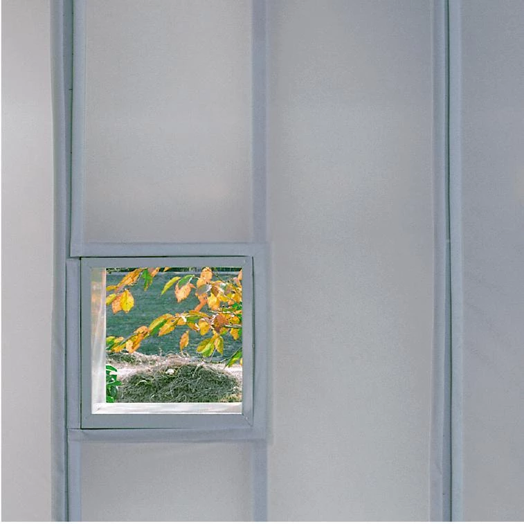 The outer face of the wall consists of two layers of fiber-reinforced corrugated plastic and the inner face is made of nylon fabric. Both are fixed on wood frames with plastic bags filled with polyurethane foam between them. This stratified enclosure thermally insulates the interior and filters light.