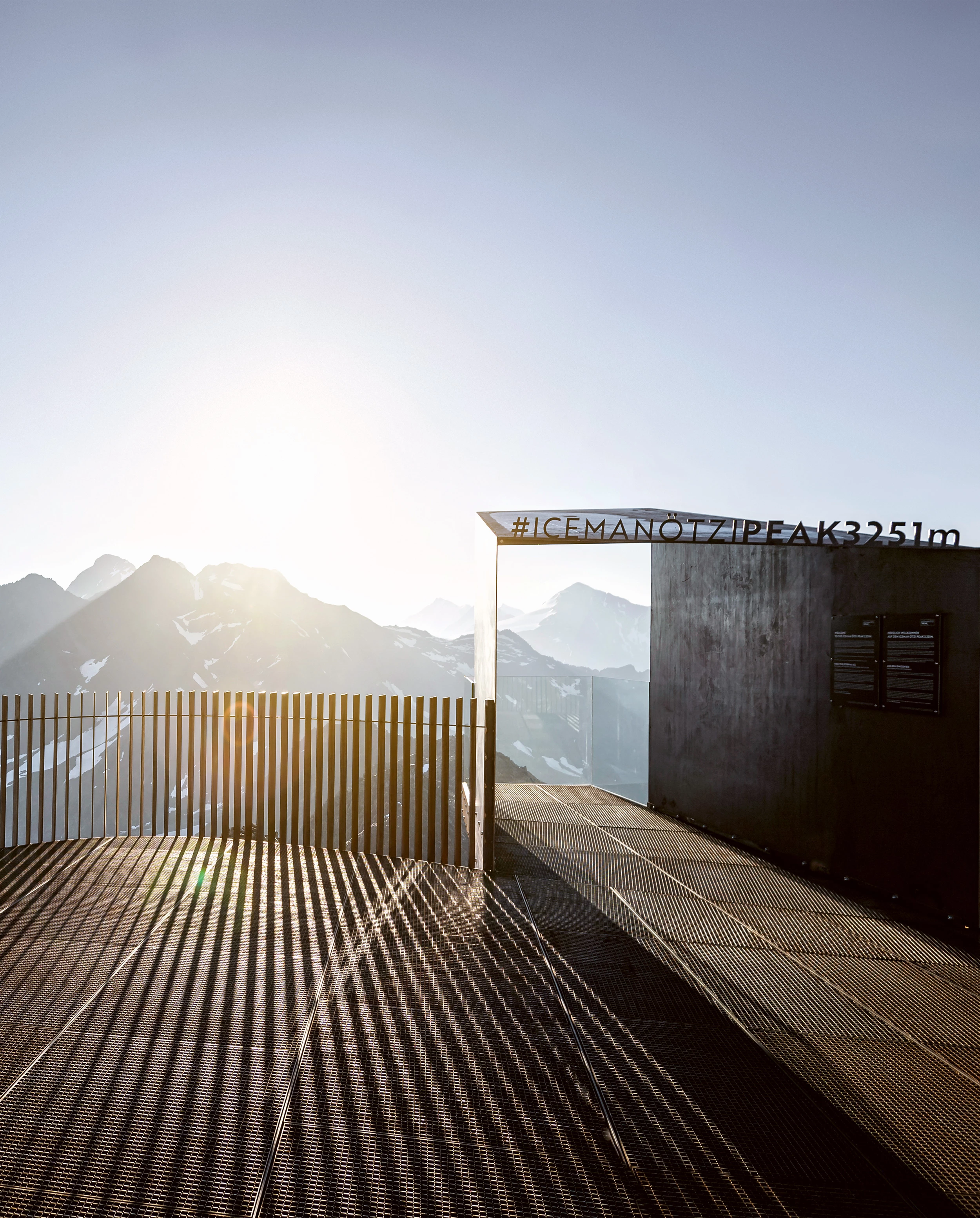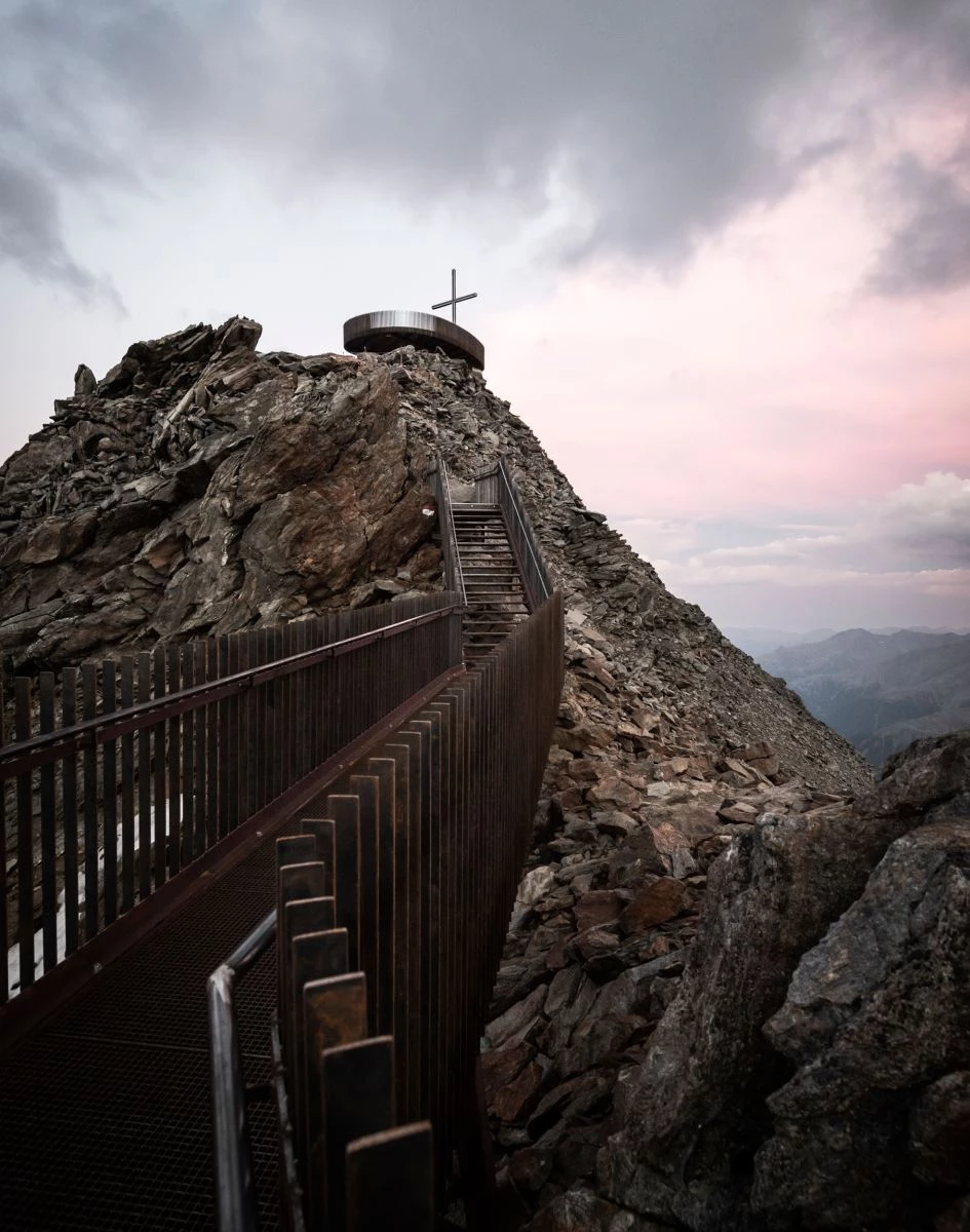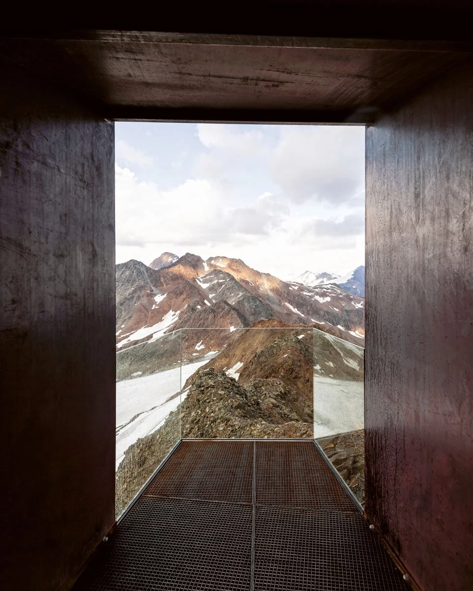 At the top of the Schnals Valley glacier, at an elevation of more than 3,000 meters, an observation deck invites excursionists to climb and take in some breathtaking views of the Tyrolean Alps and abrupt landscape. Following the natural topography of the ridge, a light structure of CorTen steel is raised over the ground to cantilever towards the void. A parapet built with vertical metal lamellas slightly set apart from one another adapts to the sinuous perimeter of the deck, forming a sequence of opening and closing vistas that, as the visitor moves, reveals changing perspectives of the mountain range.