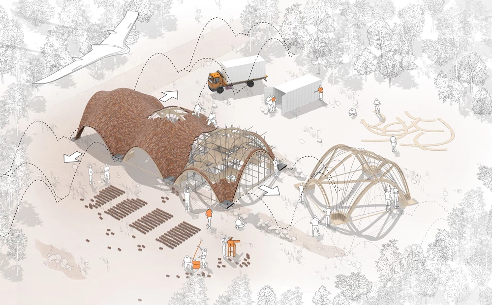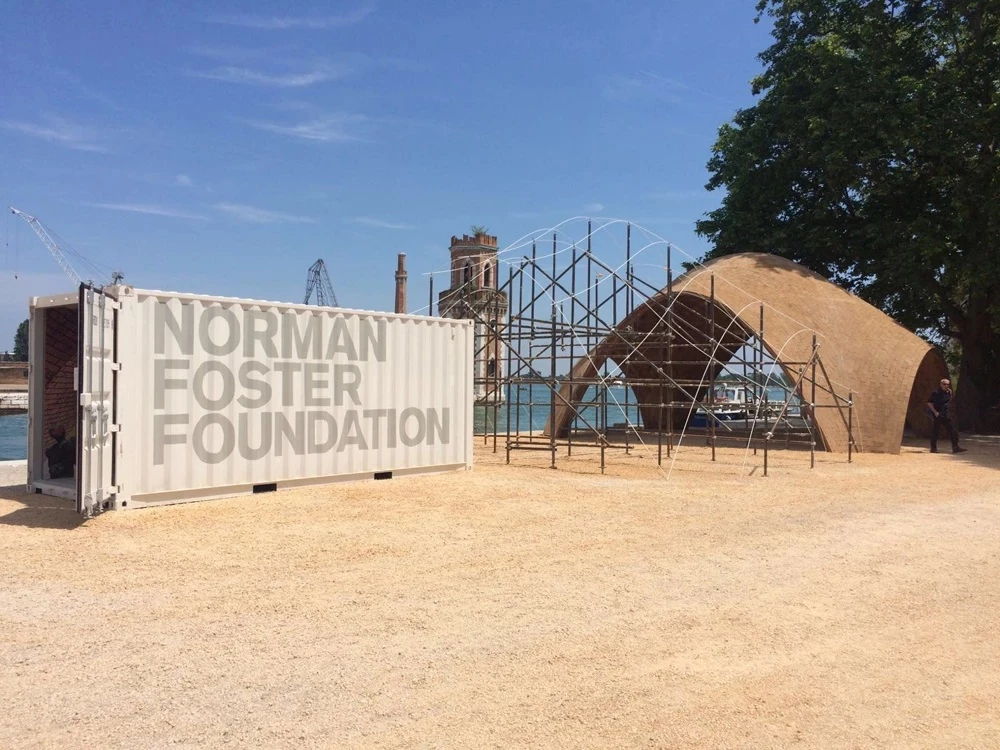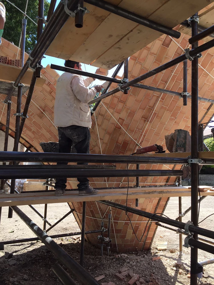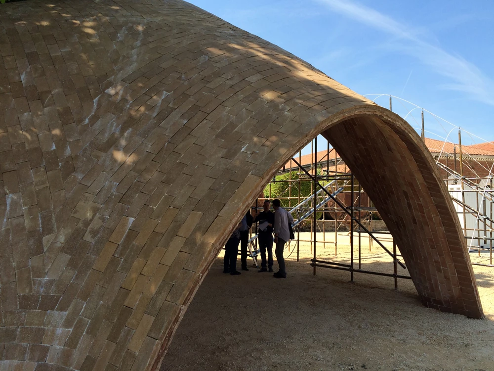 On view at the 15th Venice Architecture Biennale, in the Arsenale, is The Norman Foster Foundation’s first full-scale prototype of a hangar for drones, conceived for use in distributing medical supplies in Africa. The vaulted pavilion is built with two outer layers of ‘Durabric,’ a new kind of block of earth, compacted with cement, that has been developed by the LafargeHolcim Foundation. In a provisional feasibility study done under Professor Santiago Huerta Fernández, a medium-sized vault was built at the Universidad Politécnica de Madrid. The study was carried out by Carlos Martín Jiménez, a master mason, who participated in the project in collaboration with two MIT students, Sixto Cordero and Luisel Zayas. Also on the team were Víctor Segundo, Simba Lasluisa, and Luis Tituana, and everyone traveled to Venice to set up the actual pavilion.