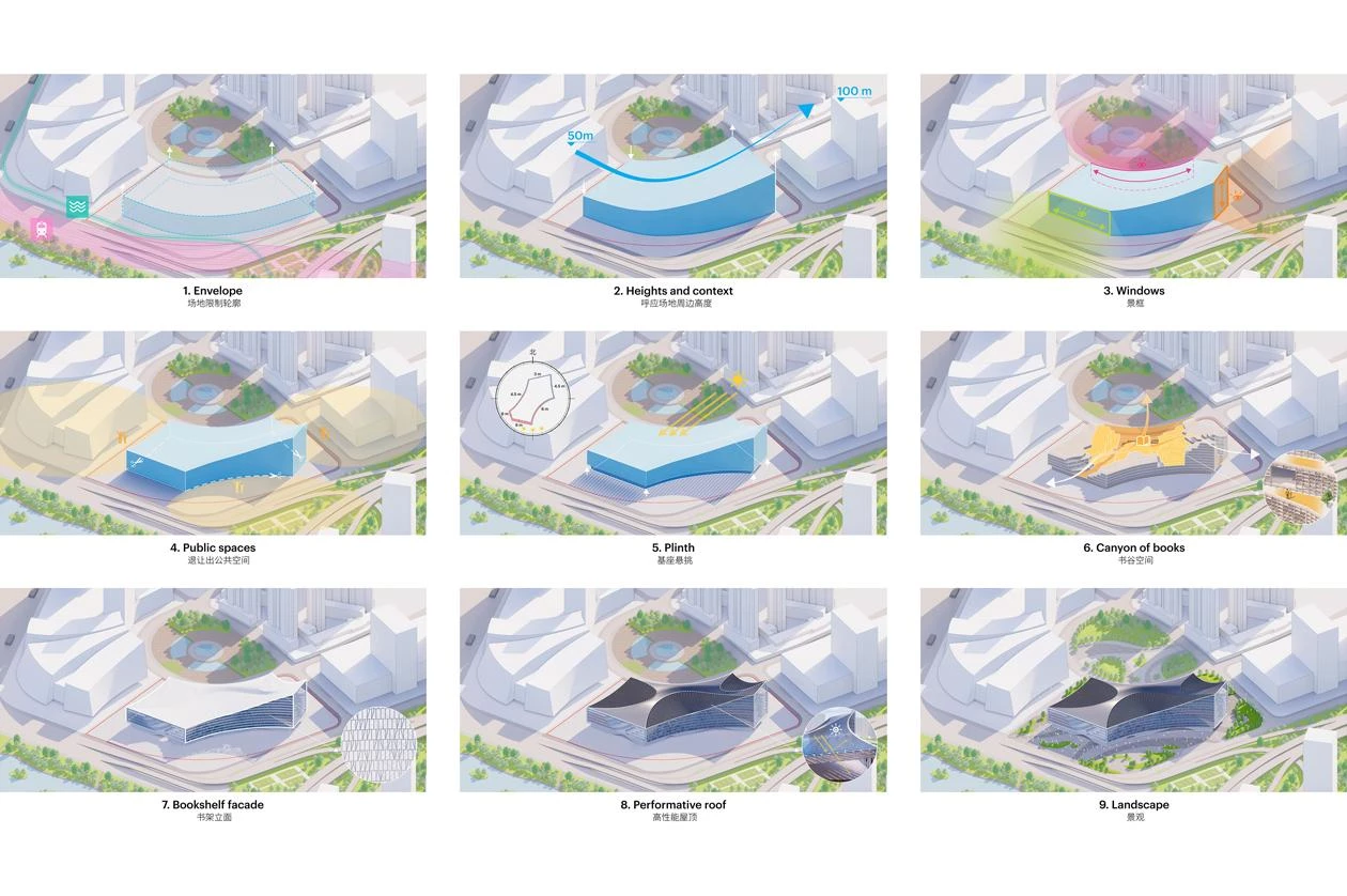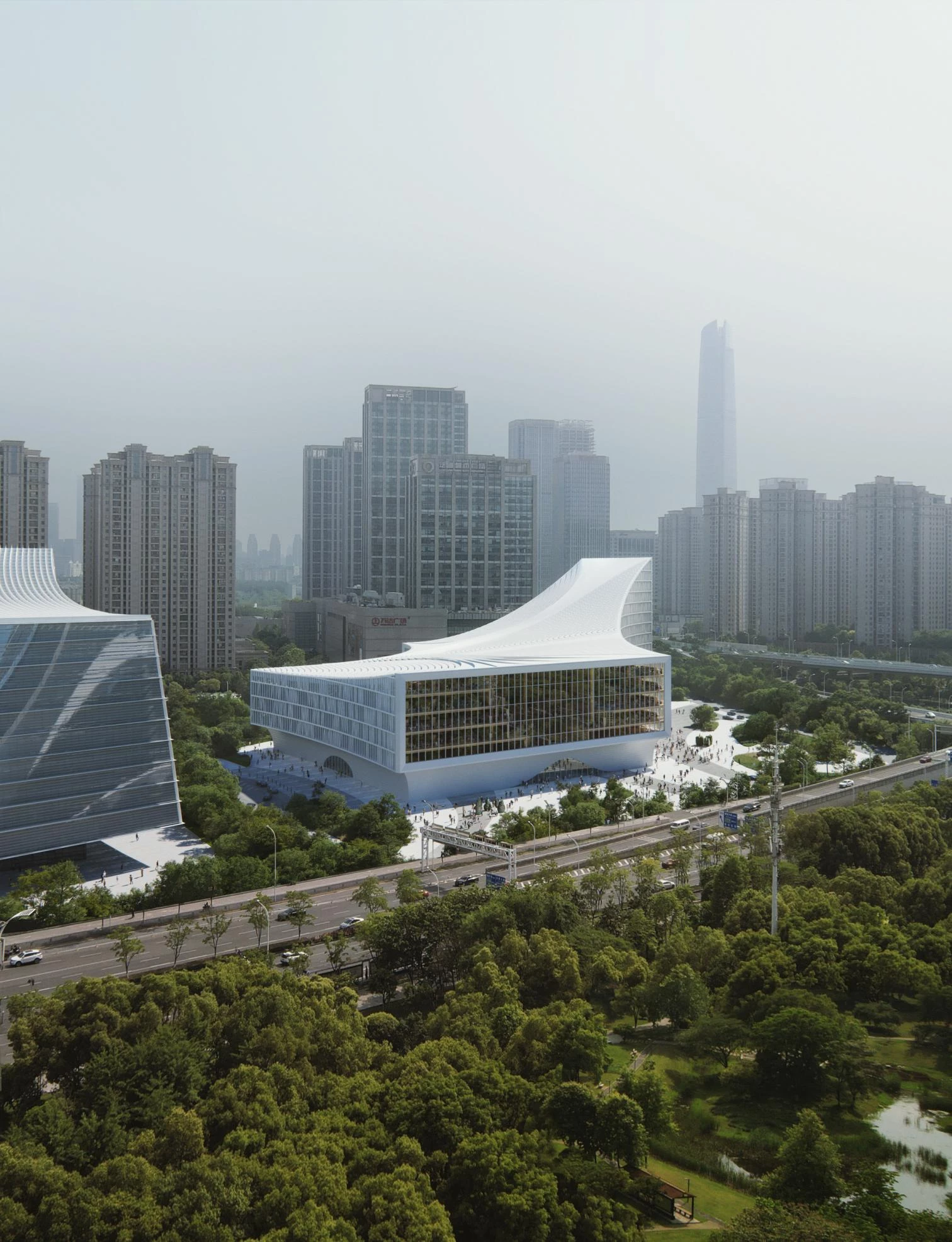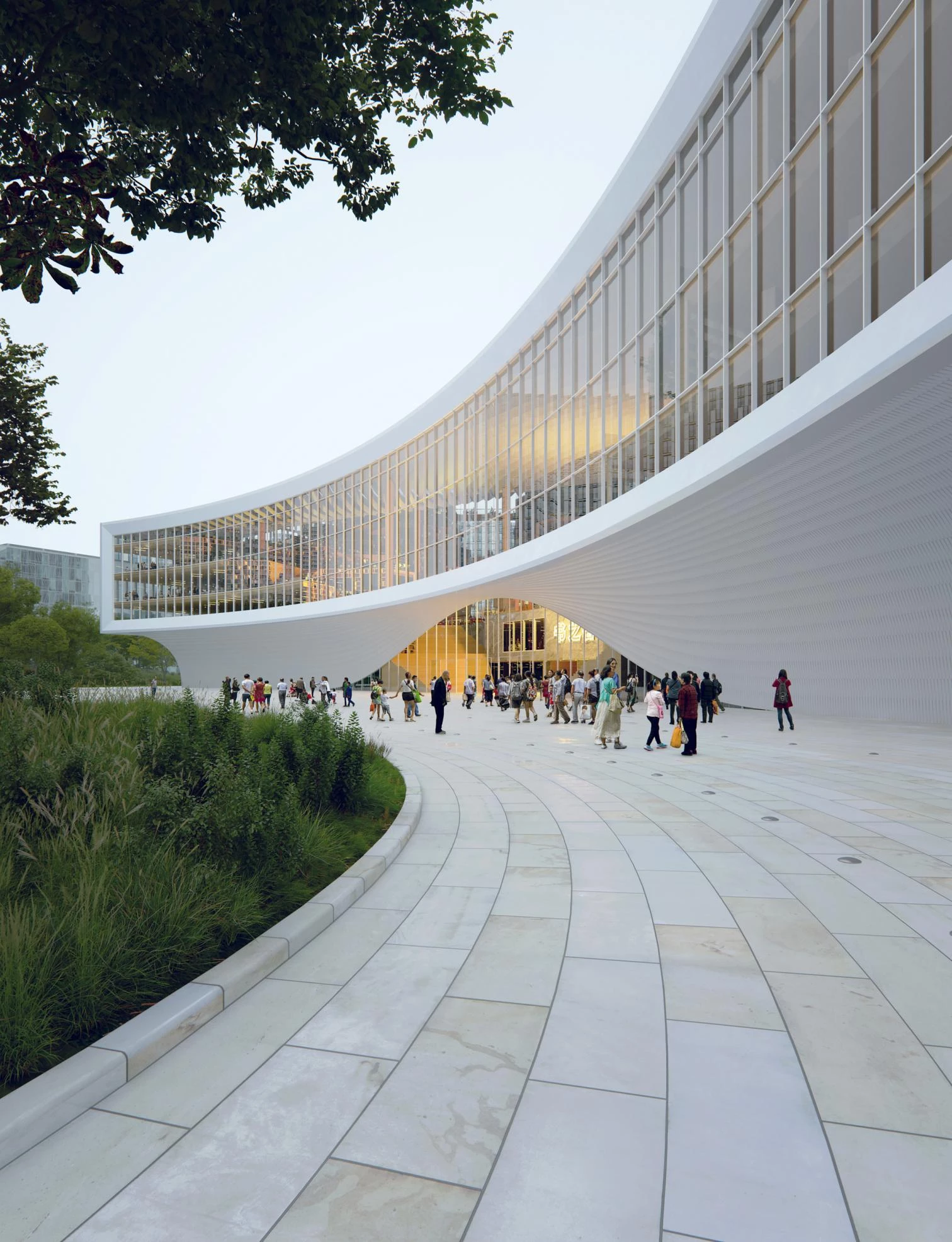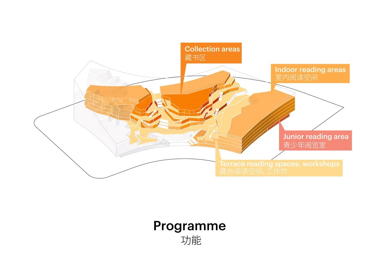 The design is based on the city’s geography. The Yangtze River and its longest tributary, the Hanjiang, flow through Wuhan, which also has the country’s largest urban lake, the Donghu, taking up a quarter of its urban area. The project is a sculptural composition of fluid forms both outside and in, and makes allusions to the different heights of the buildings around, including skyscrapers.