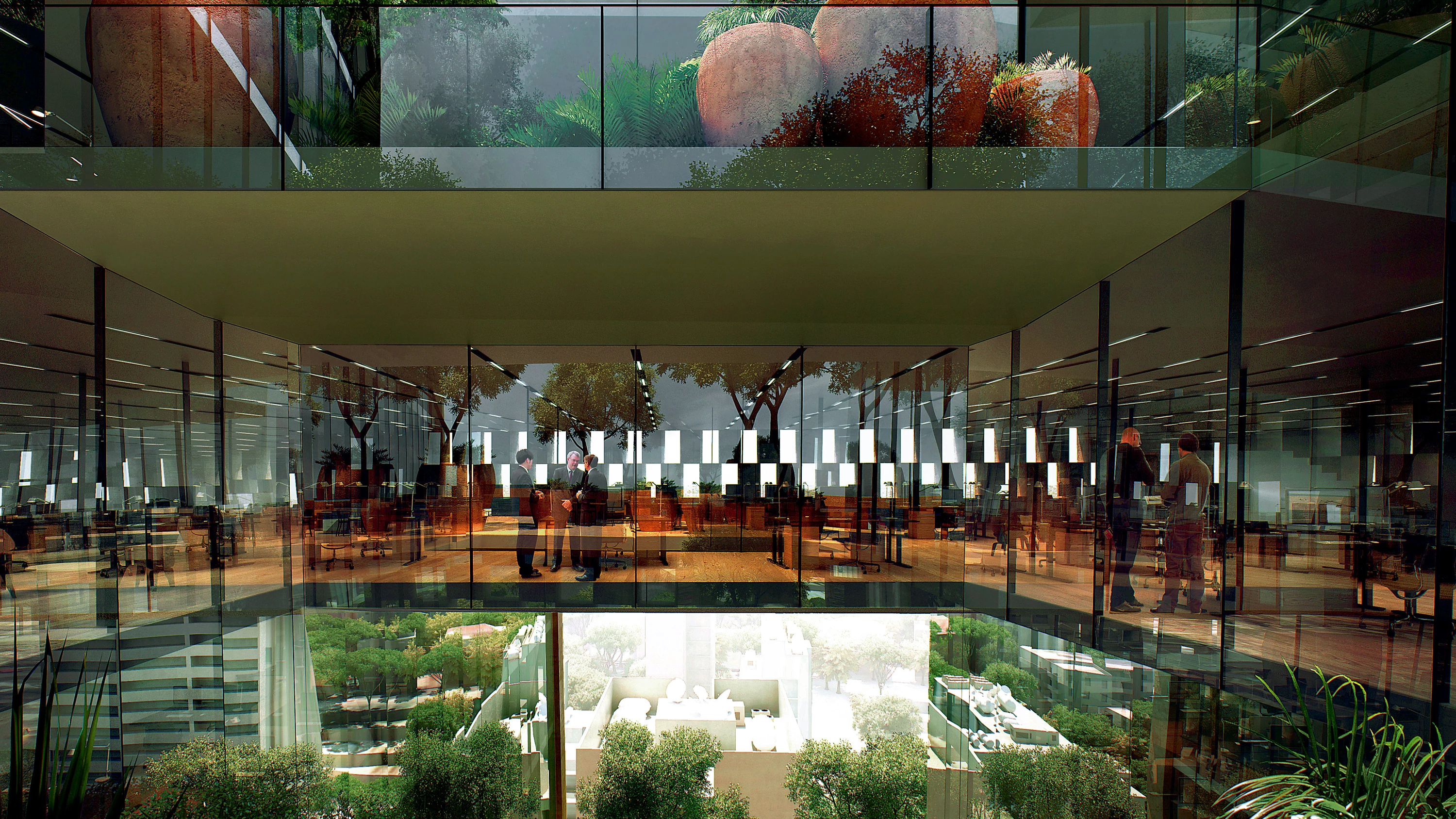 In order to create an authentic community, and not only an office building, the volume is carved generating a series of terraces. These outdoor areas act as social hubs, and the workspaces of the headquarters are organized around them...[+]
