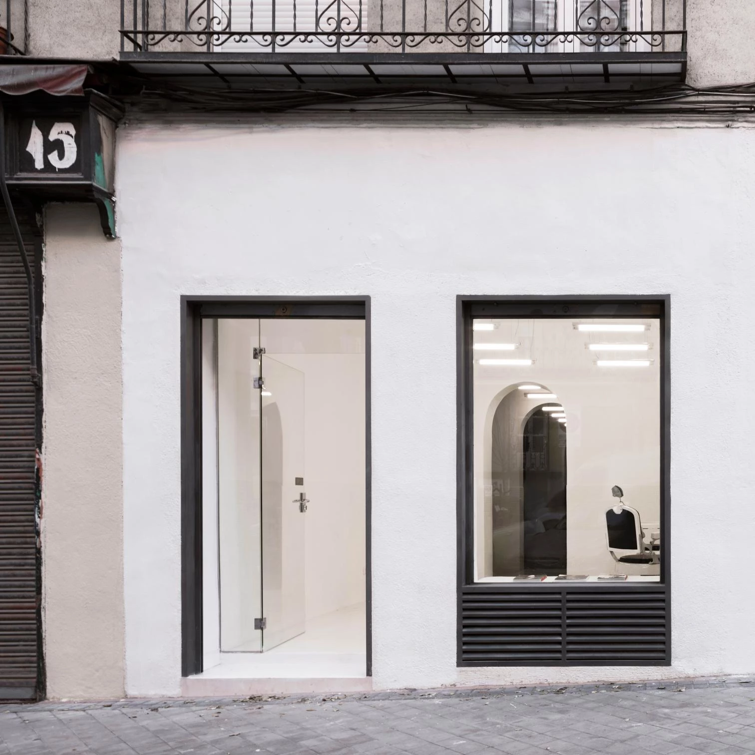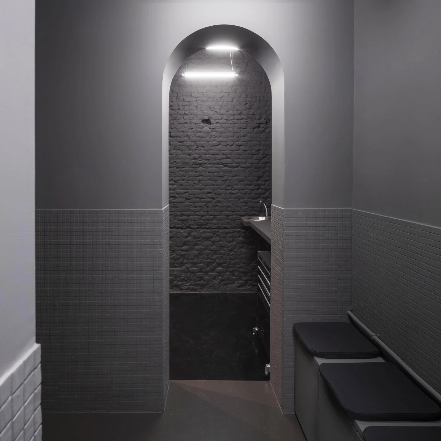 The arch in the existing wall was multiplied, giving rise to new partitions and creating the desired divisions between different activities, which are arranged along a gallery to make the most of the narrow premises. Hierarchy is achieved through the theatrical trick of the false perspective, in accordance with which successive arches decrease in proportion, producing the sense of depth of a Baroque artifice. The luminaires and the furniture elements—from hairdressing chairs and tattooing cots to cantilevering auxiliary worktopsؙ—are arranged along this enfilade.