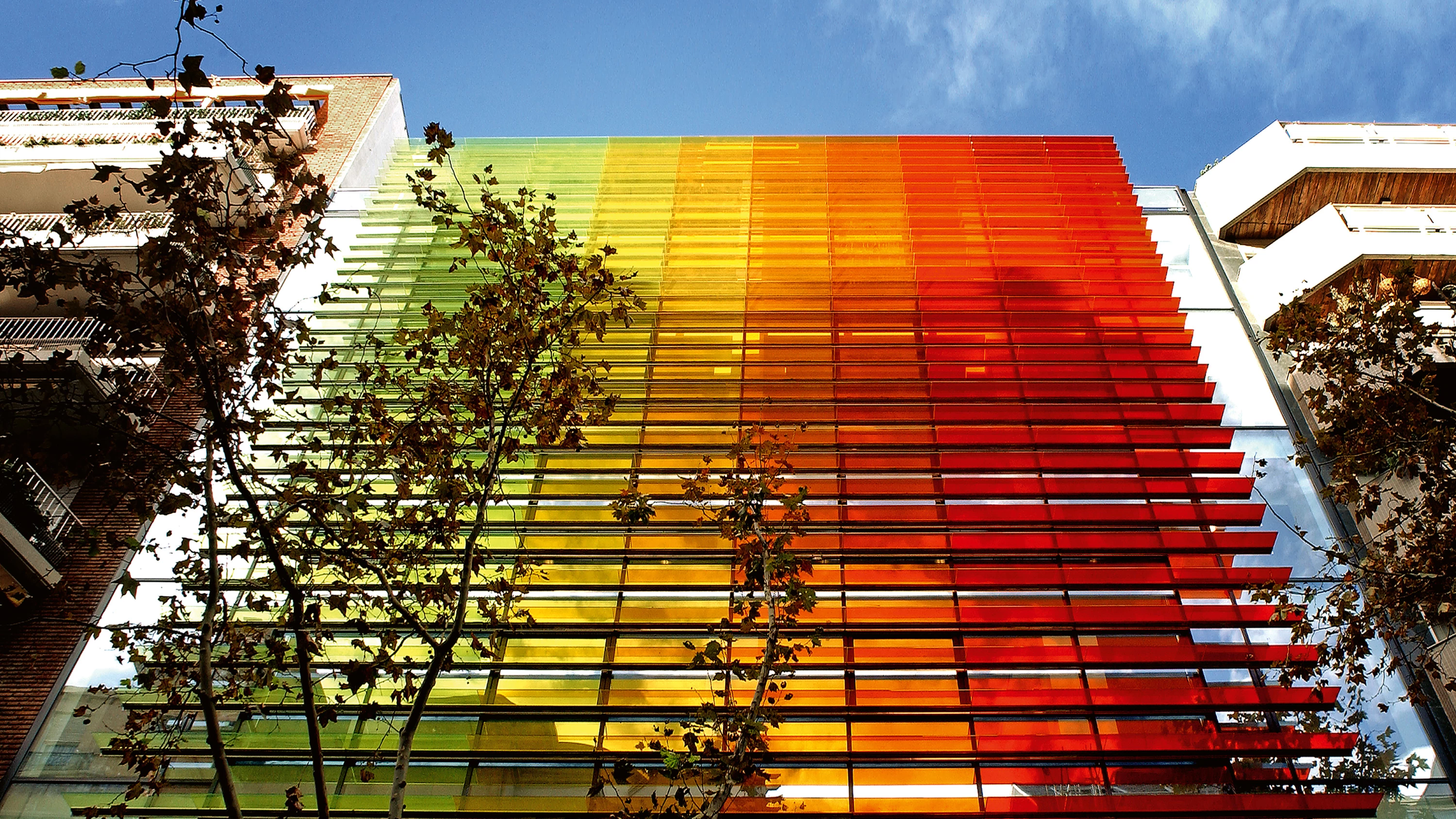 The color on the street facade gradually spreads upwards, across horizontal parasols of transparent colored glass to form a plane that floats without a precise boundary in front of the wall, in the manner of a huge city-scale blind that borrows its colors from the omnipresent balcony awnings in the vicinity.