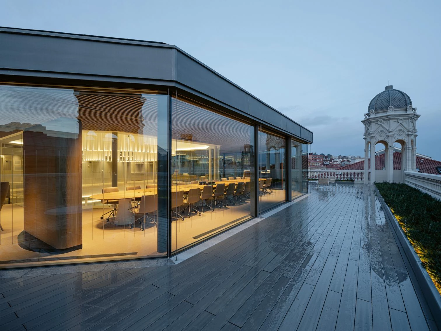 The building is topped off with a multipurpose space, which will be used as a breakout area and space for talks, presentations, etc. This level can be used both by the bank staff and by its clients, and has a direct access from the Calle del Medio. The terrace offers panoramic views and gives a new use to the four small arbors on the corners of the original building.