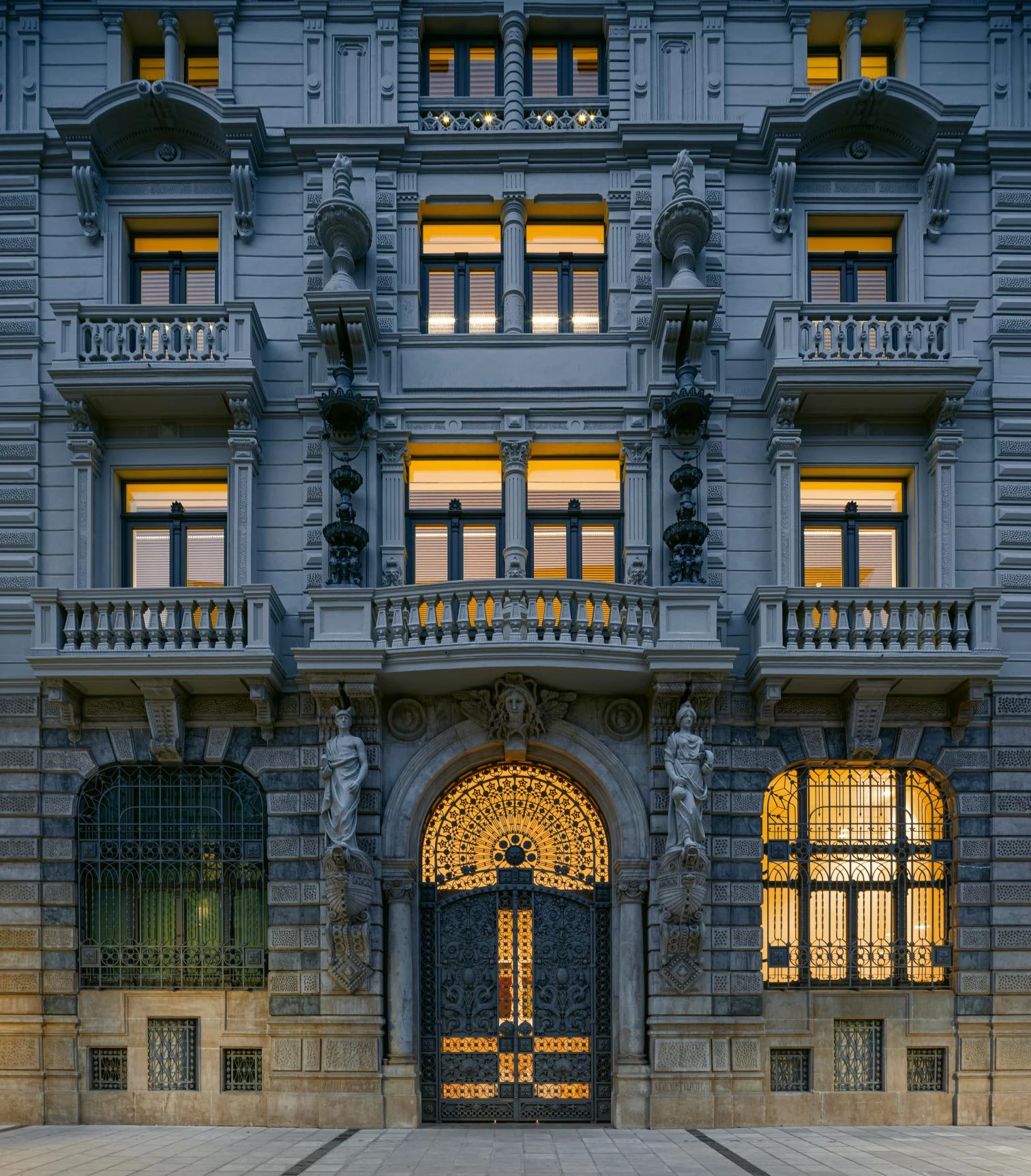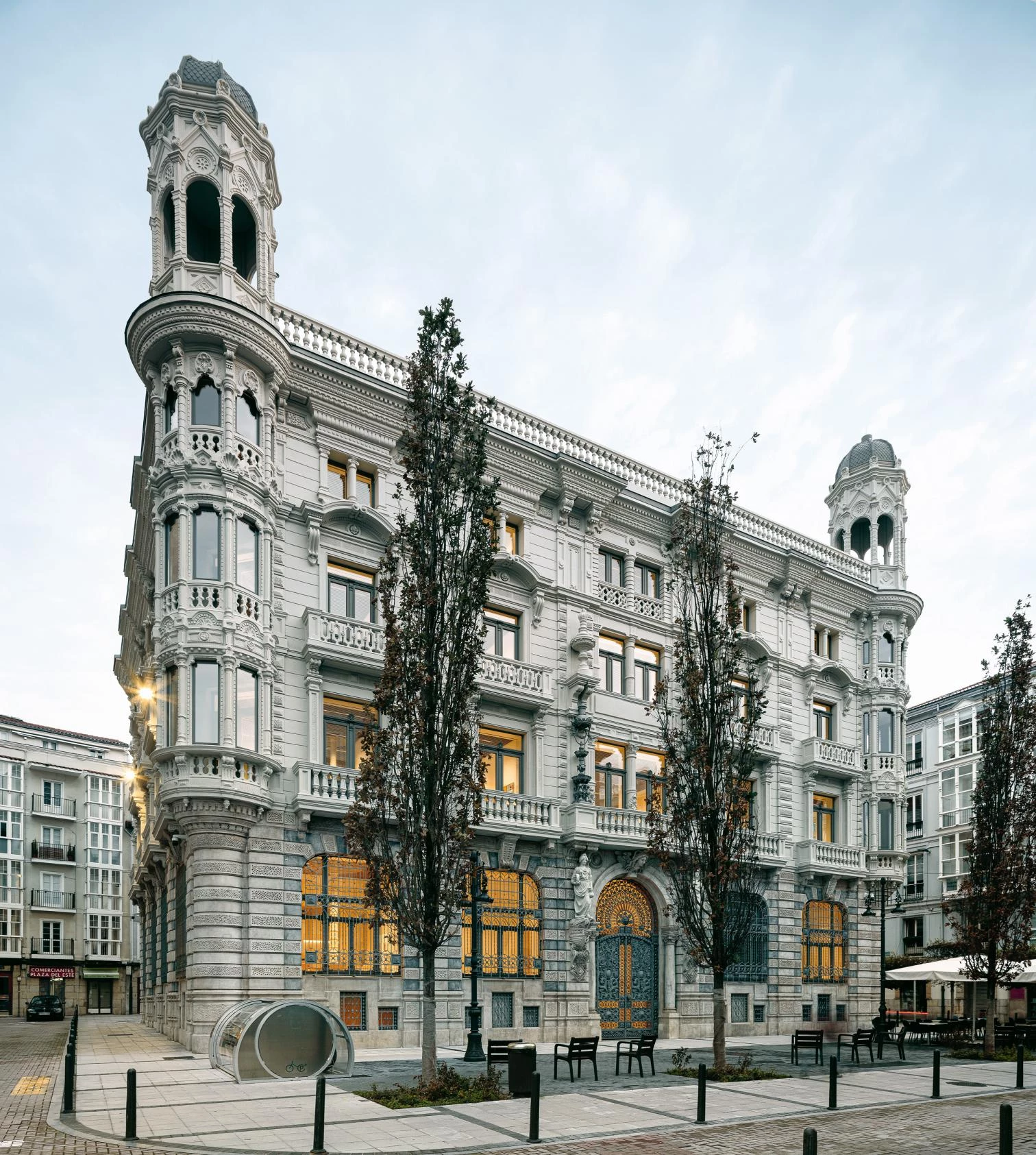 The former headquarters of Banco Mercantil takes up a whole urban block of Santander’s gridded expansion area. The building is a 1900 project by the architect Casimiro Pérez de la Riva (1851-1934). The building is horizontally divided into three parts: a semibasement floor with thick walls, for safety deposit boxes; the ground level, which housed the bank branch; and the three upper floors for apartments. The building is accessed from the north and the south; the bank branch was accessed from Plaza Morena, and the residences from Calle del Medio. Currently, all floors are for banking or office use. The original bank has undergone several transformations over time, but has maintained the clarity of its cast iron column structure around the courtyard.