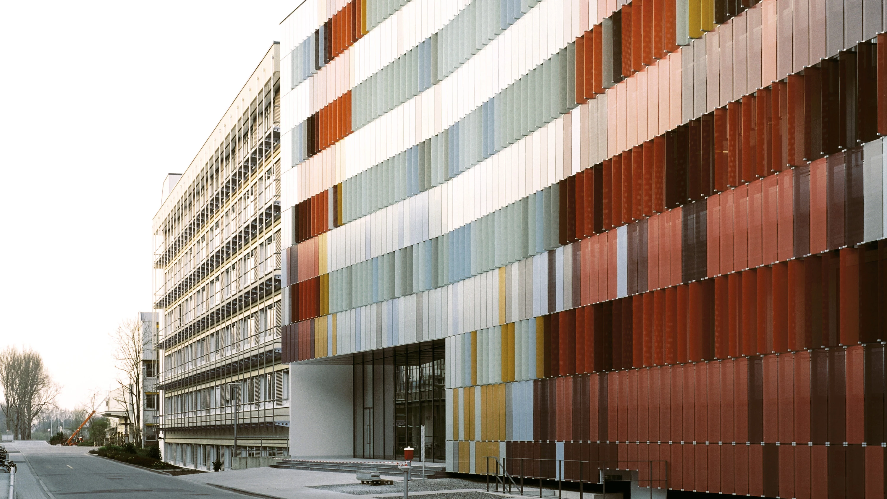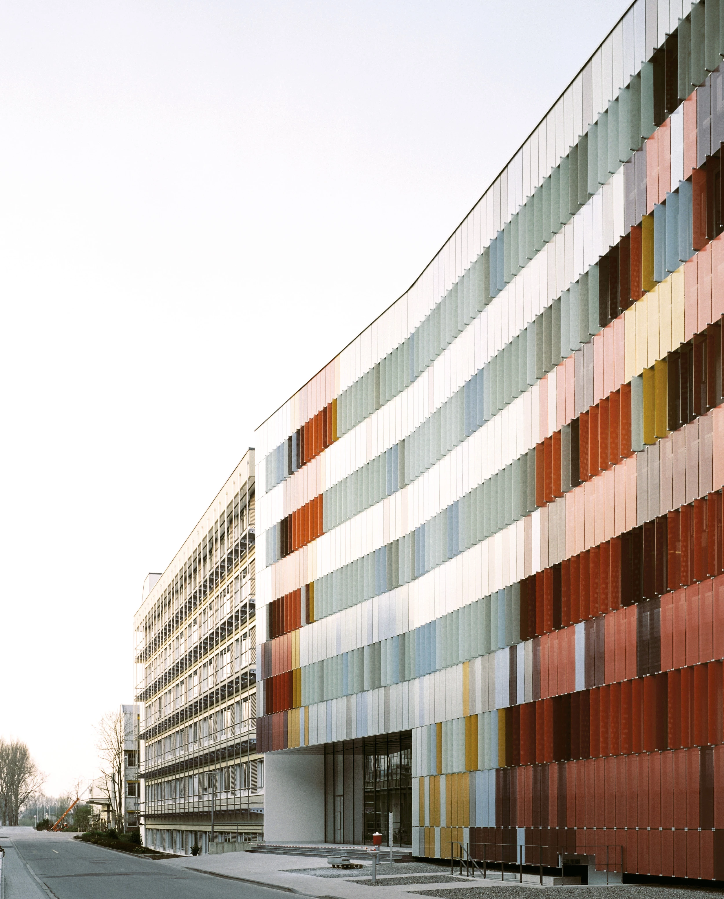 In the town of Biberach, in southwest Germany, the pharmaceutical company Boehringer Ingelheim has gradually taken up an industrial polygon on the outskirts of town with a anonimous complex of production laboratories and storage warehouses. In order to endow this factory – which has an important economic role in the community – with an identity of its own, the new building of offices and laboratories establishes itself between its functional neighbors with a striking facade that performs as a large billboard. The new construction continues the alignment and height of the adjacent buildings, but instead of merging into the dull architecture of its surroundings, it turns its skin into a manifesto in favor of color.