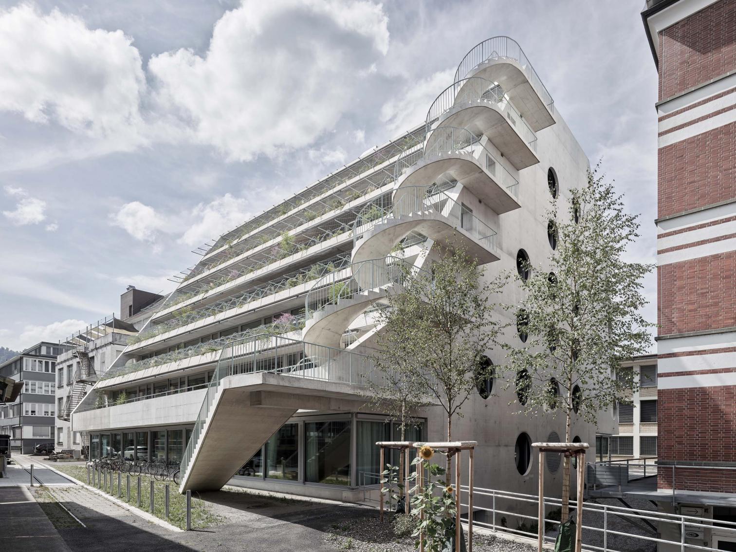 As for the materialization and building-services concept of the concrete building in a densely developed industrial district of Binz, the approach decided on was raw and simple, with vegetation playing a key role: plants do much for the building by serving as solar shields and effecting a microclimate around balconies and terraces.
