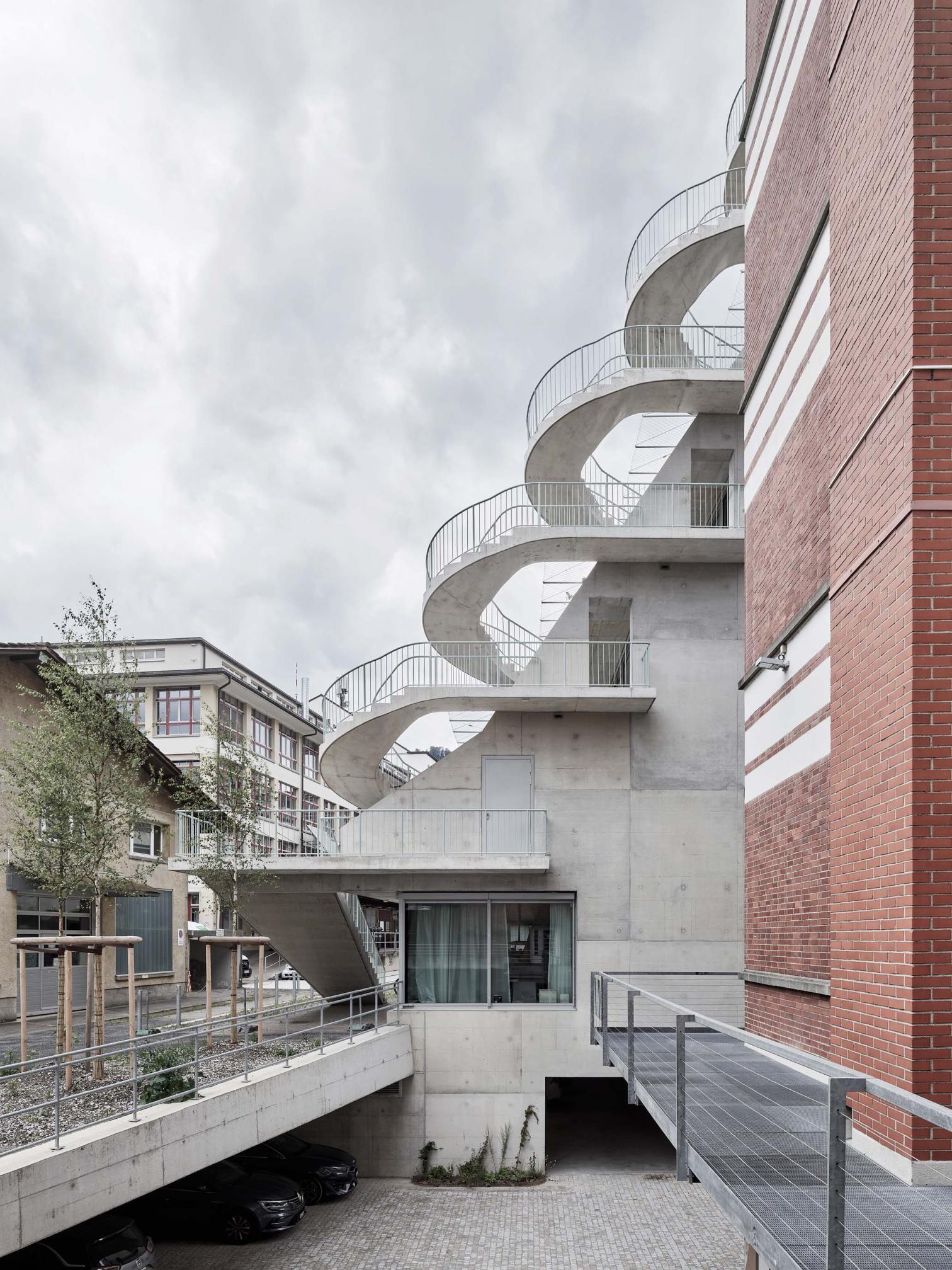With spaces of different sizes and heights, the commercial functions – including a restaurant – are placed between the ground and second floors, while offices go on the third and sixth. The rental apartments take up the upper levels and have semi-covered balconies that can be accessed directly on the north facade. A system of exterior staircases connects the terraces on the south facade, reachable from the central courtyard. This stair route not only enriches the building’s aesthetic but also encourages interaction and communication among tenants.