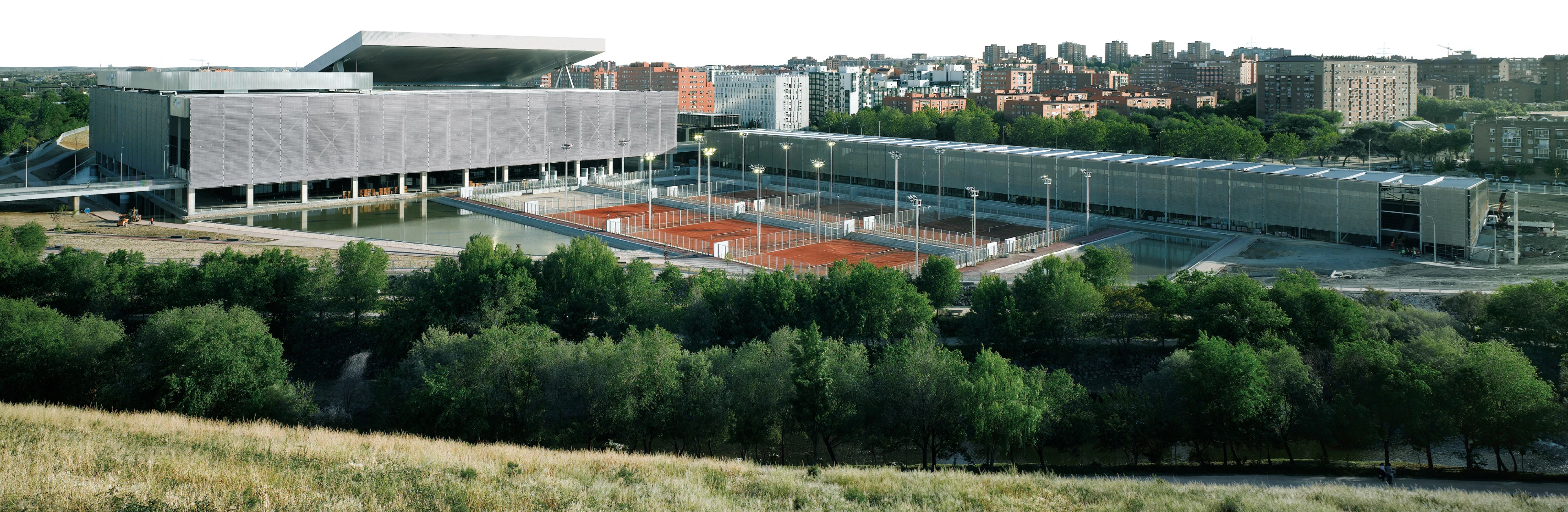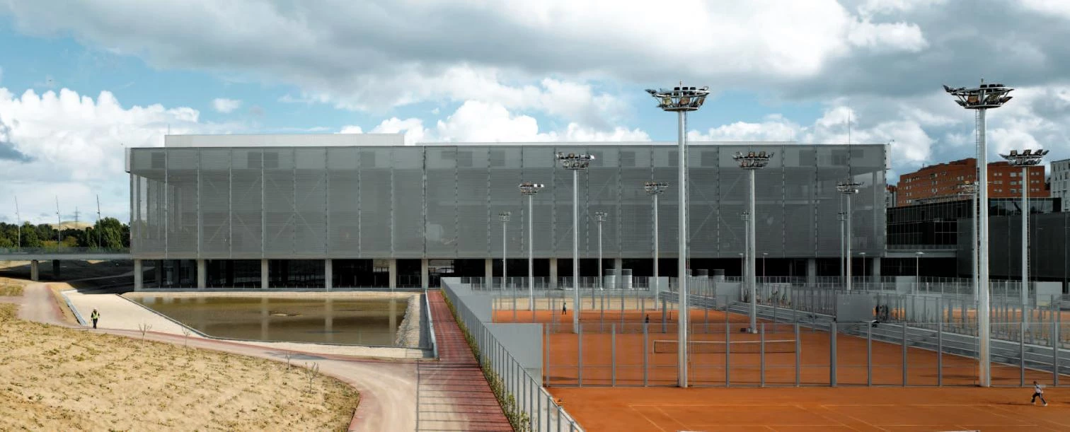 The Olympic Tennis Center, also known as the ‘Magic Box’, goes up on the banks of the Manzanares River, in a space tucked between large infrastructures that this sports facility wishes to revitalize.