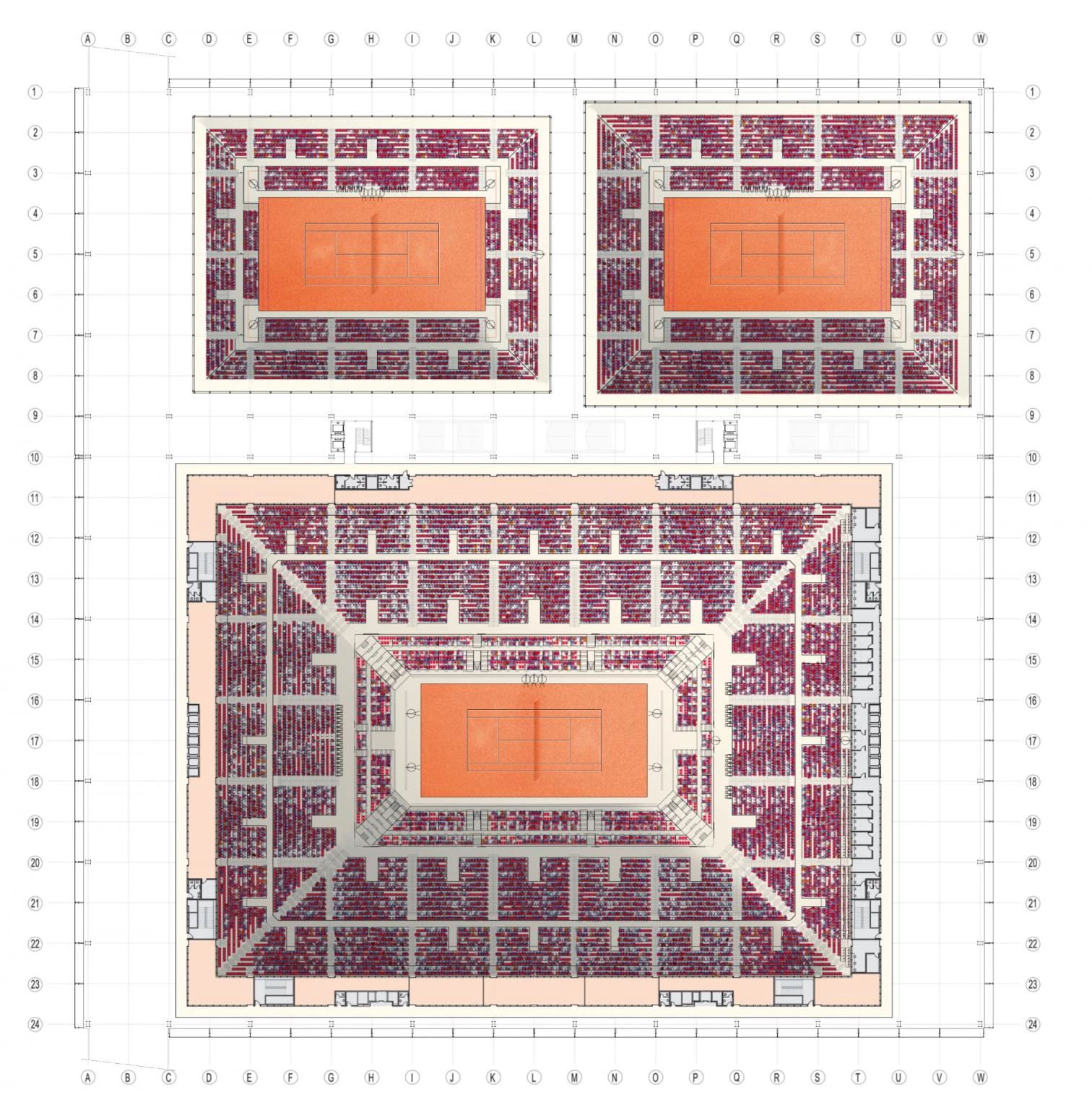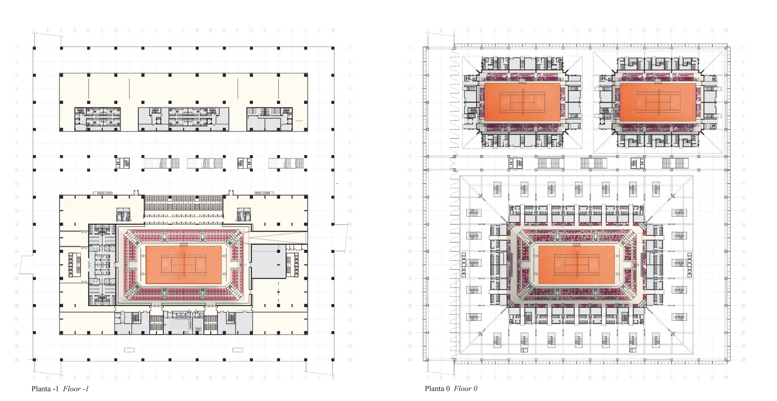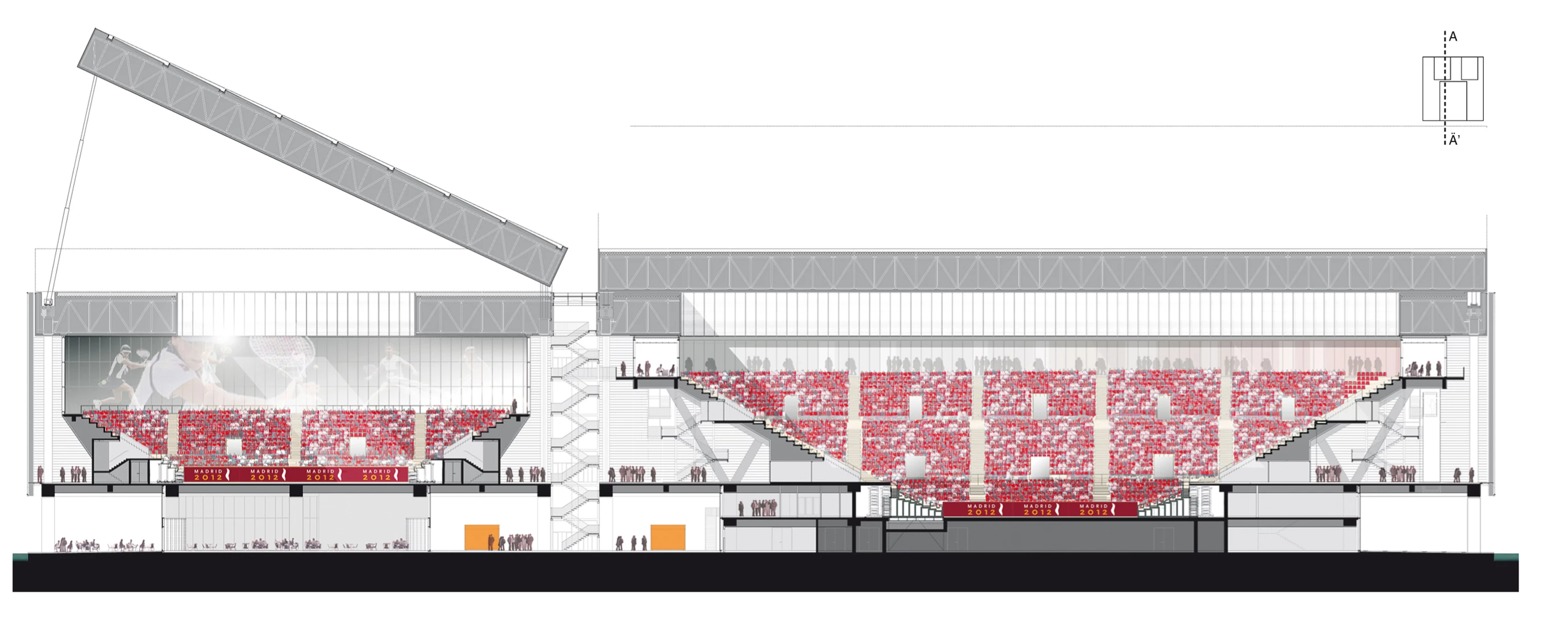 The three tennis arenas, placed inside this ‘magic box’, are adapted to the different uses of the complex. Their roofs are equipped with a double system of mobile panels mounted on hydraulic jacks for rotation and displacement, thus transforming the closed interior space into an open outdoor one. These movements on the scale of the immense structure throw a giant living shadow onto the landscape. The main building gives the impression of turning round to look back at its surroundings. At the same time, the open roofs, of metal finish, act as a mirror that invites the exterior inside, and vice versa.