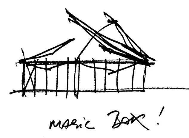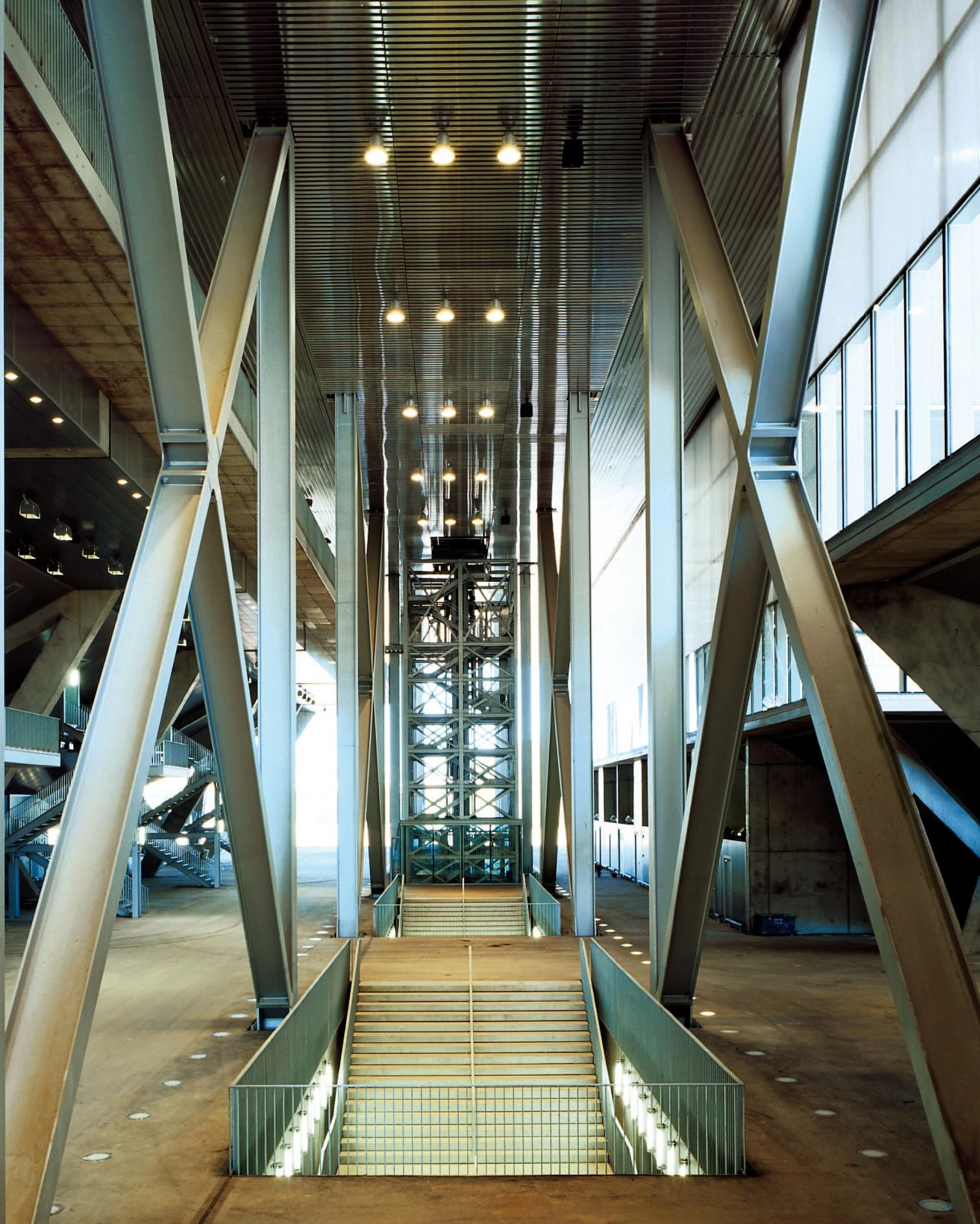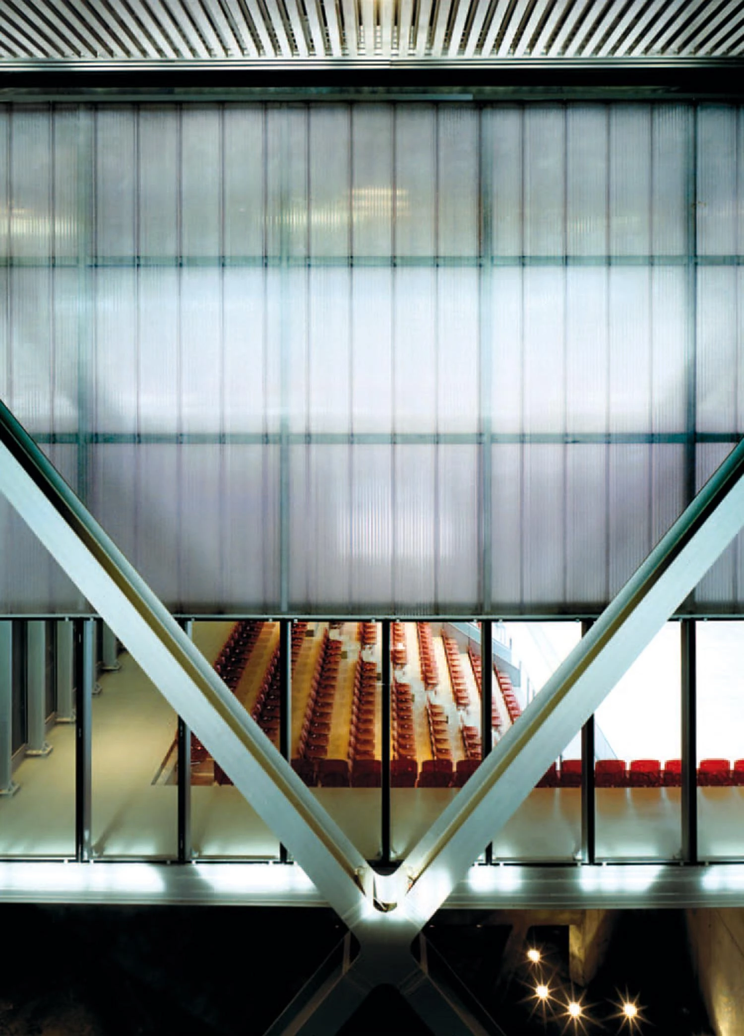 The three tennis arenas, placed inside this ‘magic box’, are adapted to the different uses of the complex. Their roofs are equipped with a double system of mobile panels mounted on hydraulic jacks for rotation and displacement, thus transforming the closed interior space into an open outdoor one. These movements on the scale of the immense structure throw a giant living shadow onto the landscape. The main building gives the impression of turning round to look back at its surroundings. At the same time, the open roofs, of metal finish, act as a mirror that invites the exterior inside, and vice versa.