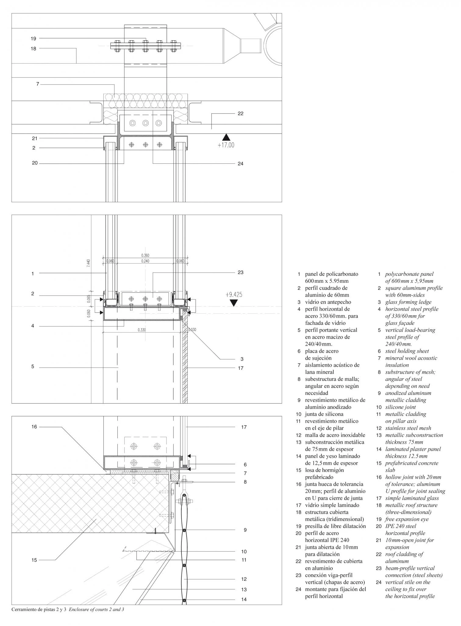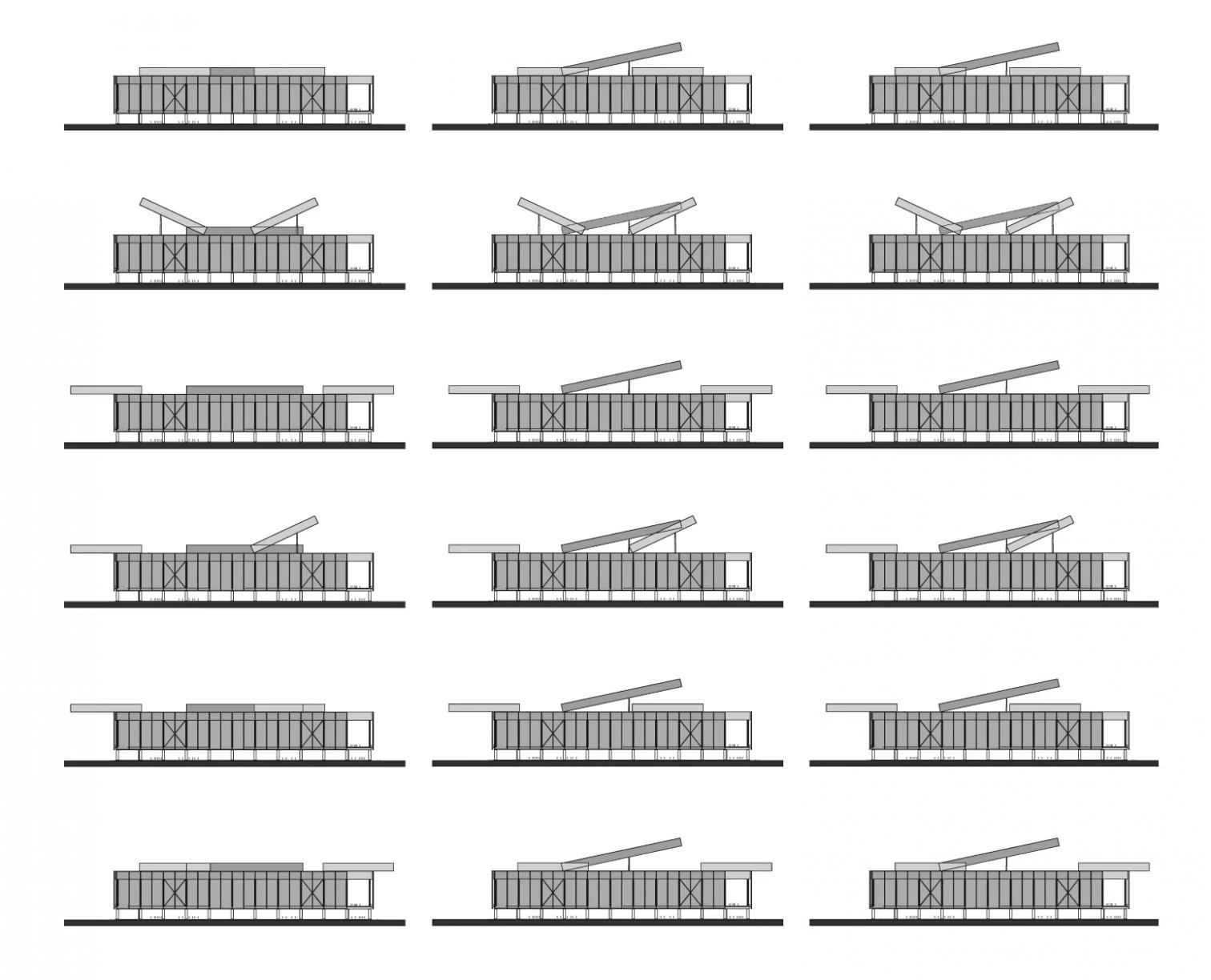 The roof of the main court can rotate a maximum of twelve degrees and then move from this position. The other two smaller ones reach up to twenty-five degrees, but must remain horizontal when they slide.