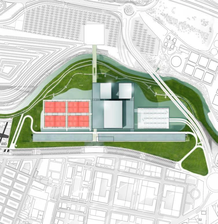 The built areas are organized around an artificial lake, over which volumes of varying sizes are scattered like islands or fragments of nature beckoning strollers. A system of footbridges opens numerous paths through these volumes, offering spectacular new perspectives. Through this landscaping mechanism the project establishes the superposition of two specific worlds: at level with the lake a reserved seating area (for players, VIP?visitors, journalists); on the water, the general public in a space that favors interaction, circulation and connection with the city.