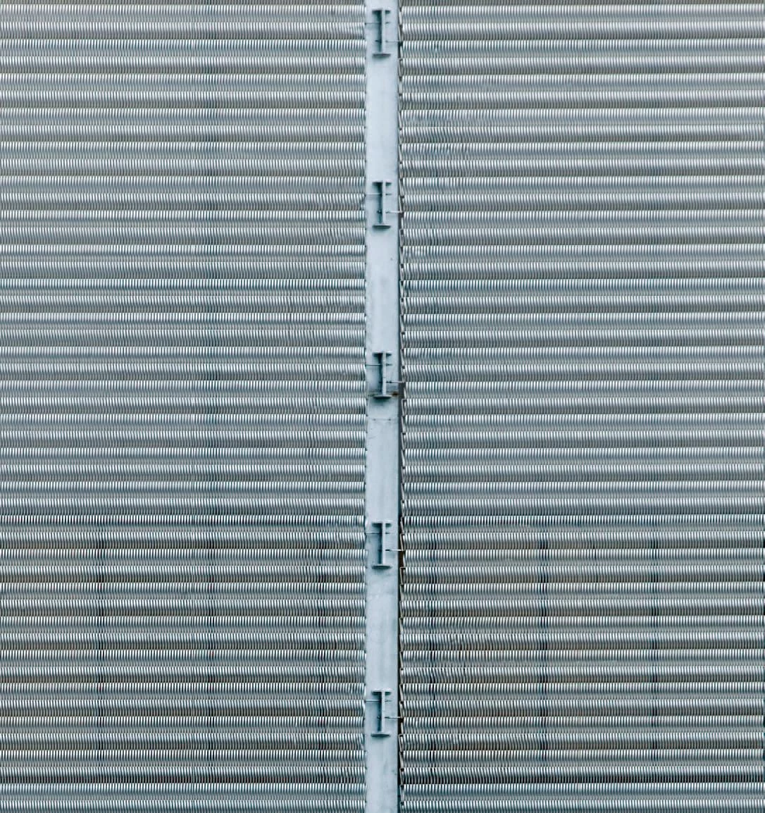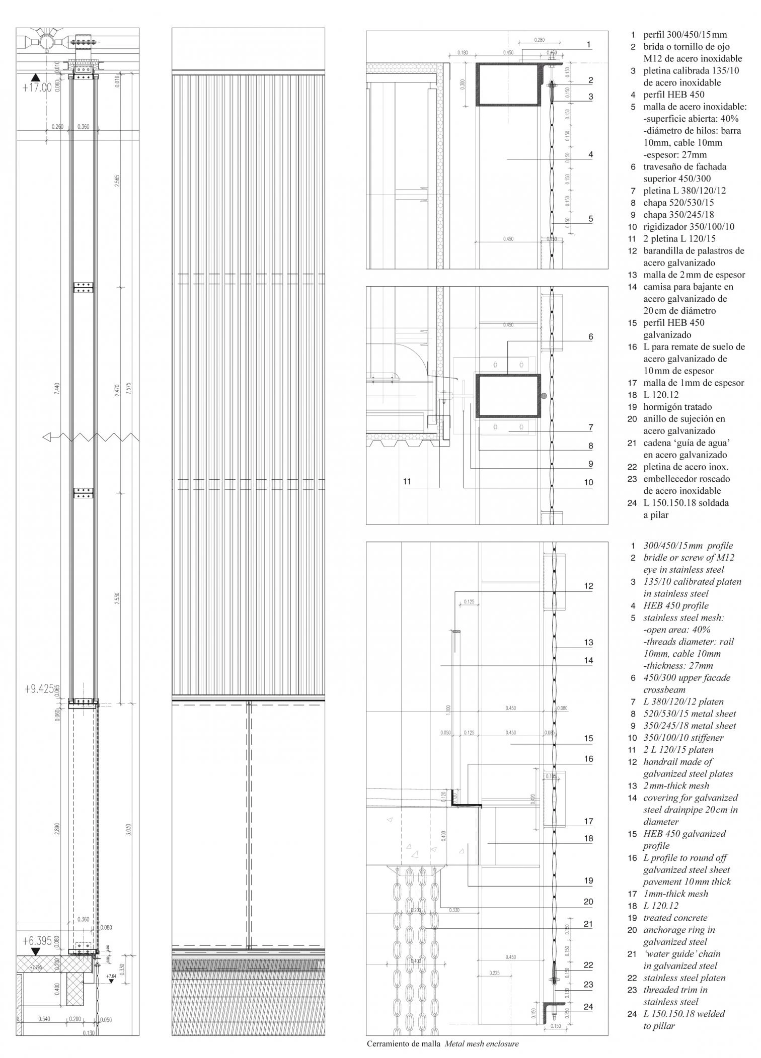 The complex is protected by a mutating and unitary skin that changes with light; a protecting metal mesh gown that hangs from the upper slab of this large volume, and that at night acts as a translucent veil, filtering the views of the interior.