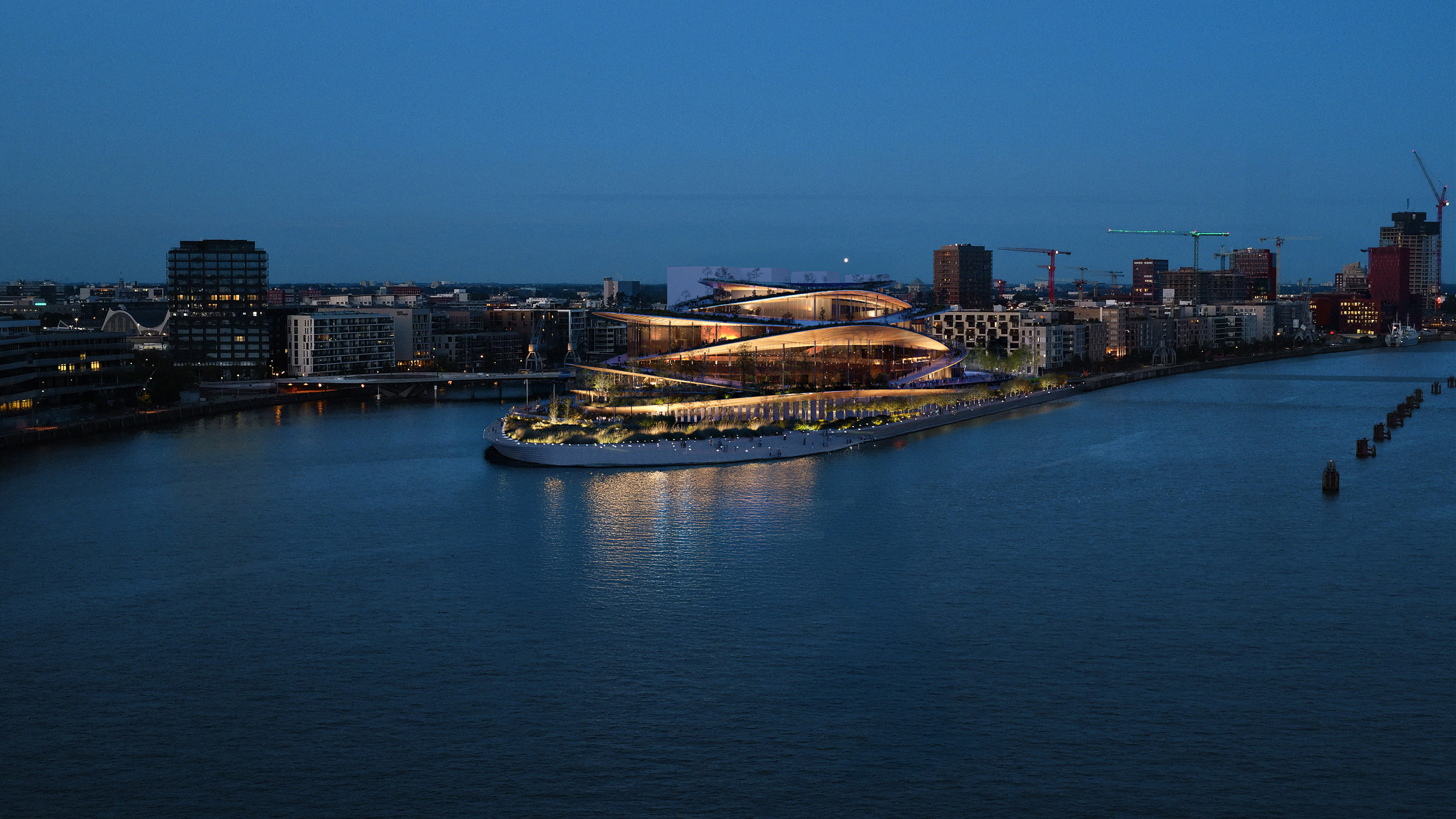 The project proposes a strong connection between culture and port life on the banks of the Elbe, similar to Herzog & de Meuron's nearby Elbphilharmonie. The new opera house is configured as a landscape of terraces, evoking sound waves expanding from a core towards the port. Inside, a large foyer welcomes visitors, who are guided by two wooden staircases that articulate the route, with the main levels having direct access to outdoor terraces.