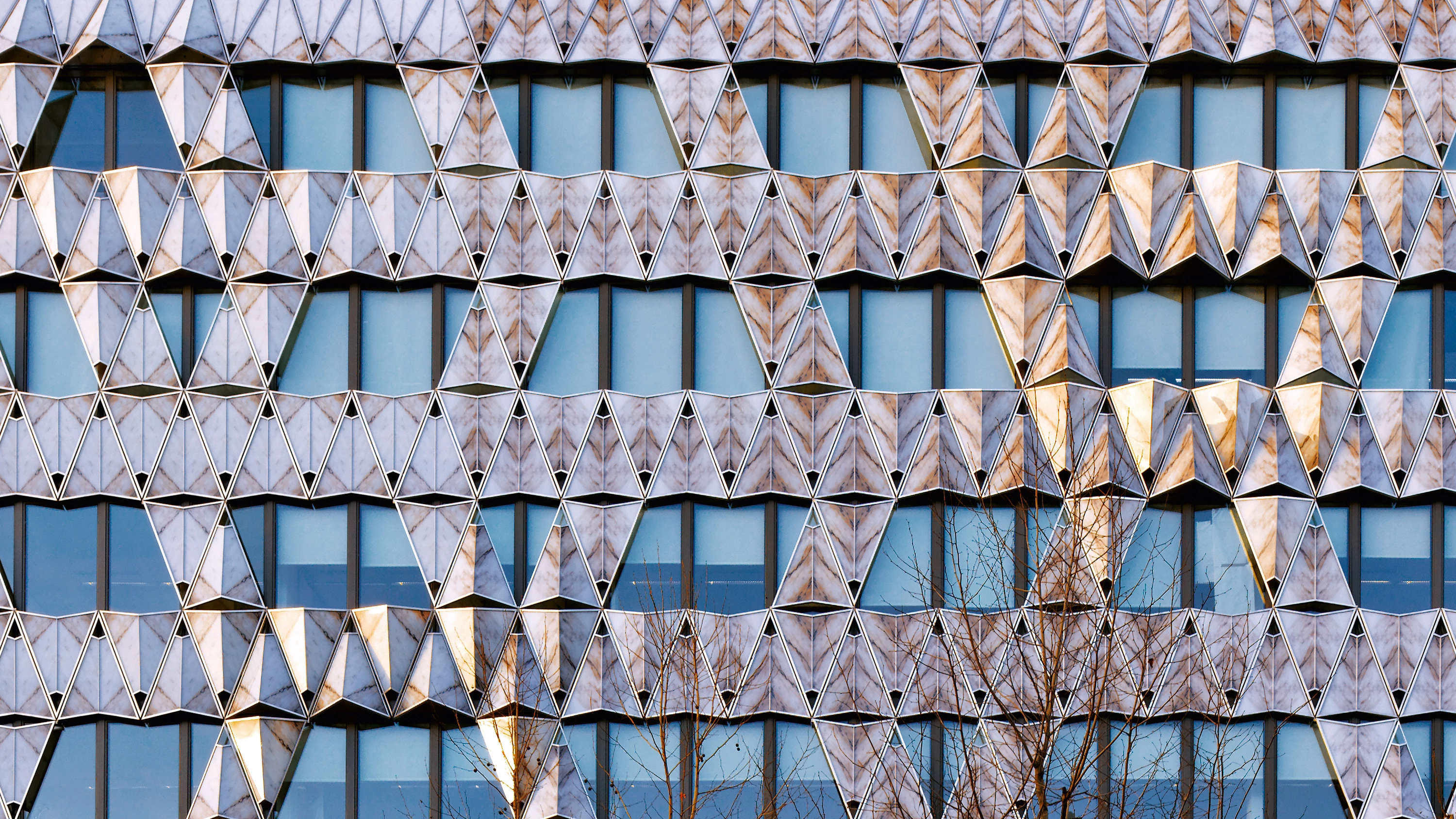 Close to the Arch of Triumph, in one of the most luxurious neighborhoods of Paris, stands this banking office building, occupying a parcel that opens in two directions. The main side looks toward Avenue de Friedland, the rear towards a garden courtyard, and this distinction determines the opposite characters of the two facades: simpler inward, at the back, and more representative outward, at the front. With its 30-meter development on plan, the main facade is formed by a double envelope. The inner layer of the skin is a conventional curtain wall with aluminum profiles, and the outer one is much more complex and intricate, presenting a three-dimensional lattice of more or less triangular pieces arranged in the manner of the folds of an origami.