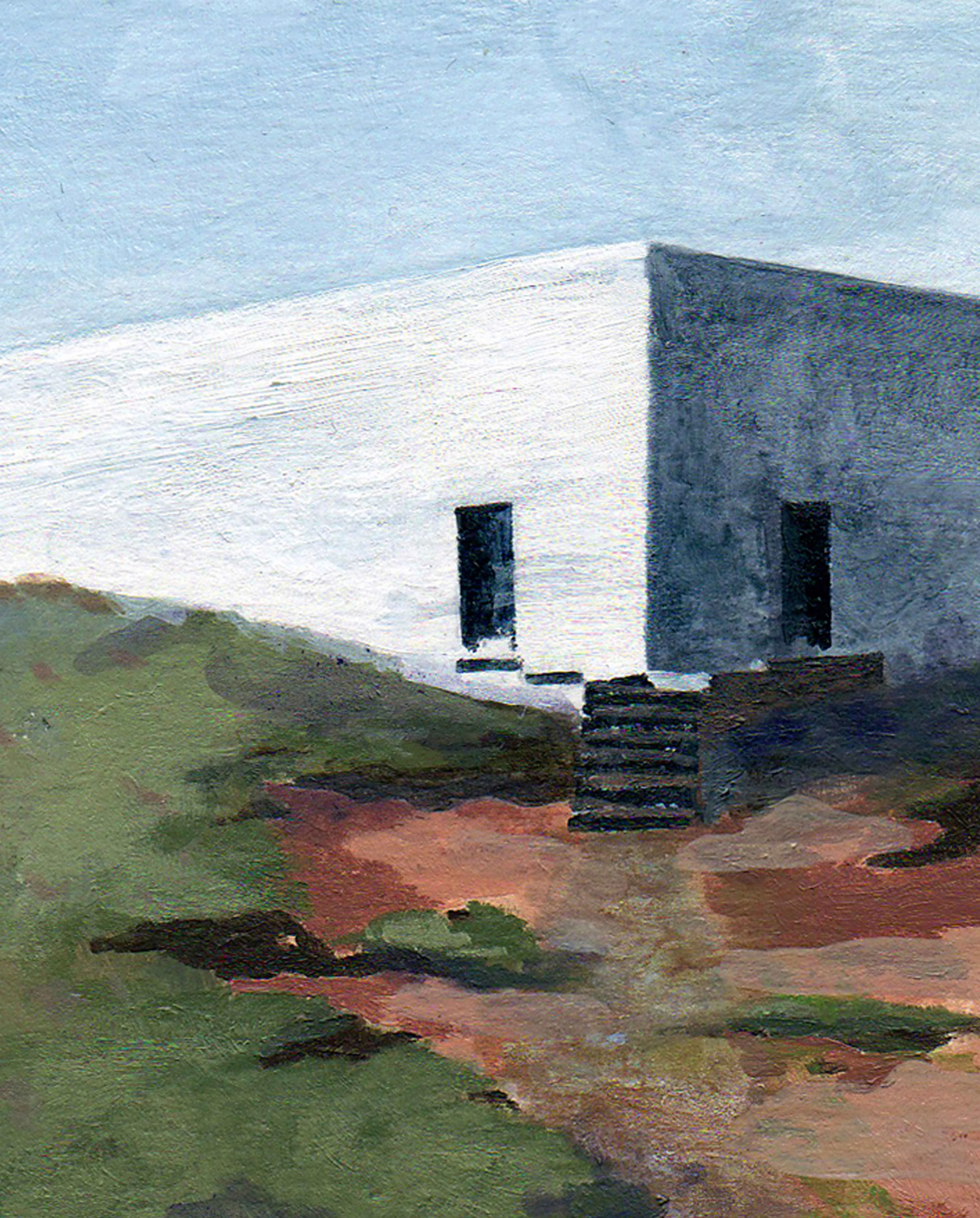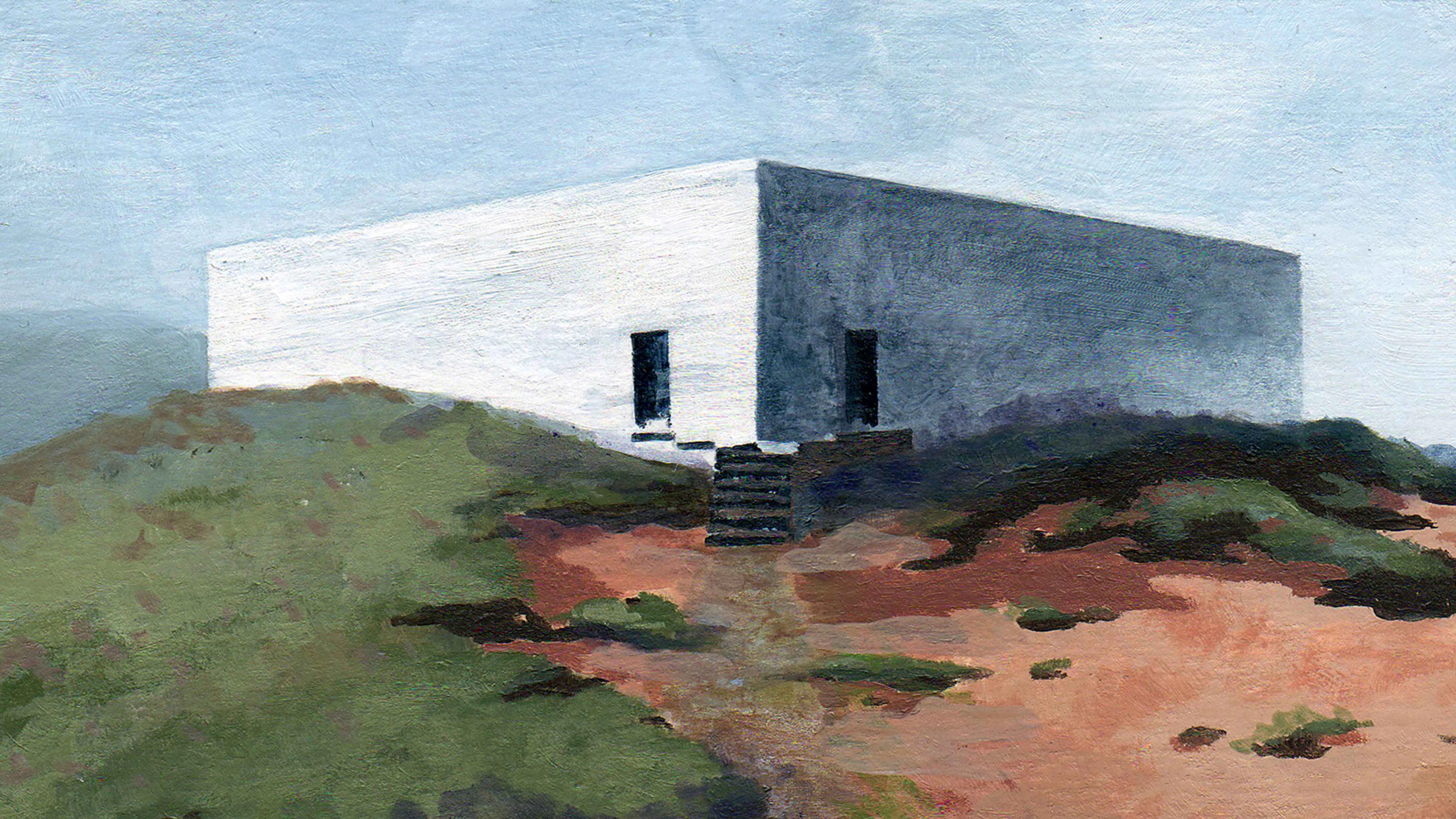 The pavilion is close to the ruins of an old lighthouse, with direct access from the only road that connects the island’s north and south villages. Its position on the hill dilutes the reference to the cardinal axes, so as to avoid the conflictive distinction between the two ‘sides’ of the local community. A gentle slope falling west touches a horizontal piece in two corners. This uneven ground defines a double access to a raised podium. The diagonal approach to the pavilion establishes a circuit with the ruins as a background. Given the extreme wind, the horizontal format is meant to enclose a protected court, surrounded by two L-shaped multipurpose gallery rooms that can be extended to the central courtyard by sliding glass and steel panels. The access corners are symmetrically divided by a punctual opening in the ceiling. In the other two interior corners the opening is aligned with the perimeter wall. The entire construction is a monolithic concrete structure; it will be an ageless grey presence in a picturesque green field. This inner world of the pavilion, the first ‘useless utility’ place for the island, can be understood as a literal and phenomenal island within an island; a voluntary form of alienation, both hope and absence for its modest residents.