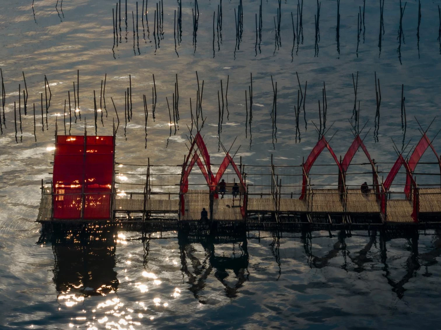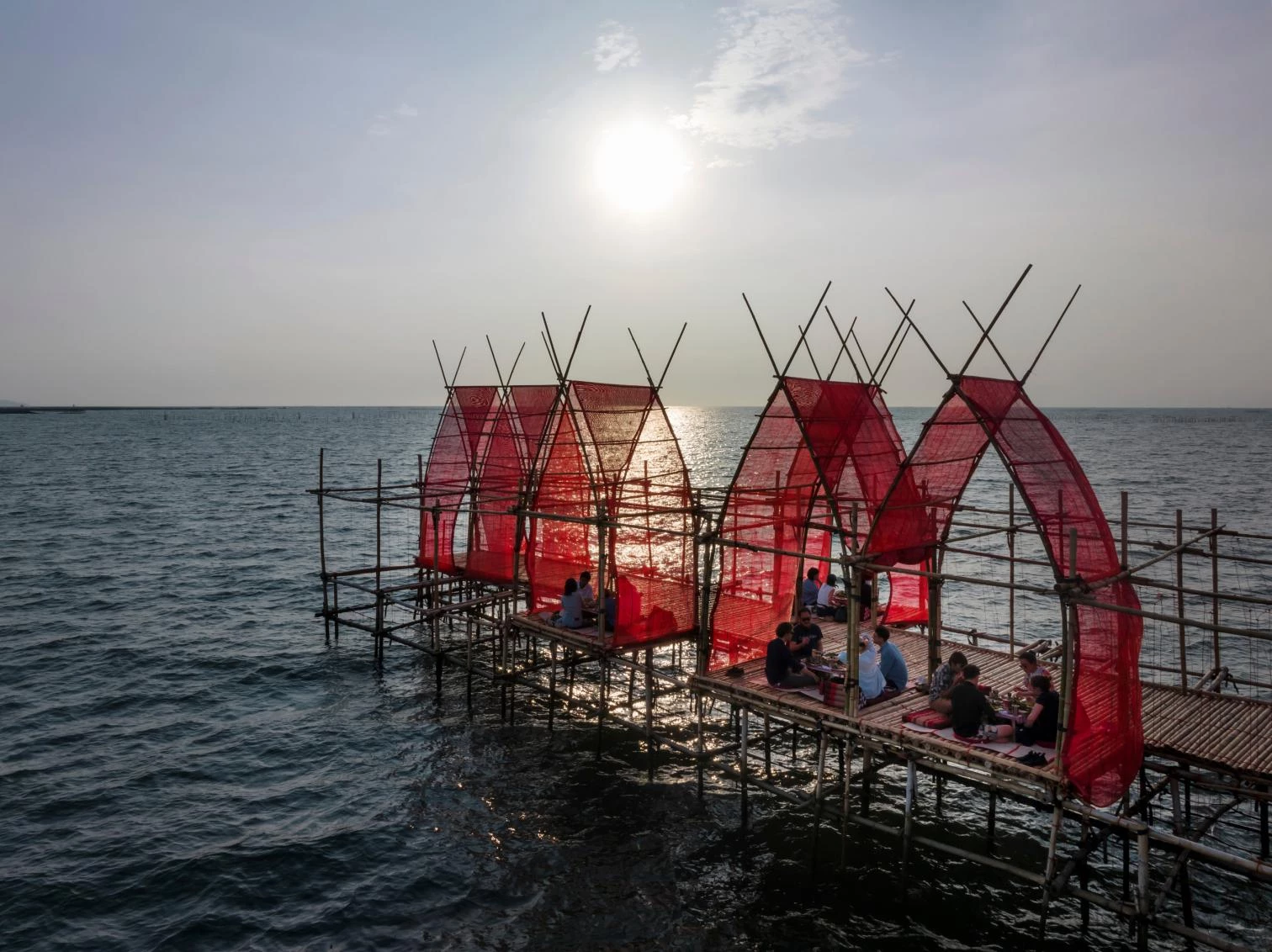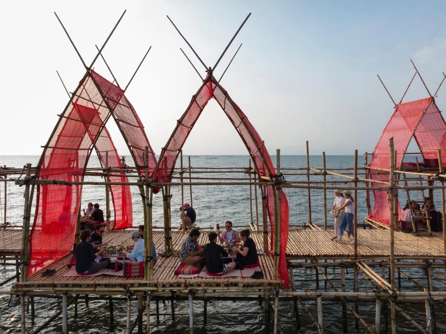 Located off the coast of the Angsila fishing village, in Chonburi Province, Thailand, this prototype designed to boost ecotourism draws on the bamboo scaffolding traditionally used for oyster cultivation. The local fishermen bring people visiting Angsila to this pavilion for the experience of tasting truly fresh oysters, a sea-to-table gastronomic adventure in a remarkable setting. The structure was built by Angsila fishermen themselves through vernacular techniques of building with bamboo in shallow water, driving each bamboo column into the ocean floor.