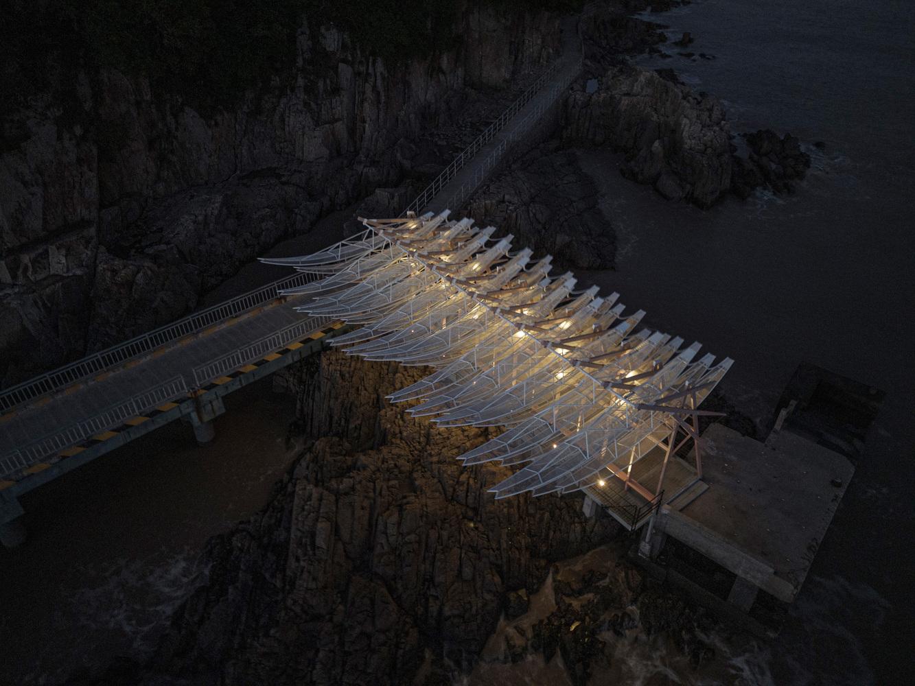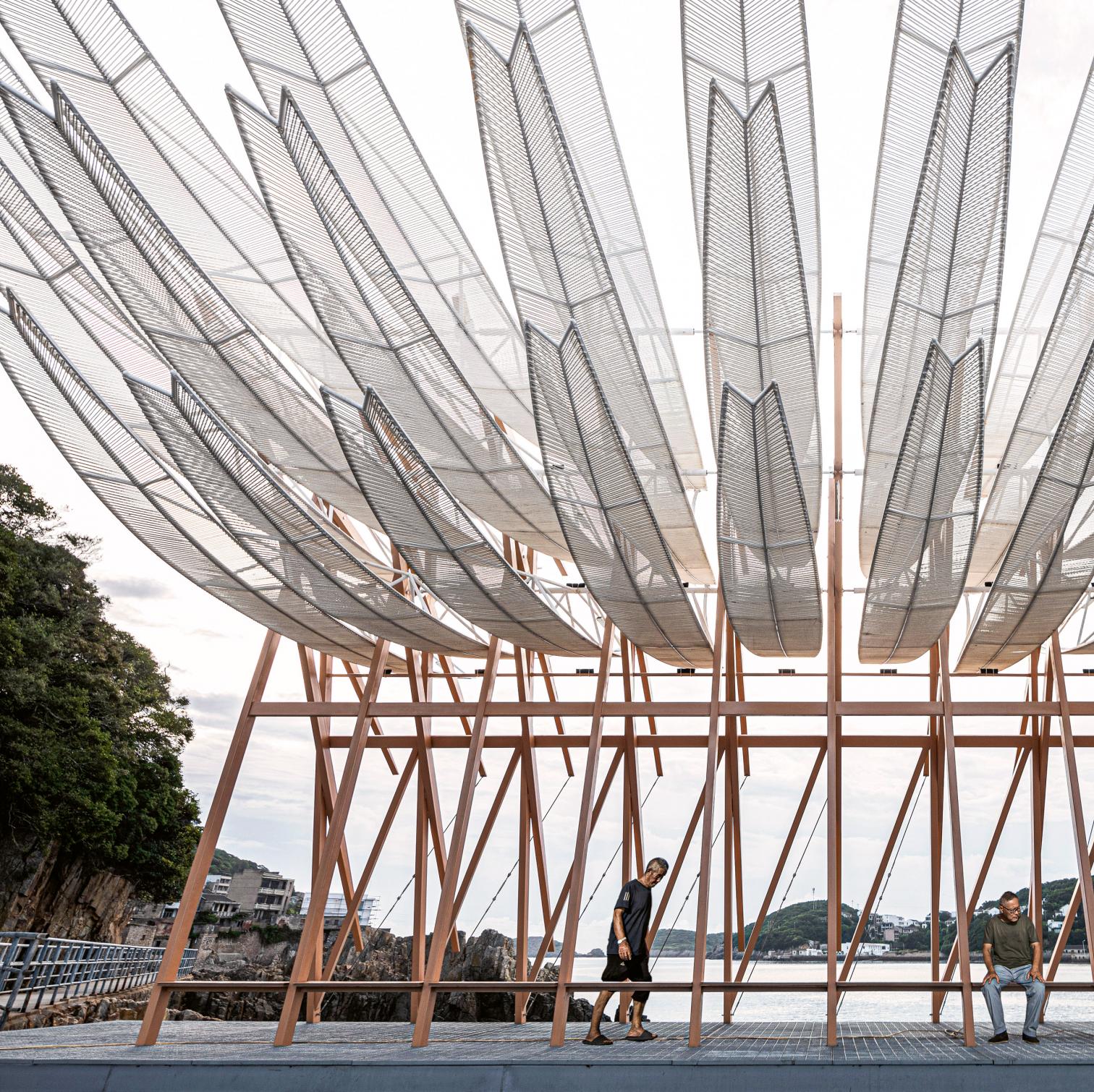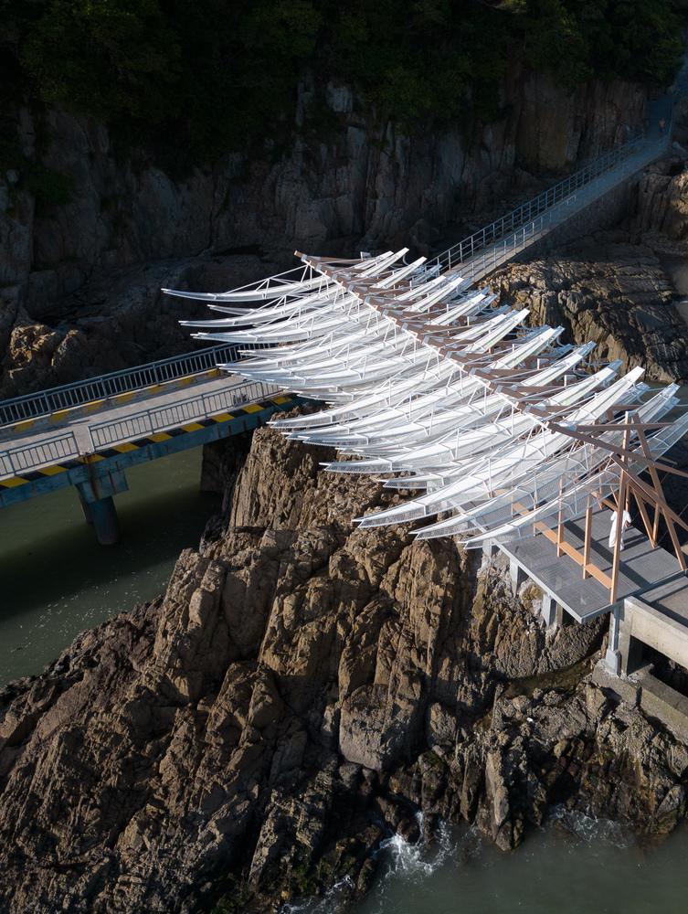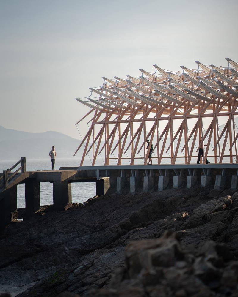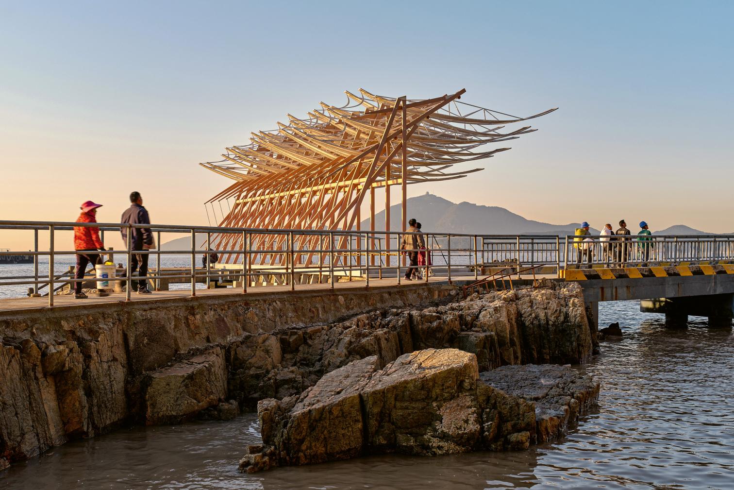 The elderly of Chaishan Island still fondly remember that its rugged coast – now only visited by the occasional ferry – was up to not long ago a thriving port, where arriving sailors were welcomed under the trees that stood at the entrance into the village. To save this image for posterity, the renovation of a defunct cargo pier has included installing a marquee with the skeletal anatomy of Theo Jansen’s kinetic ‘strandbeests,’ in which a wing of sorts flutters as it shades a lookout platform. Held up by a framework of galvanized steel treated to resist the saline atmosphere, and raised over a floor of railings that give a view of the pavilion’s anchorage to the rocks below, the roof is formed by thirty-six plastic ‘feathers’ reinforced with fiberglass, lightweight blades providing protection against ultraviolet radiation. Thanks to a system of counterweights and hinges, the mechanism is flexible, swaying gently in the sea breeze but having sufficient strength to withstand the inevitable storm, perhaps like a symbol of the headstrong memory that refuses to be blown away by the gales of time.